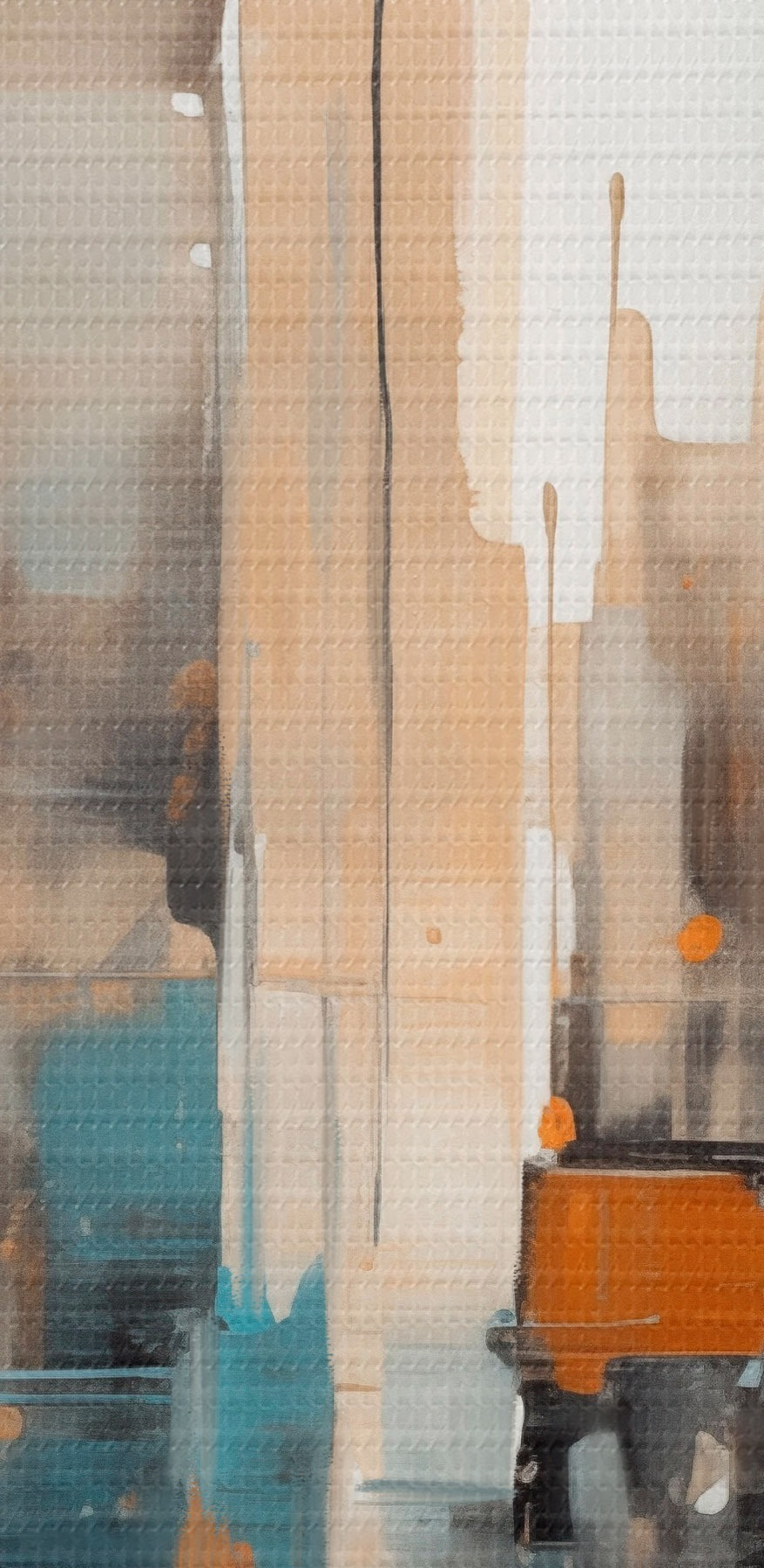 Runde Wandbilder Abstrakte Stadtlandschaft mit orangefarbenen, blaugrünen und braunen vertikalen Pinselstrichen und geometrischen Formen Nr r46266