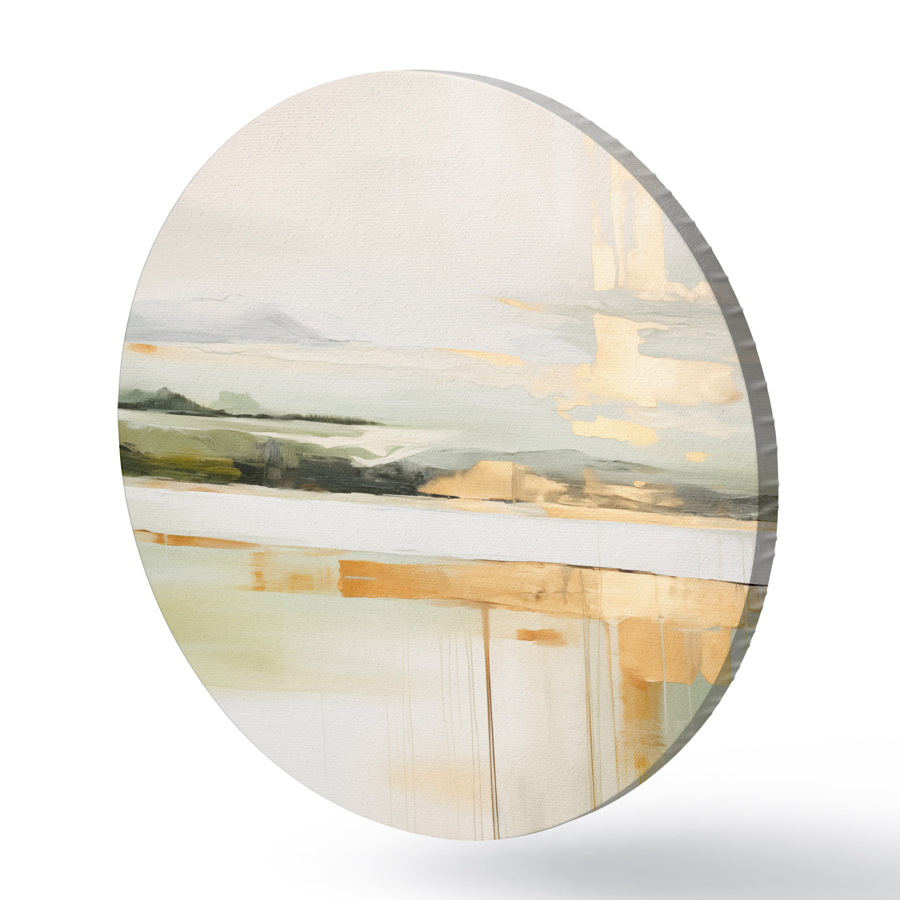 Runde Wandbilder Abstrakte Landschaft mit gelben Akzenten, eine minimalistische Komposition aus Land, Wasser und Himmel, mit gedämpften Farben r46268