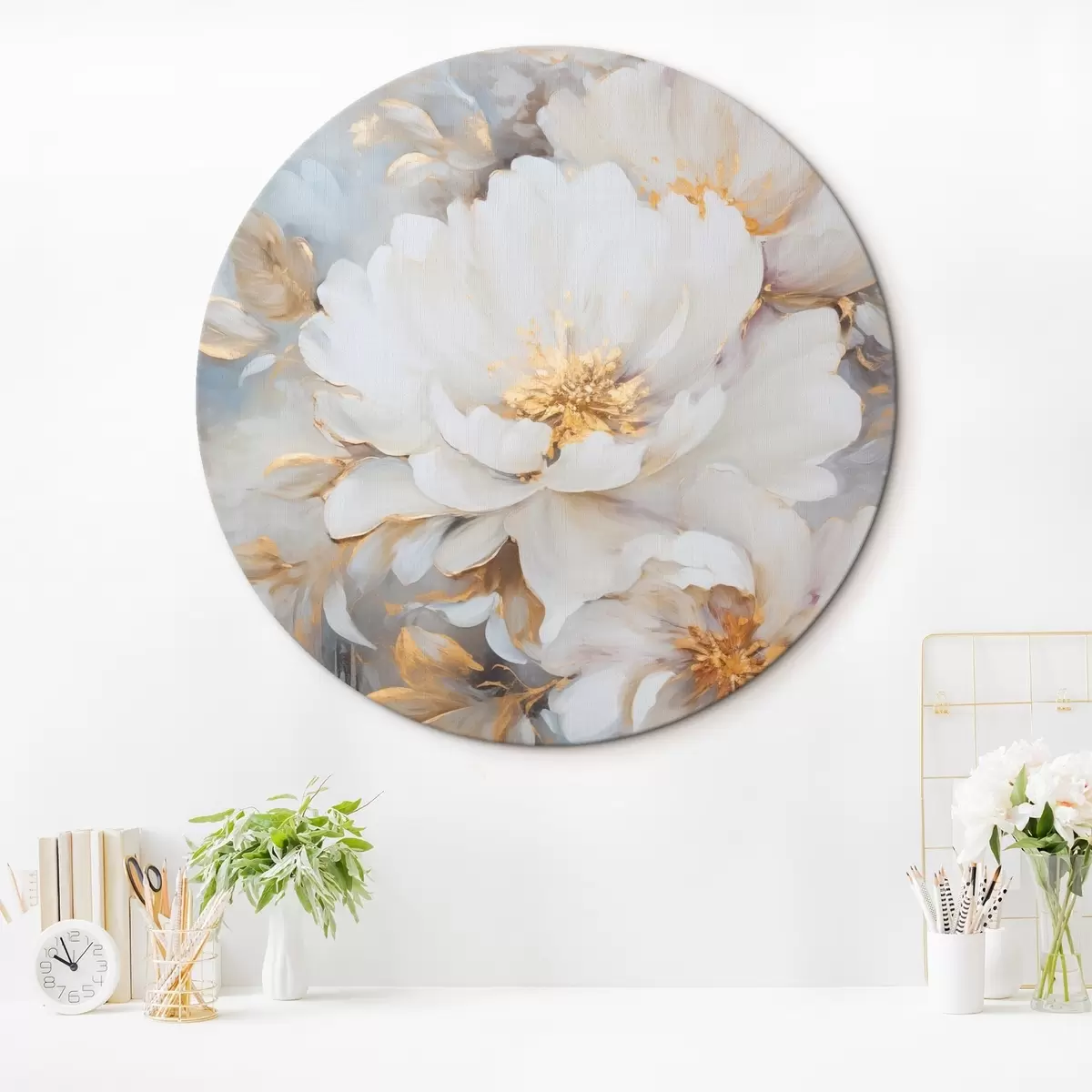 Runde Wandbilder Weiße Pfingstrosen mit blauen Blütenkernen und Blättern, sanfte Pinselstriche, hellblauer Hintergrund, Blumenarrangement r46271