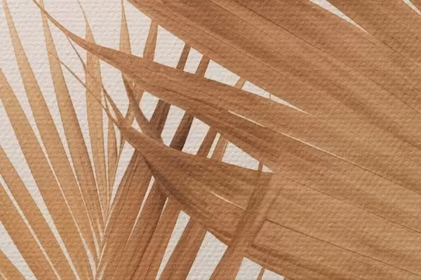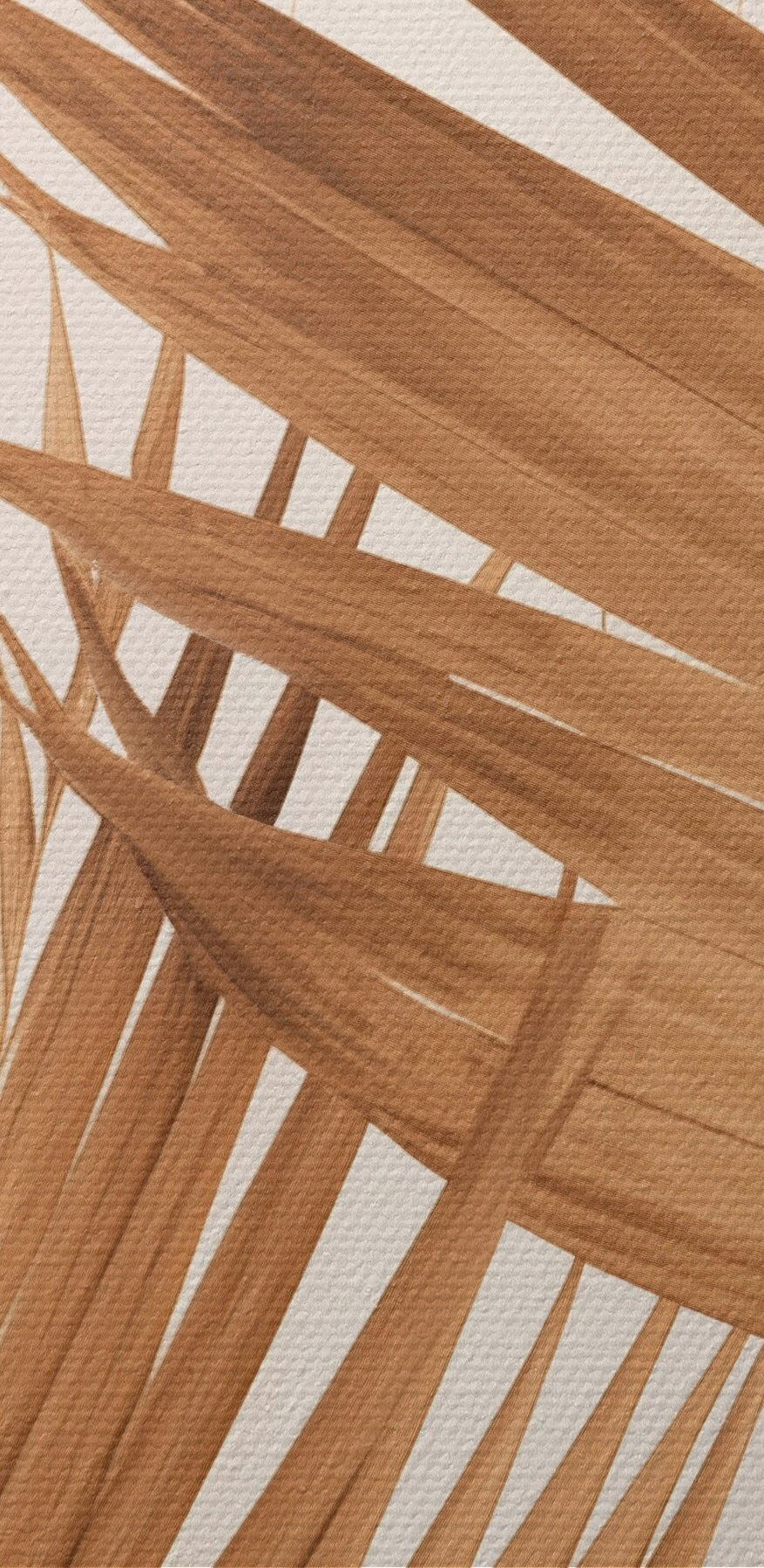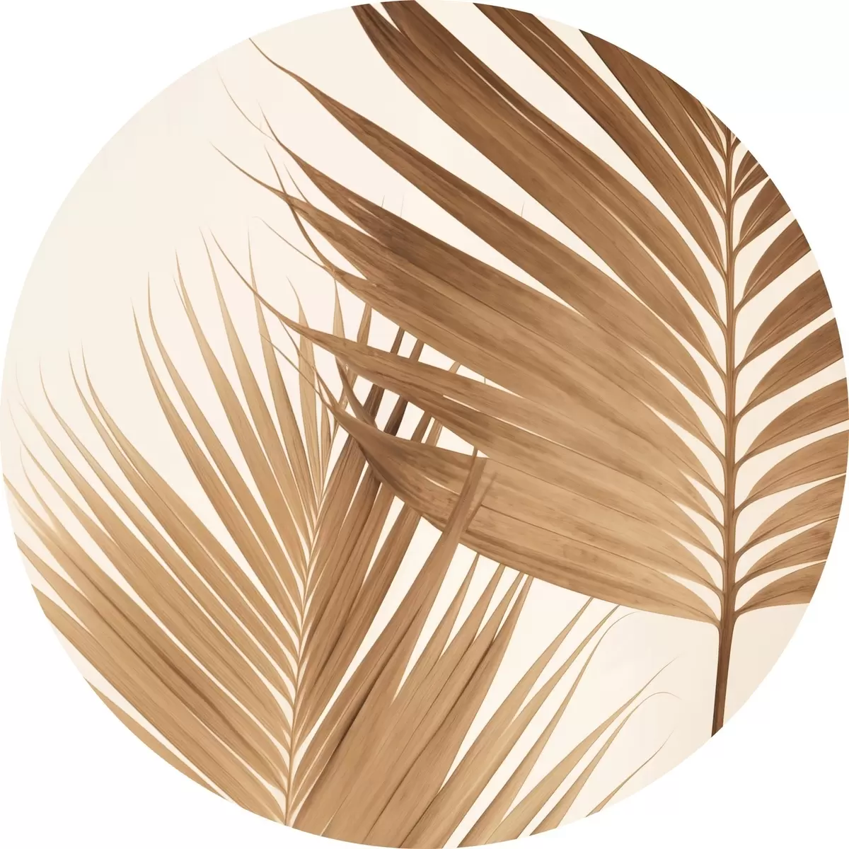 Runde Wandbilder Palmenblätter in Brauntönen, neutraler Hintergrund, minimalistischer Stil, natürliche Beleuchtung, tropisches Flair r46274