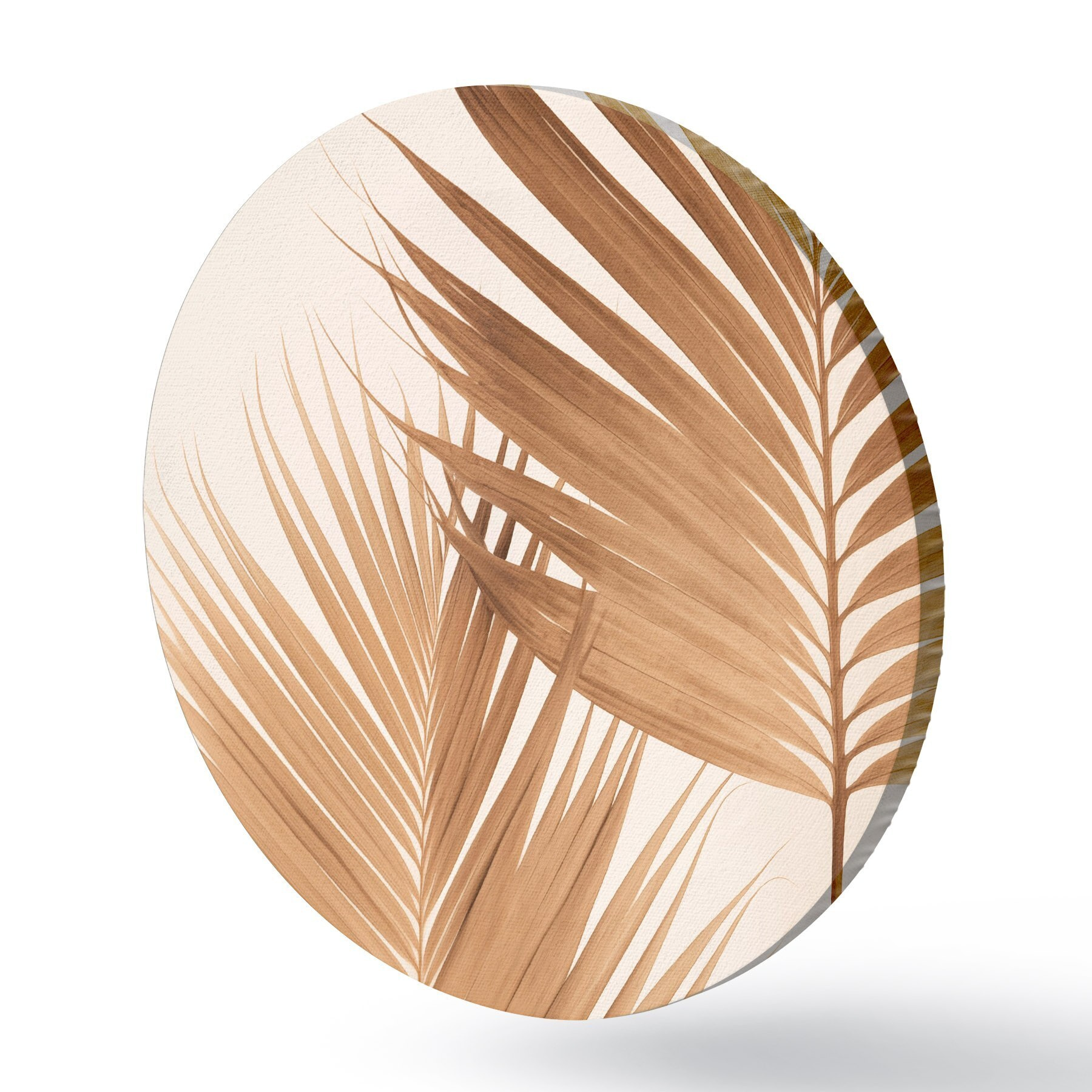 Runde Wandbilder Palmenblätter in Brauntönen, neutraler Hintergrund, minimalistischer Stil, natürliche Beleuchtung, tropisches Flair Nr r46274