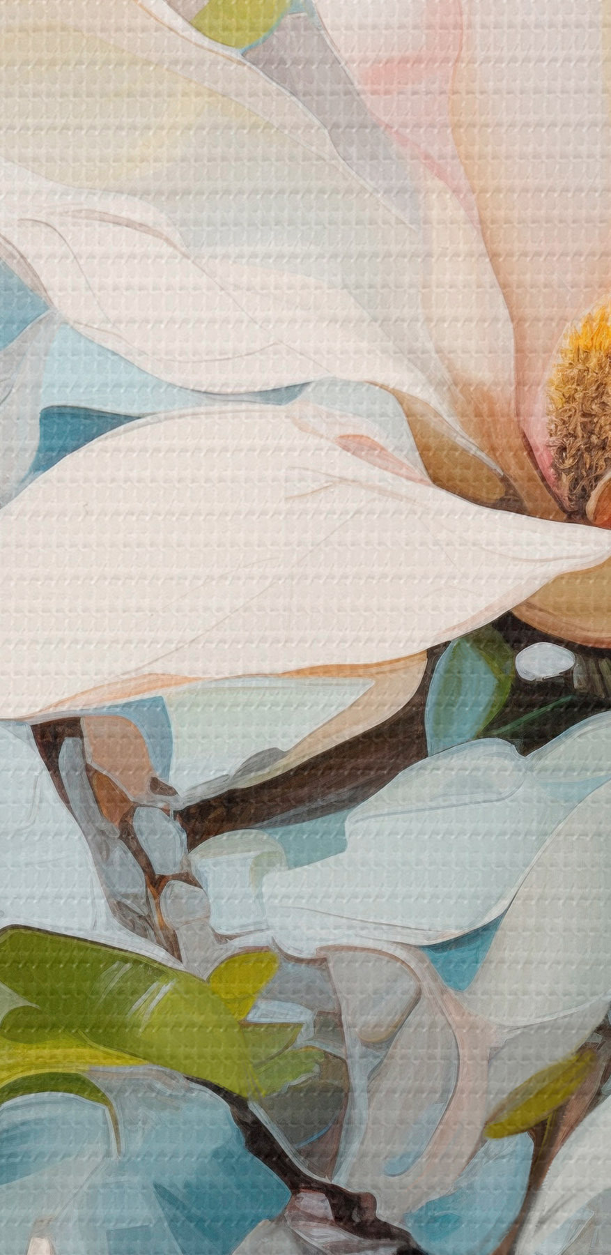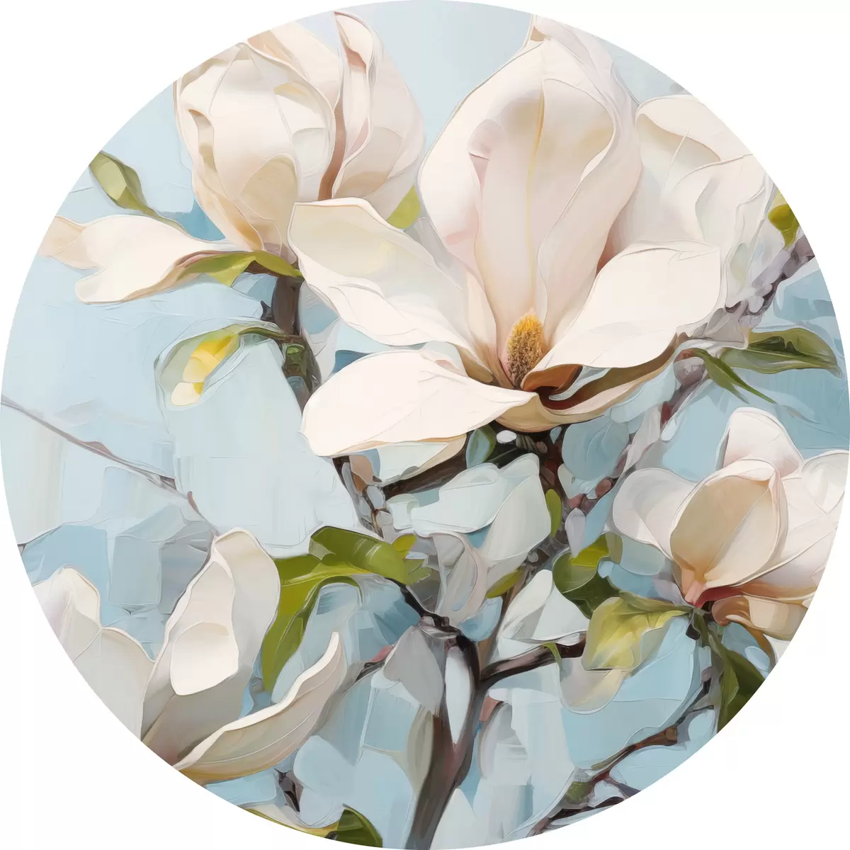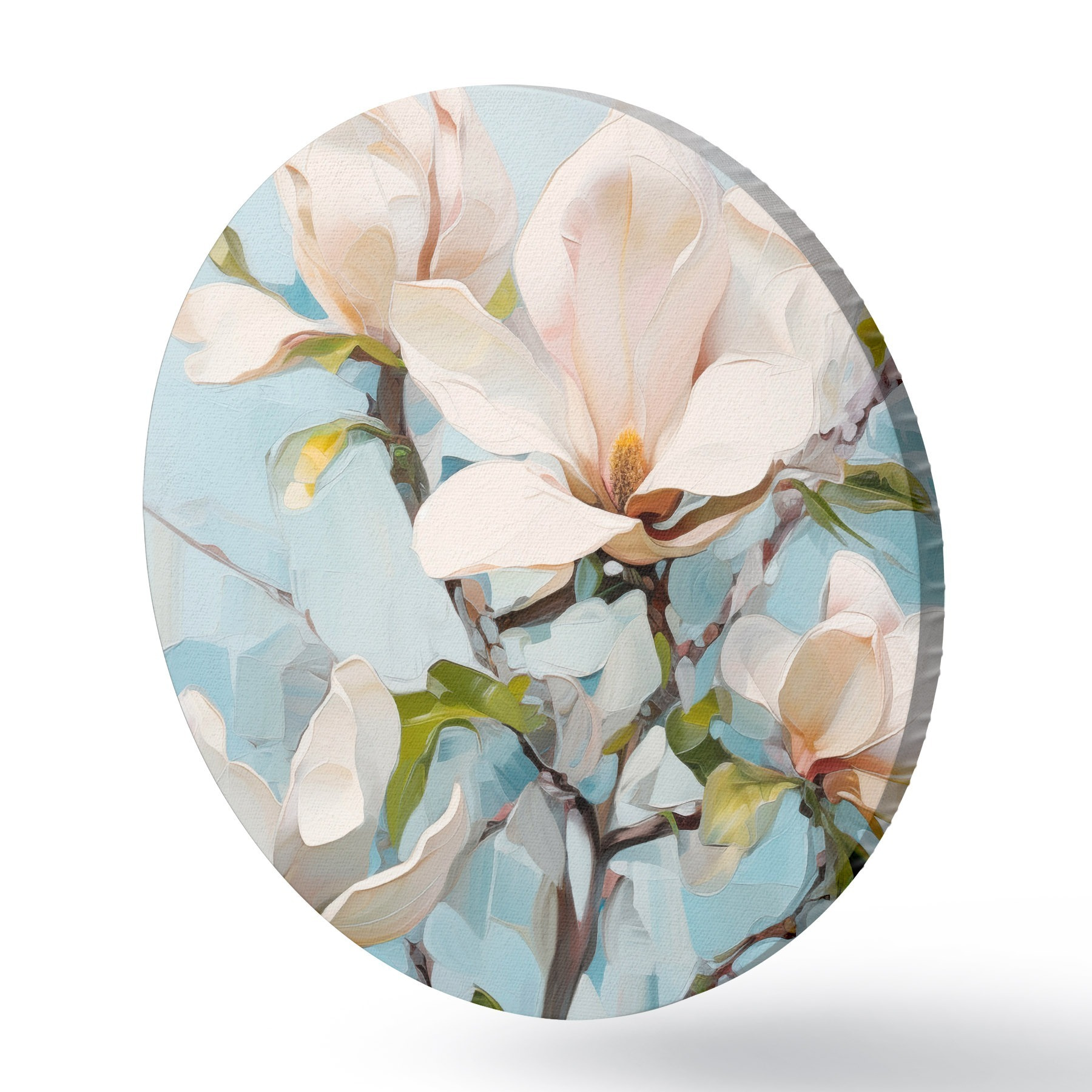 Runde Wandbilder Weiße Magnolienblüten, hellblauer Hintergrund mit sanften Pinselstrichen, Ölgemälde-Stil, pastose Textur r46277