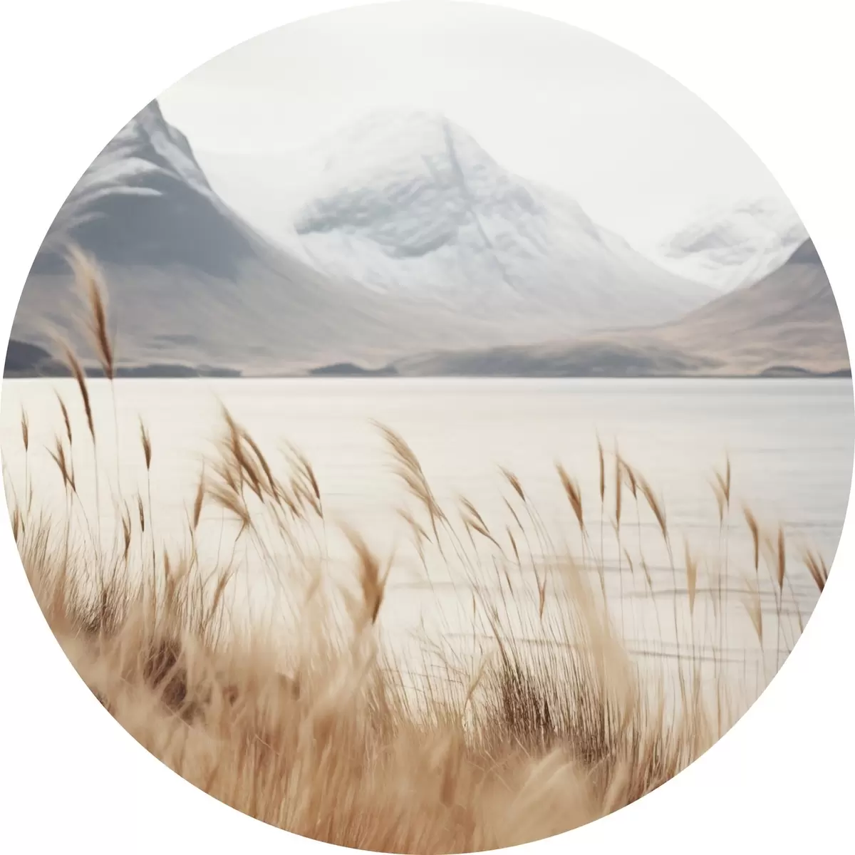 Runde Wandbilder Pampasgrasfeld vor einer Seenlandschaft mit schneebedeckten Bergen im Hintergrund, weiches Licht r46282