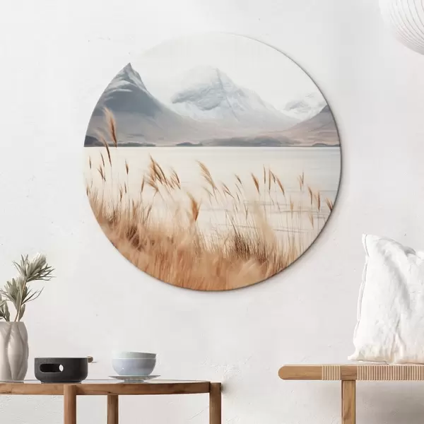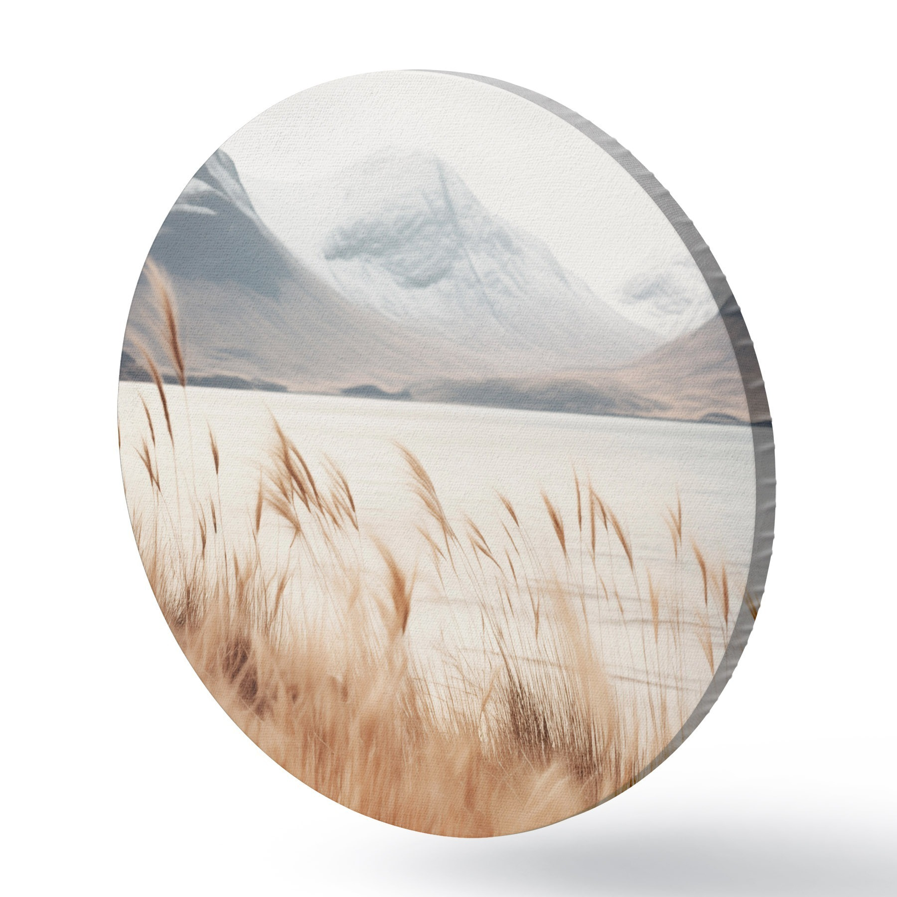 Runde Wandbilder Pampasgrasfeld vor einer Seenlandschaft mit schneebedeckten Bergen im Hintergrund, weiches Licht Nr r46282