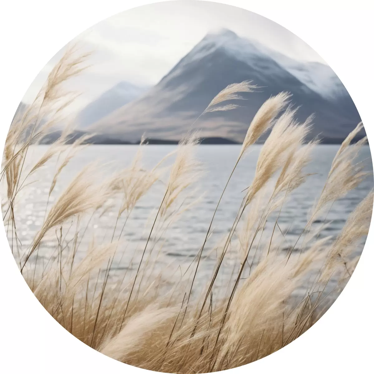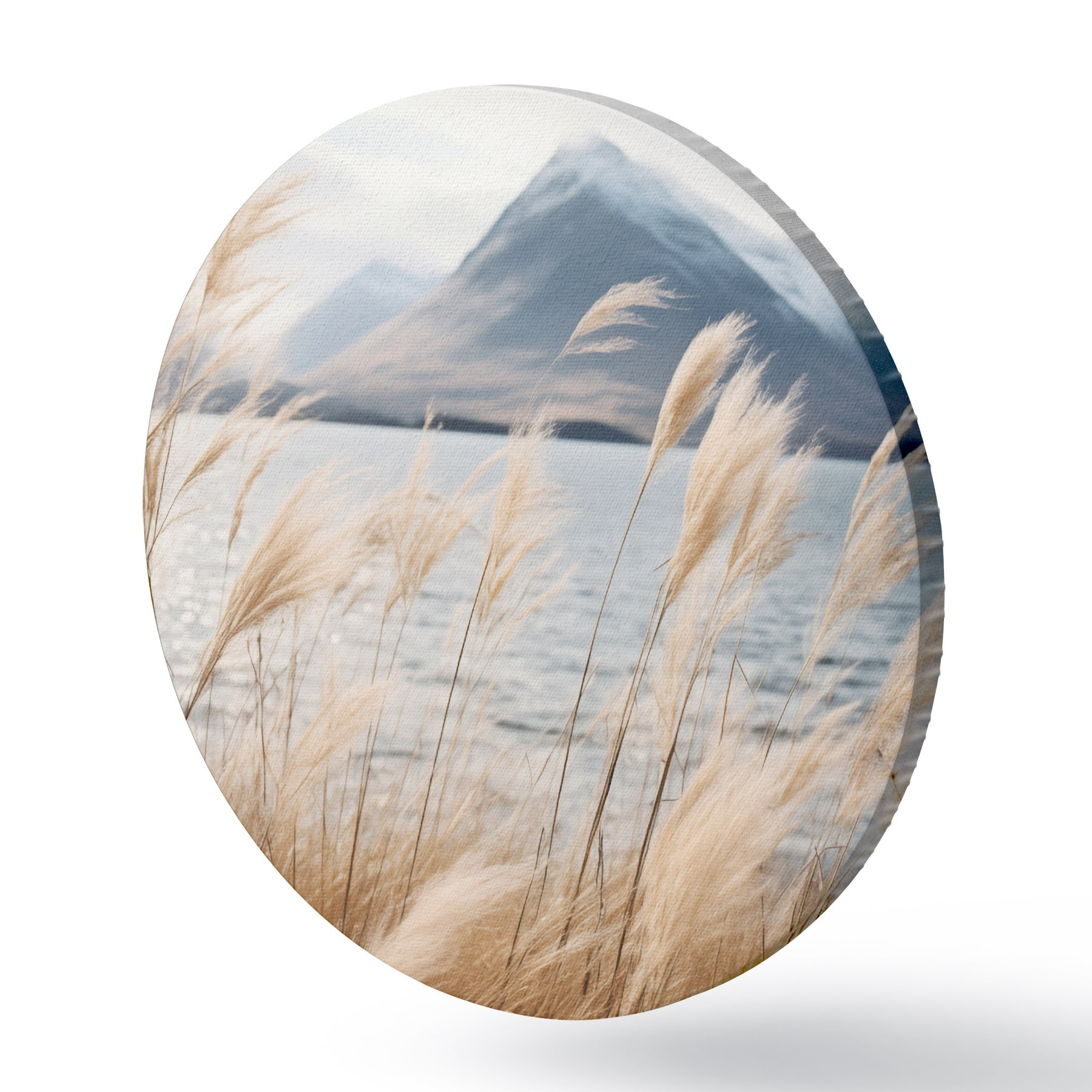 Runde Wandbilder Pampasgras mit einem See und Bergen im Hintergrund, sanfte Beleuchtung, gedämpfte Farben, naturalistischer Stil r46283
