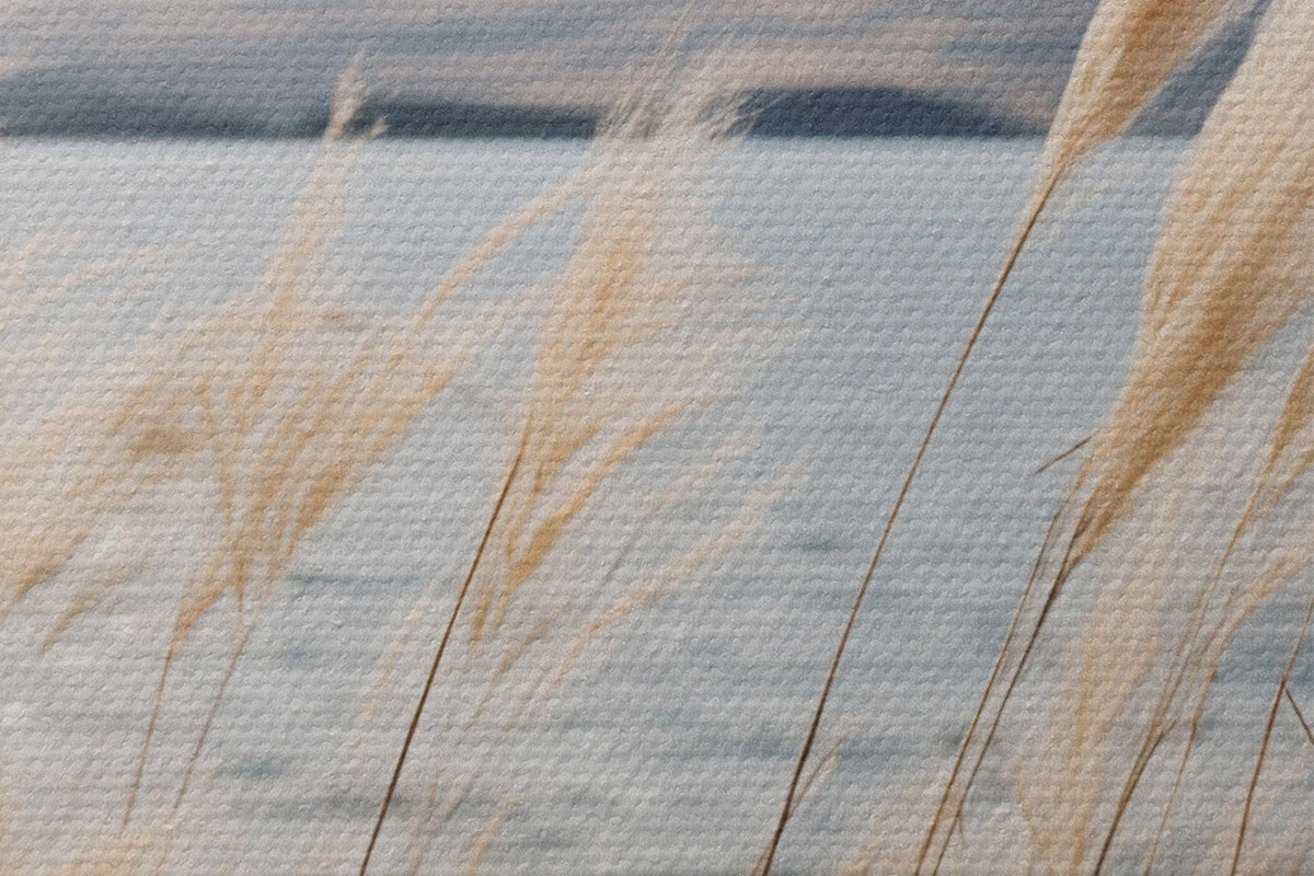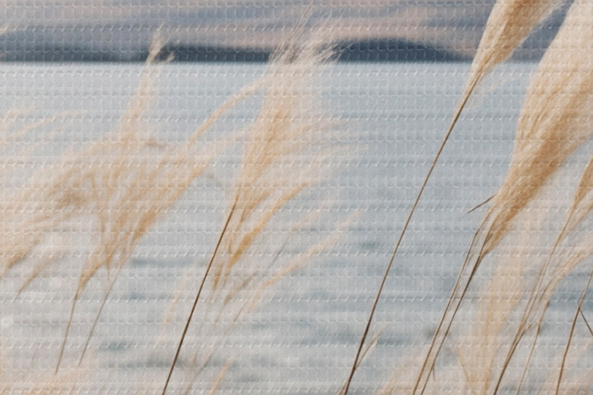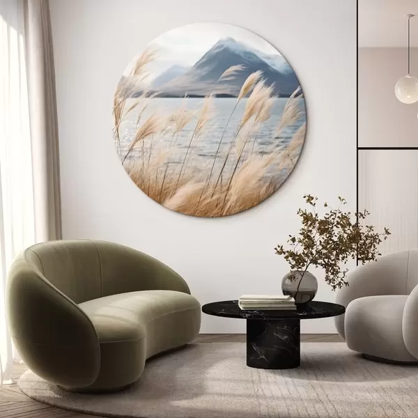 Runde Wandbilder Pampasgras mit einem See und Bergen im Hintergrund, sanfte Beleuchtung, gedämpfte Farben, naturalistischer Stil r46283