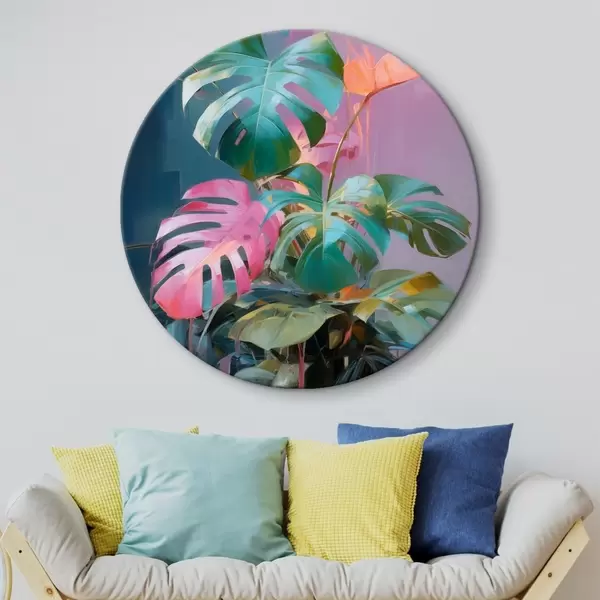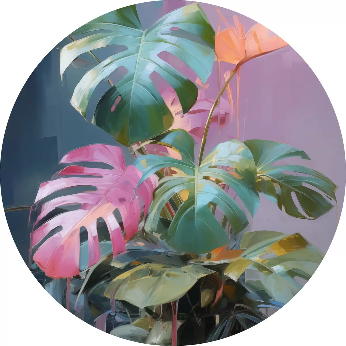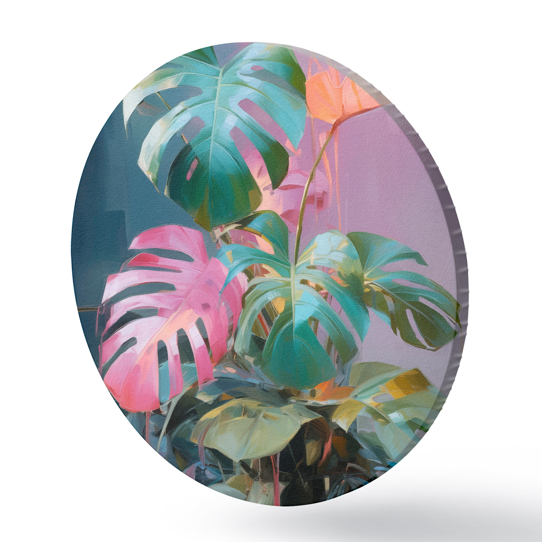 Runde Wandbilder Abstrakte Monstera-Pflanze mit rosa und grünen Blättern, leuchtenden Farben, vor einem unscharfen Hintergrund r46287