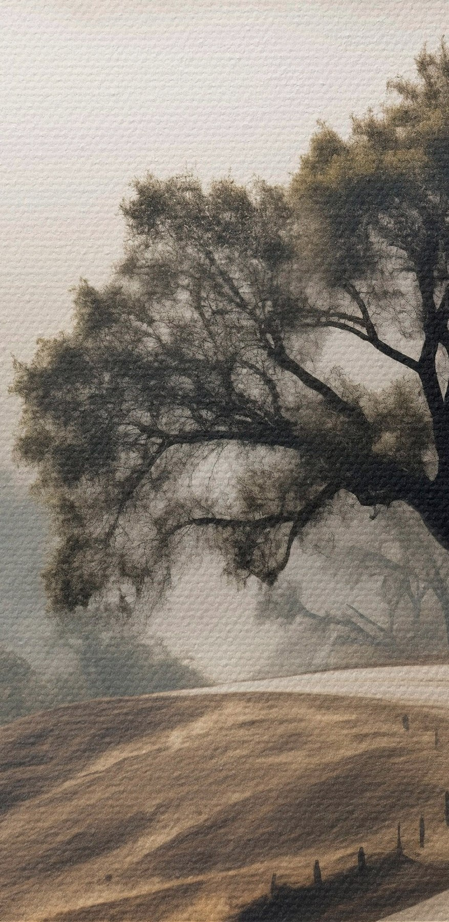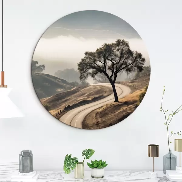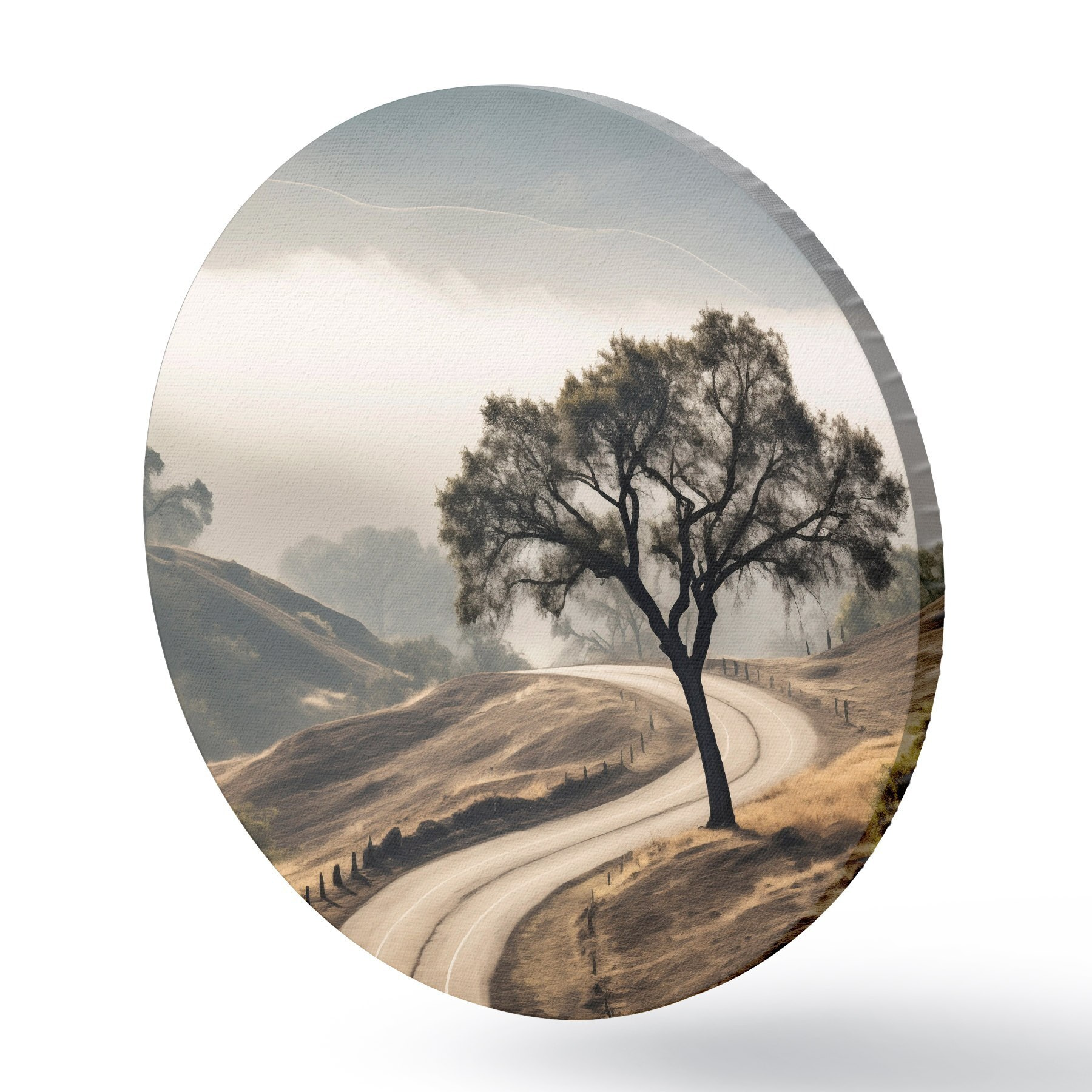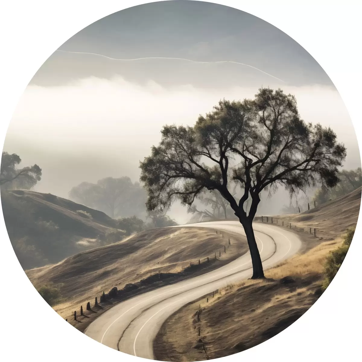 Runde Wandbilder Eine kurvenreiche Straße durch sanfte Hügel mit einem Baum im Vordergrund, im Hintergrund Nebel und Berge r46288