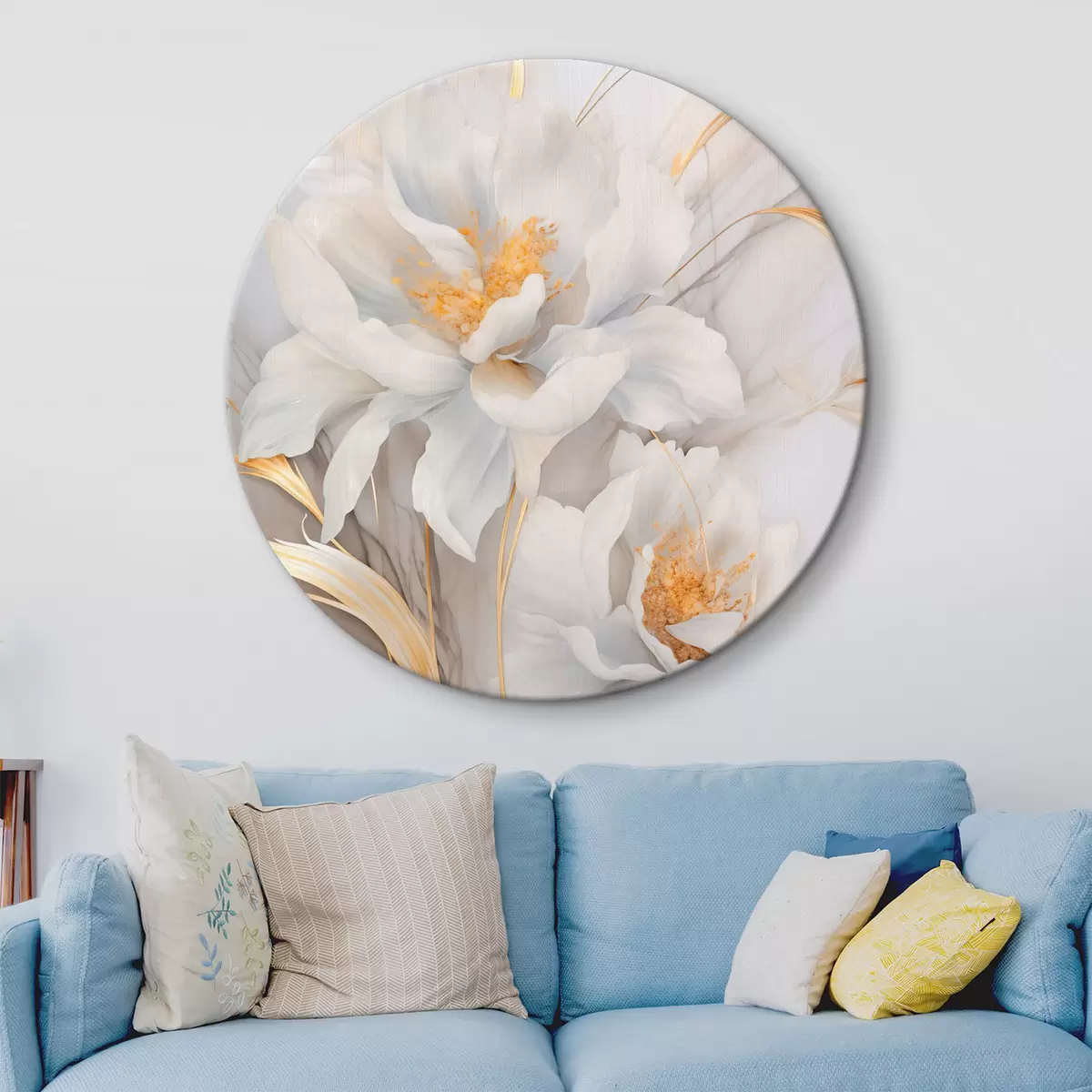 Runde Wandbilder Weiße Blüten mit gelben Stempeln und Stielen, zarte Blütenblätter, elegante Komposition, neutraler Hintergrund Nr r46293