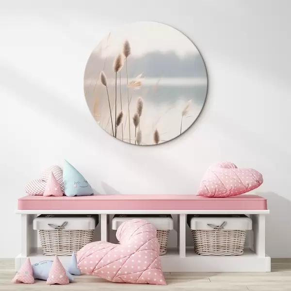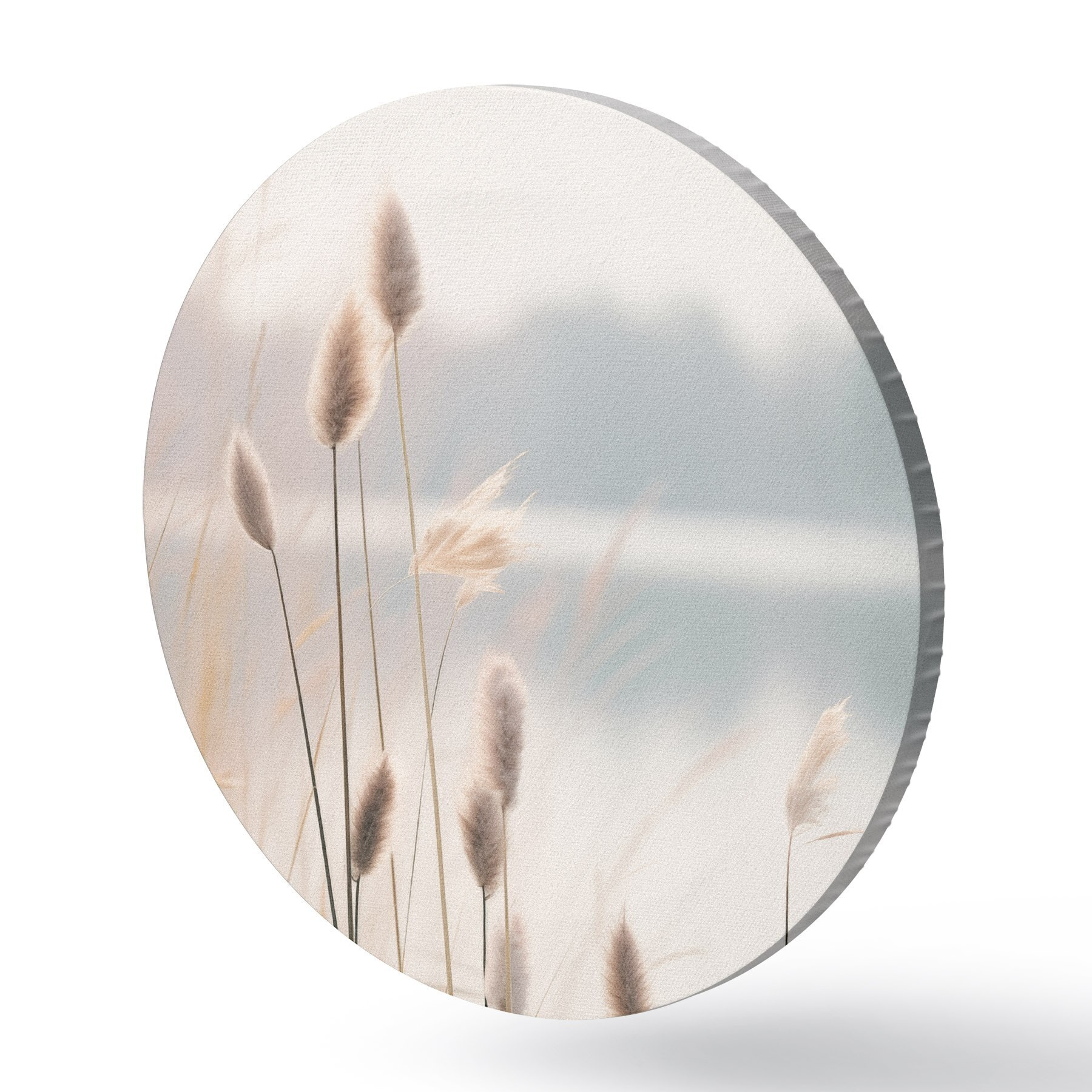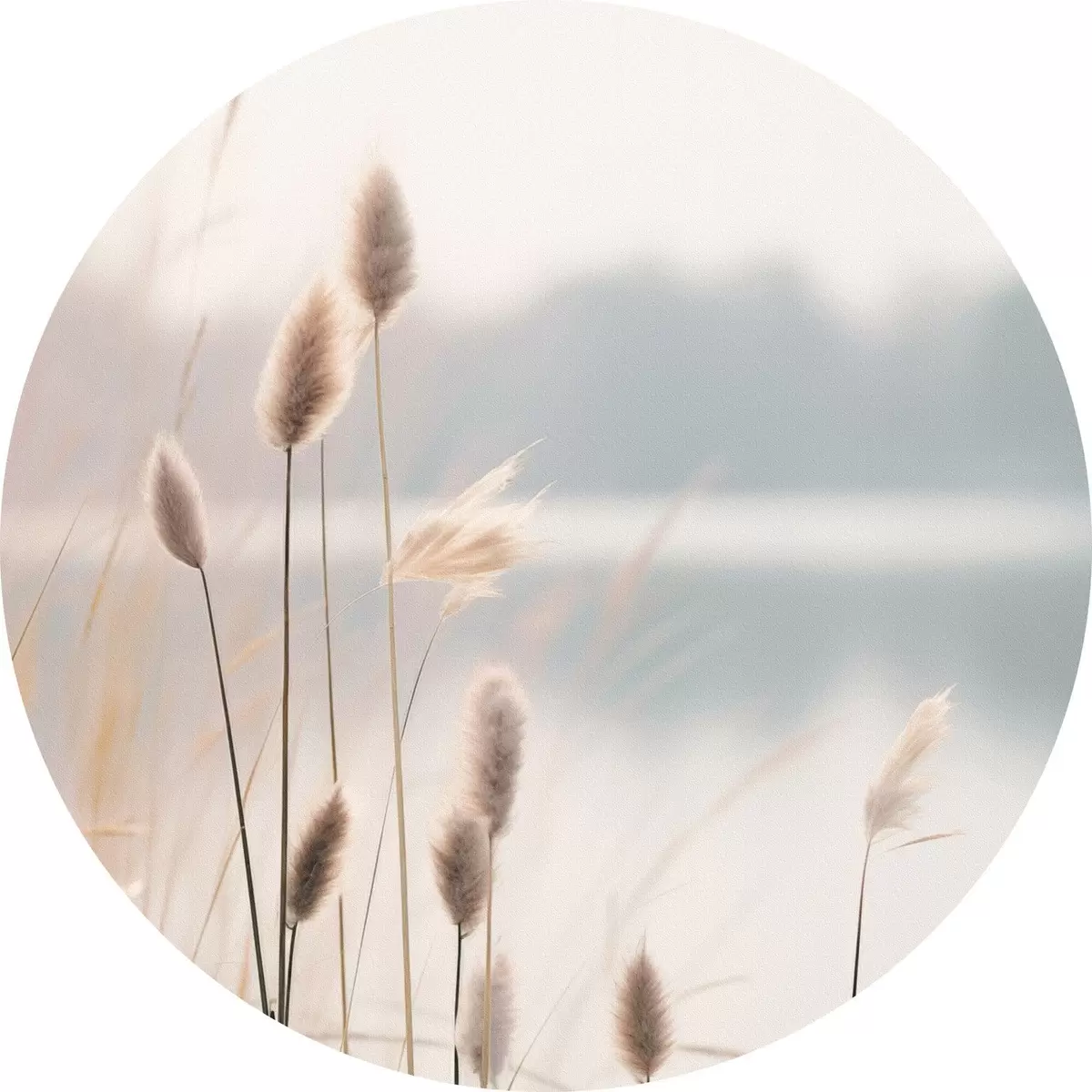 Runde Wandbilder Weiche Schilfrohre an einem nebligen Seeufer, pastellbeige Farbtöne Nr r46504