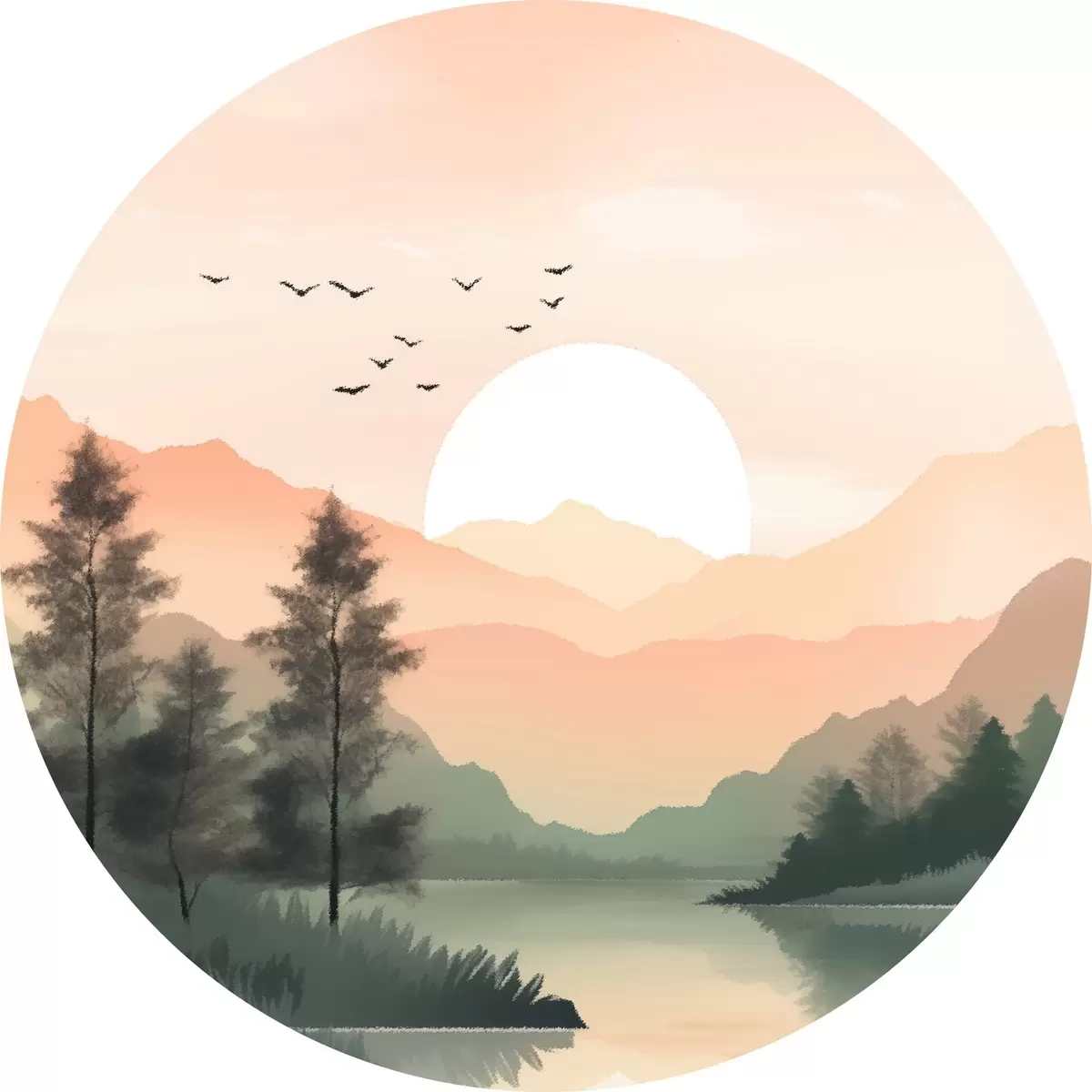 Runde Wandbilder Pastellfarbener Sonnenuntergang über einem ruhigen See mit fernen Hügeln und Vögeln r46508