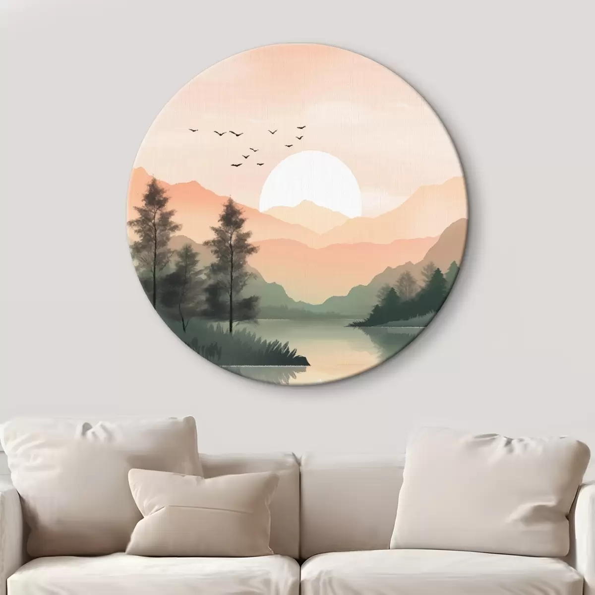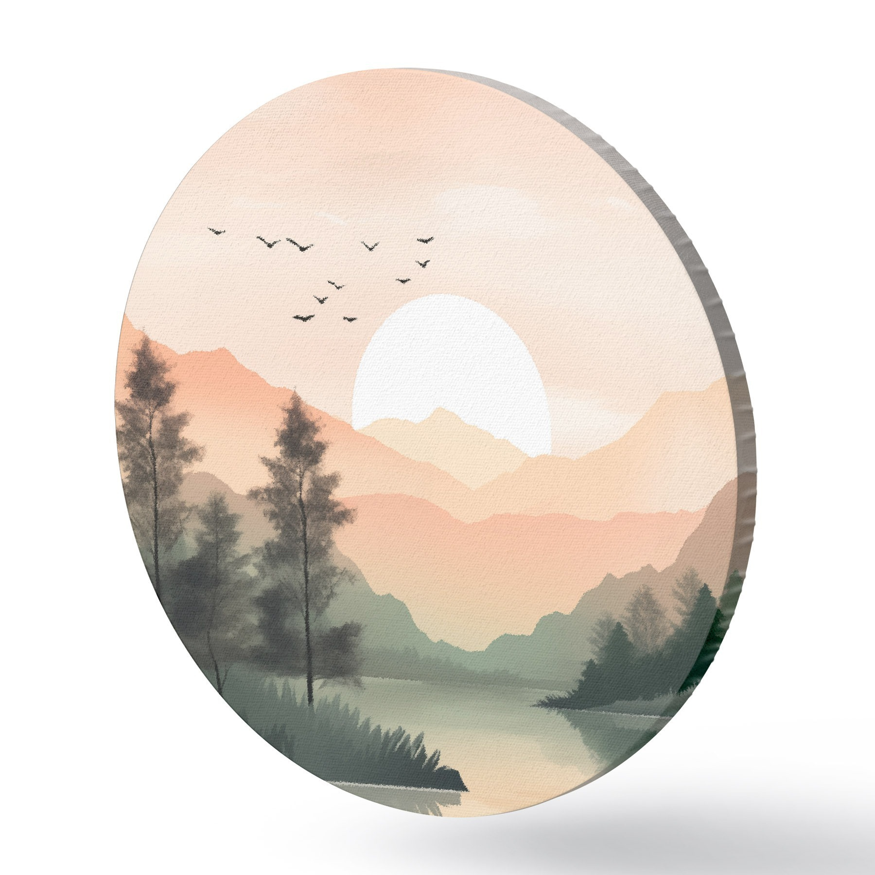 Runde Wandbilder Pastellfarbener Sonnenuntergang über einem ruhigen See mit fernen Hügeln und Vögeln Nr r46508