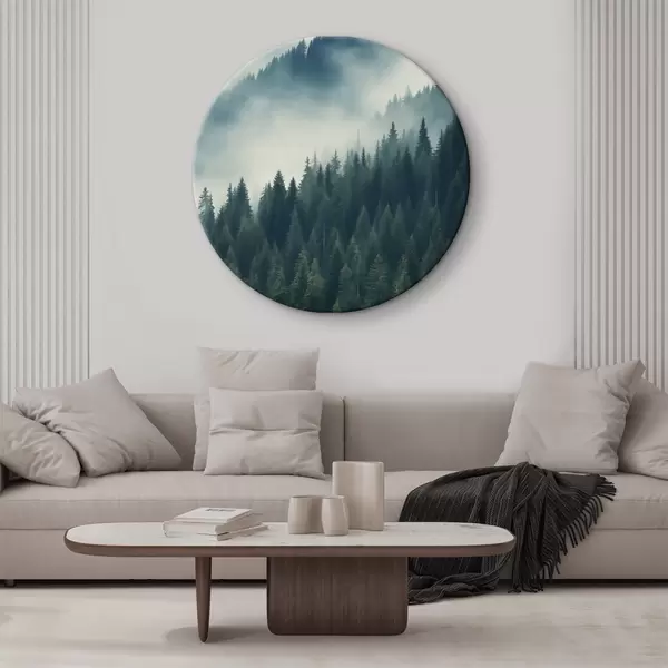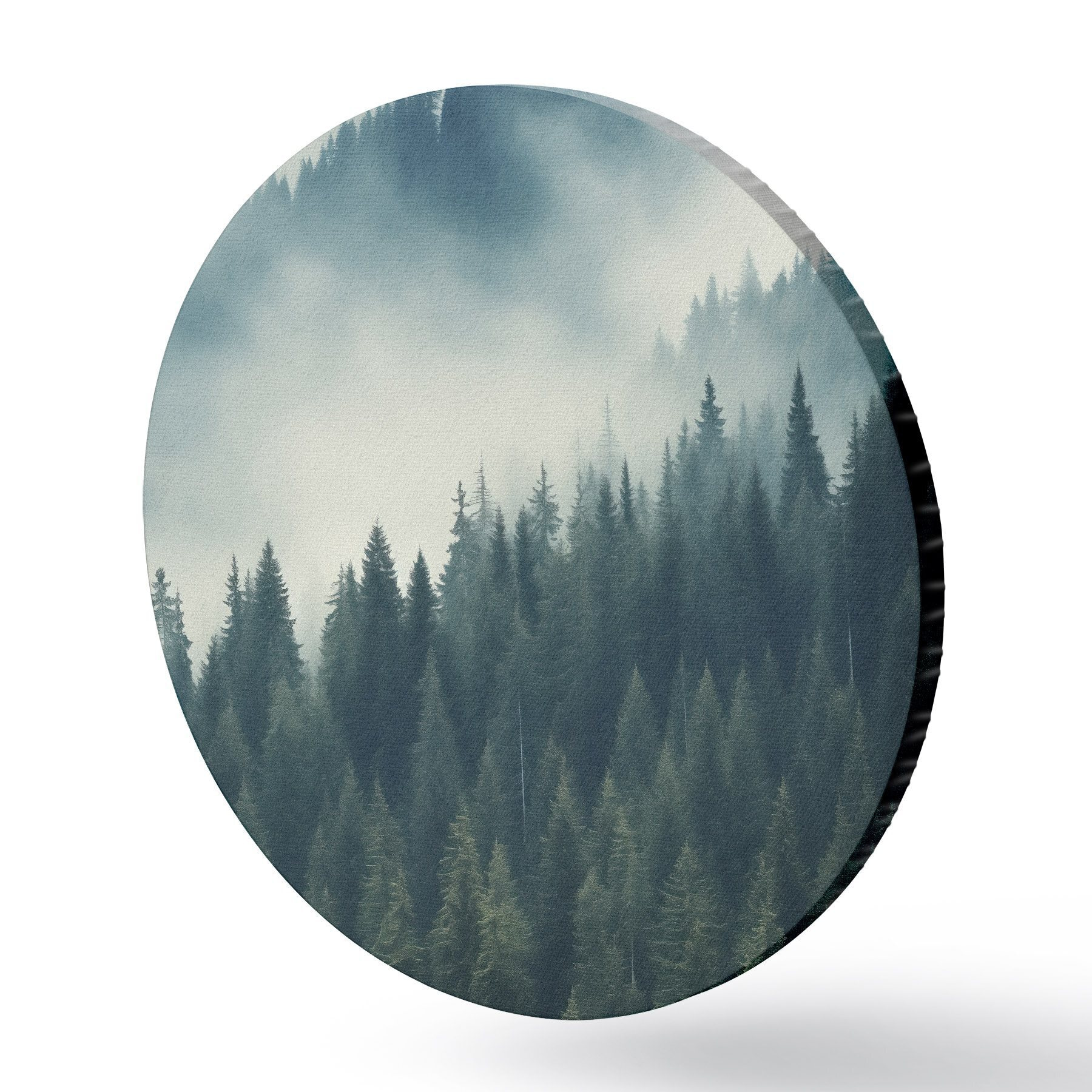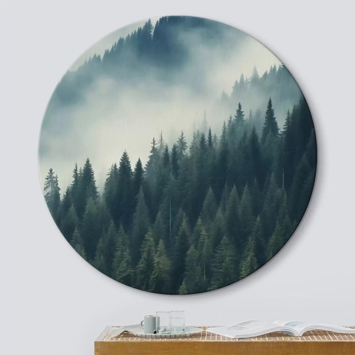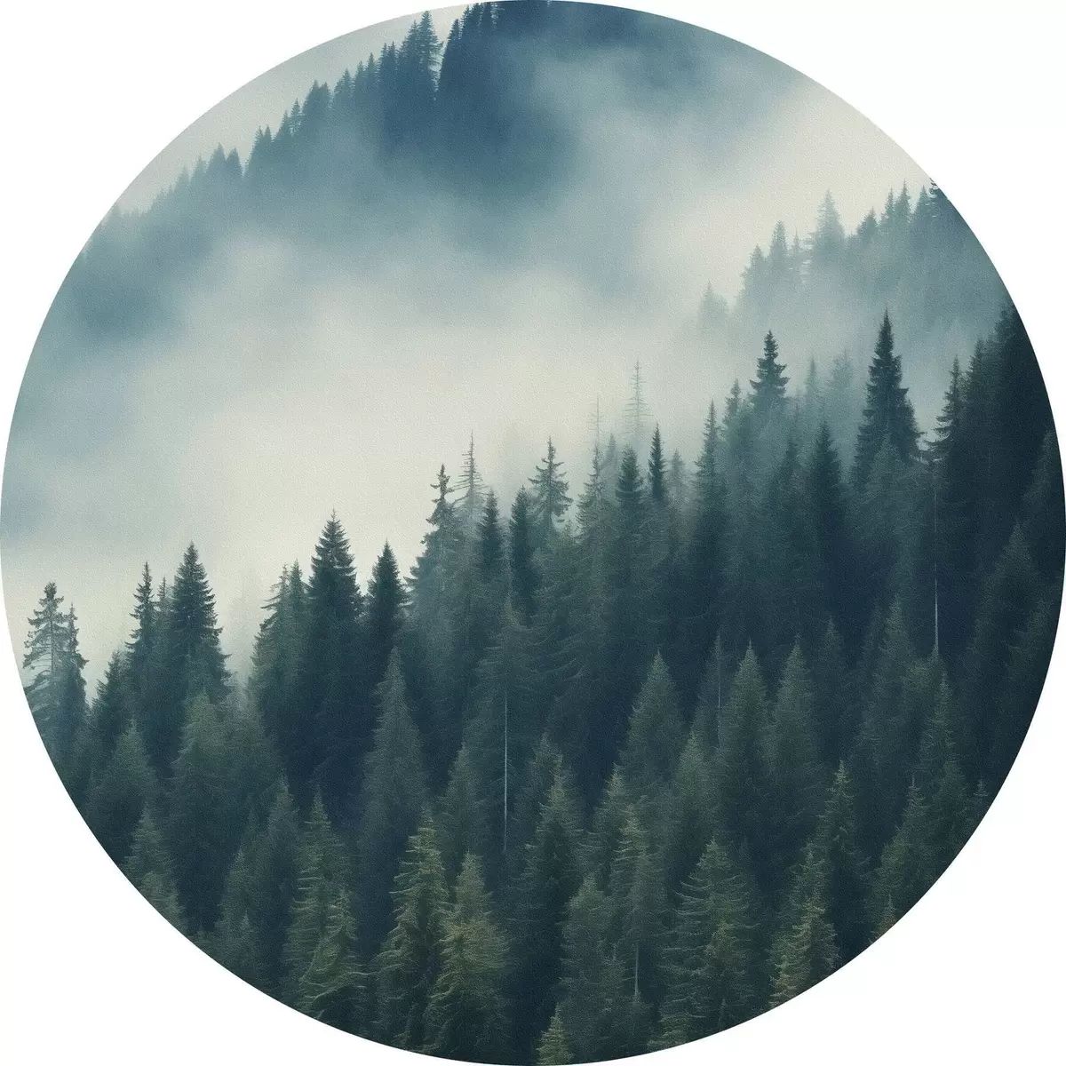 Runde Wandbilder Nebel über Nadelbaumhängen, tiefe Grüntöne Nr r46516