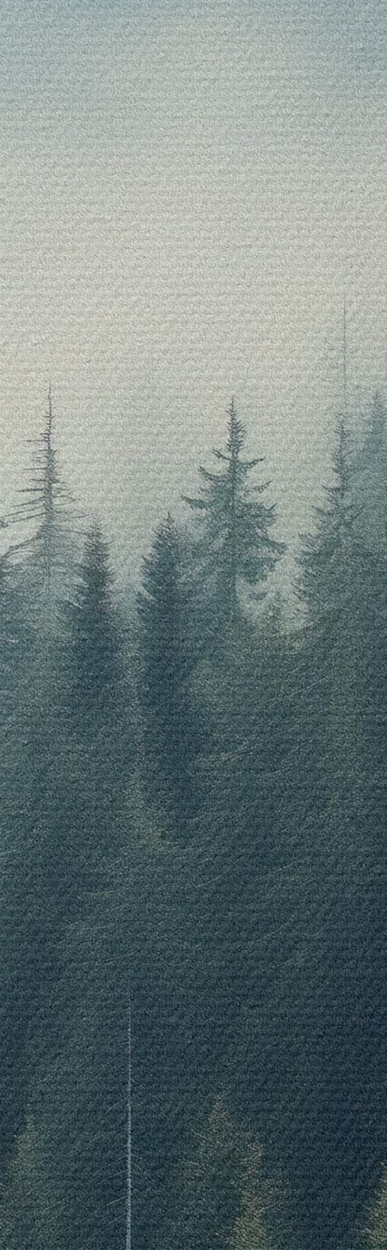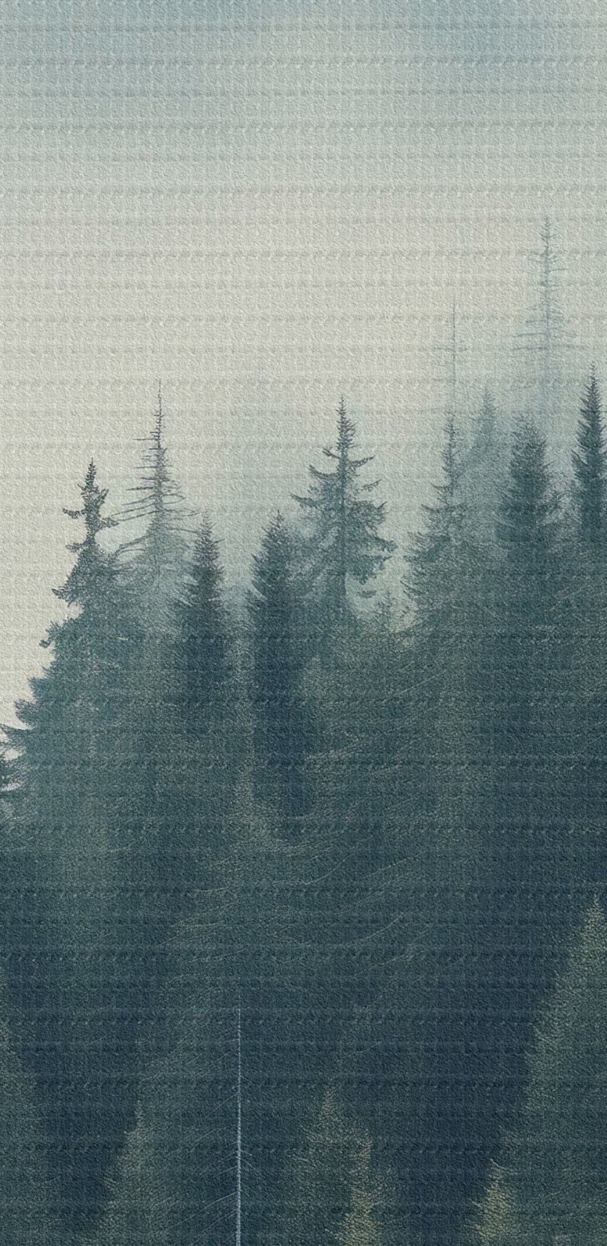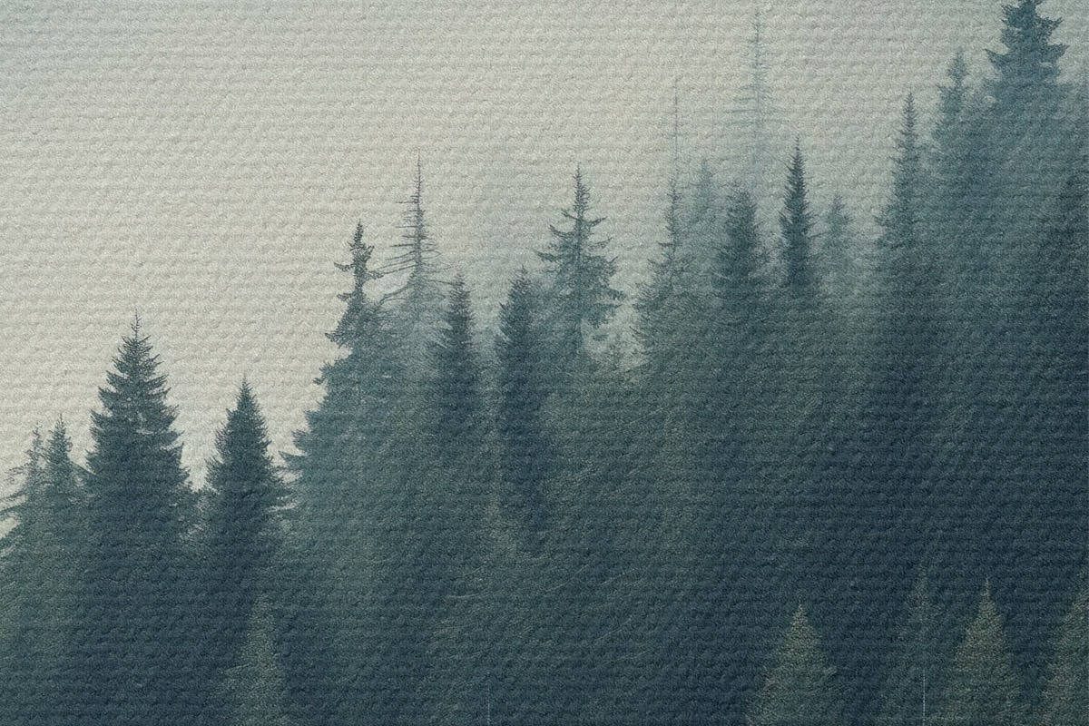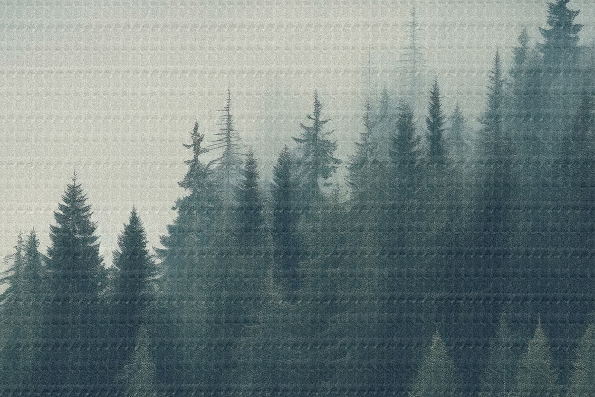 Runde Wandbilder Nebel über Nadelbaumhängen, tiefe Grüntöne r46516