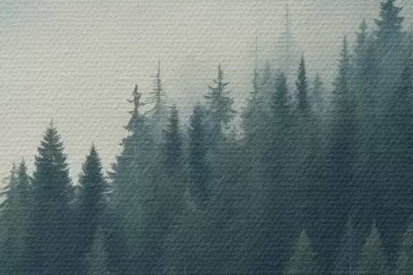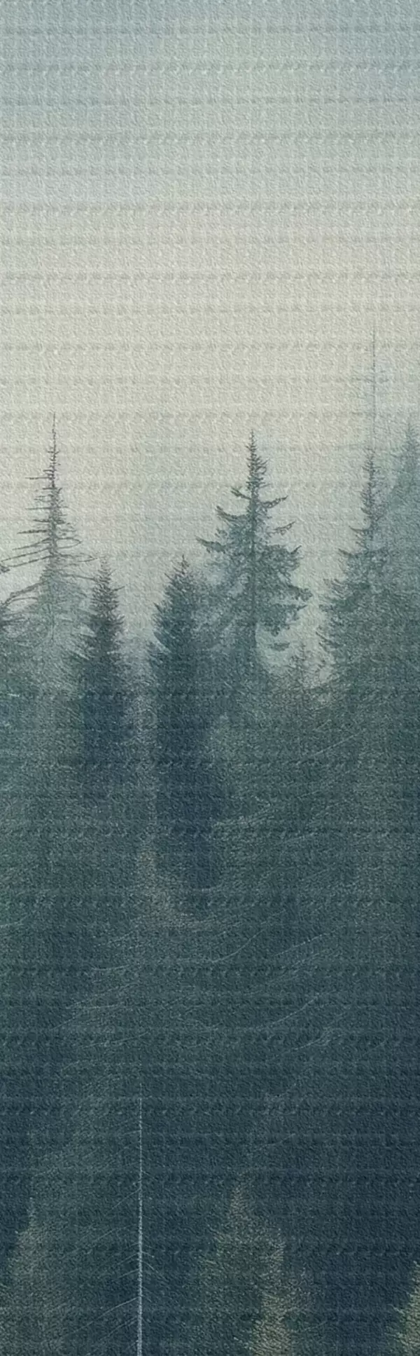 Runde Wandbilder Nebel über Nadelbaumhängen, tiefe Grüntöne r46516