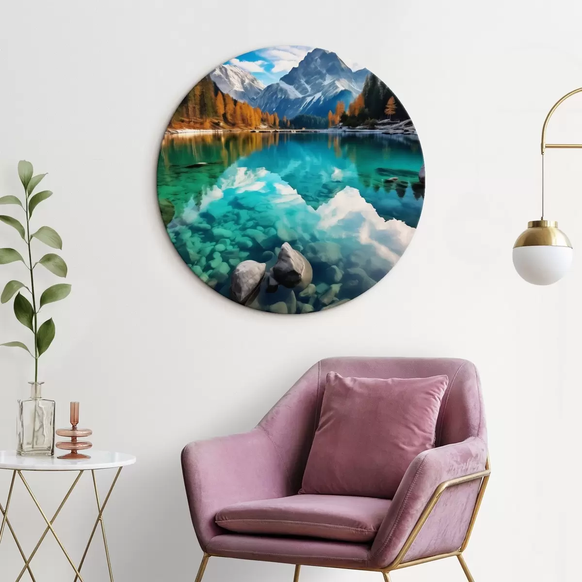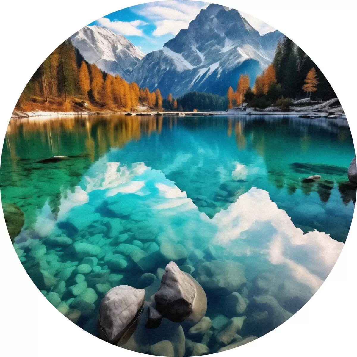 Runde Wandbilder Bergsee mit türkisfarbenem Wasser und herbstlichen Lärchen Nr r46517