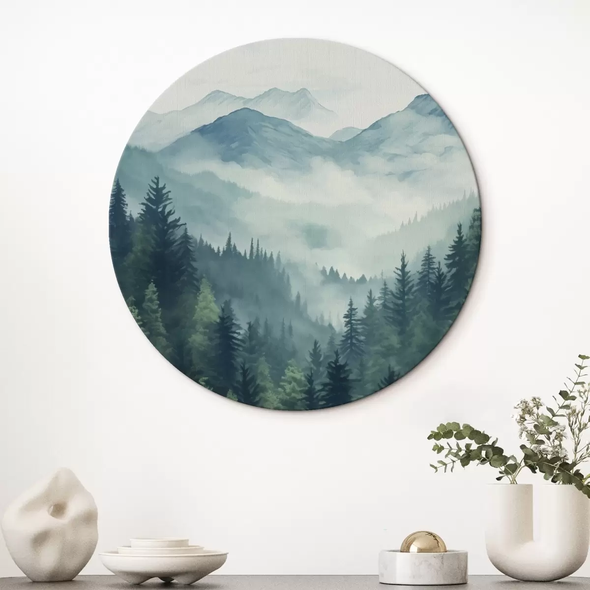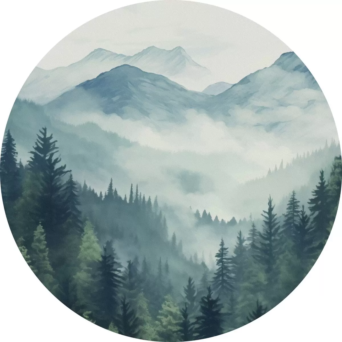 Runde Wandbilder Aquarellberge und Wald im sanften Morgennebel Nr r46519
