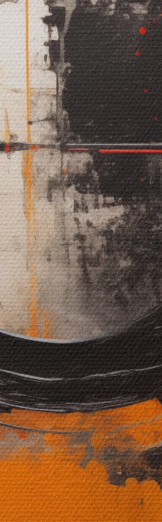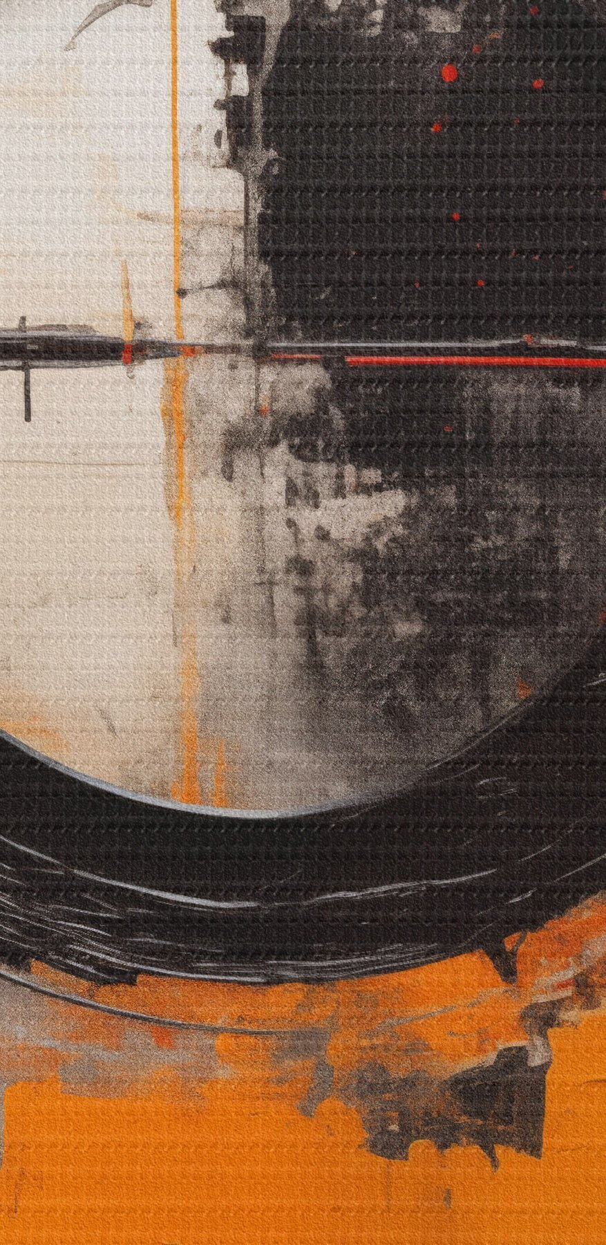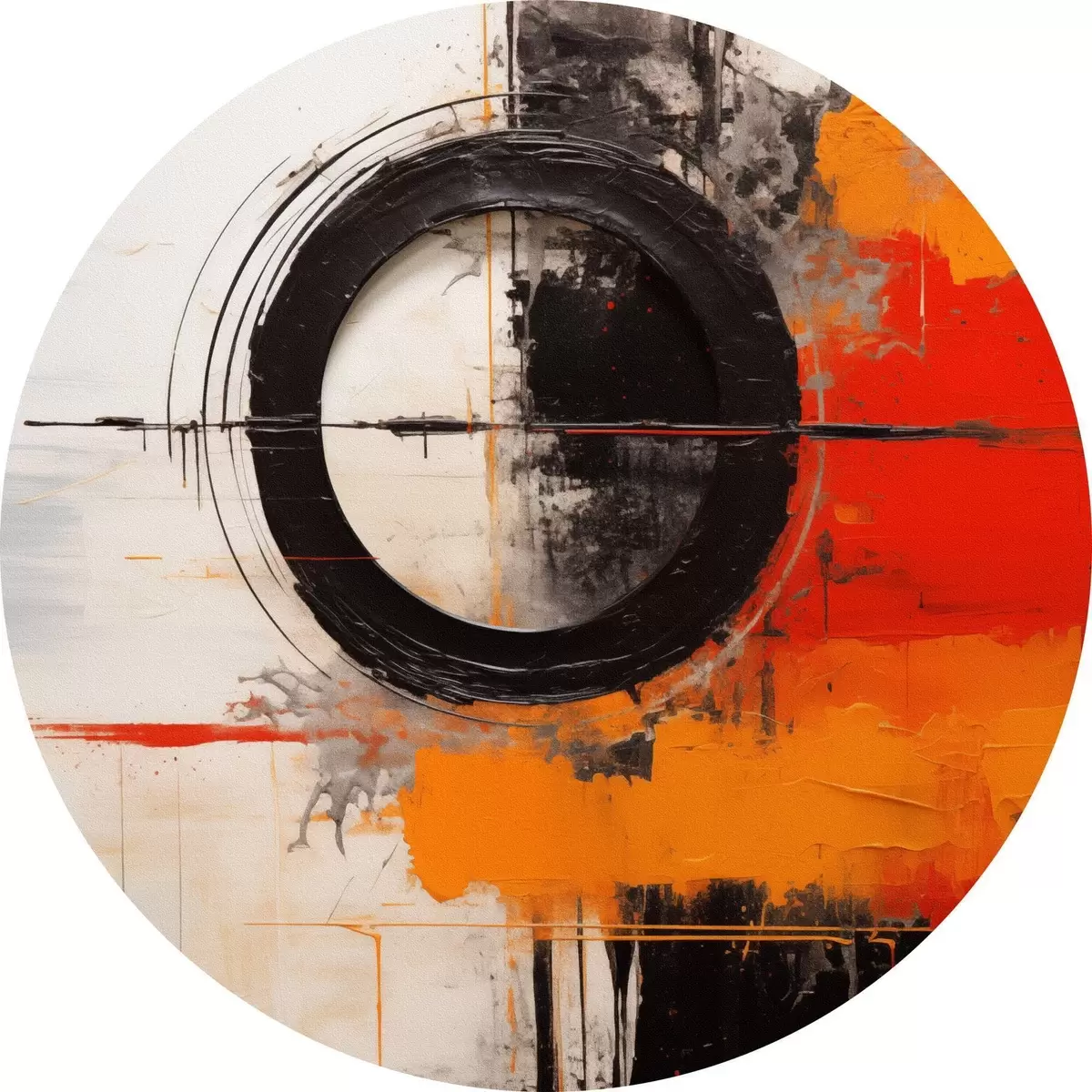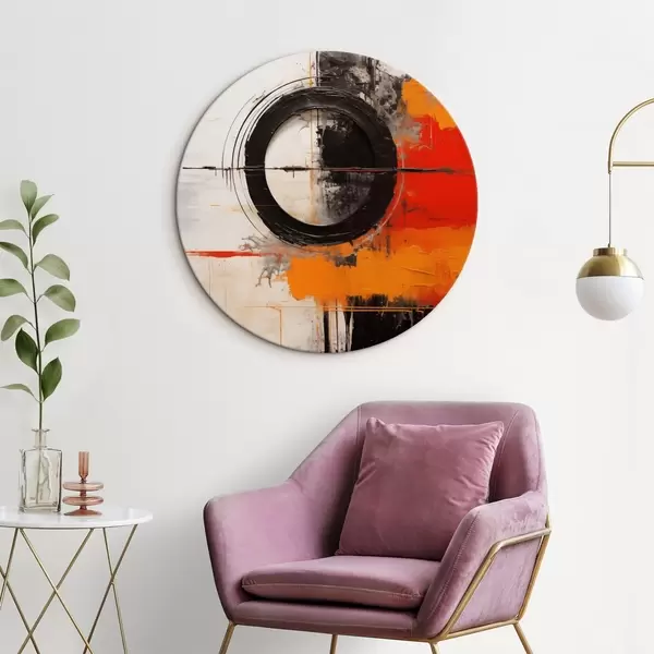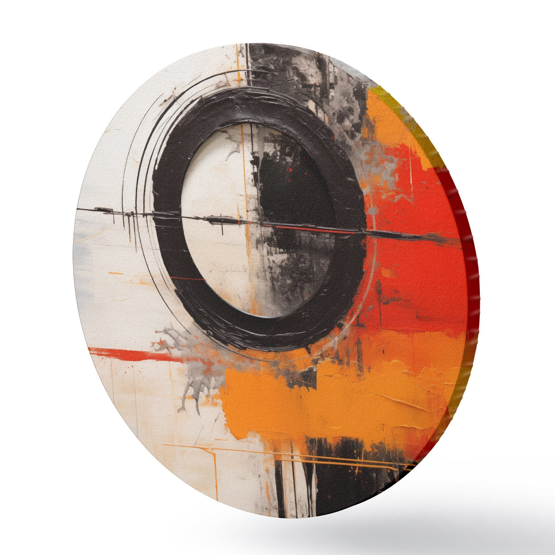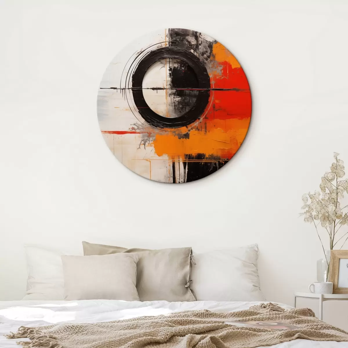 Runde Wandbilder Schwarzer Kreis auf weißem Hintergrund, orangefarbene Striche und Spritzer r46549