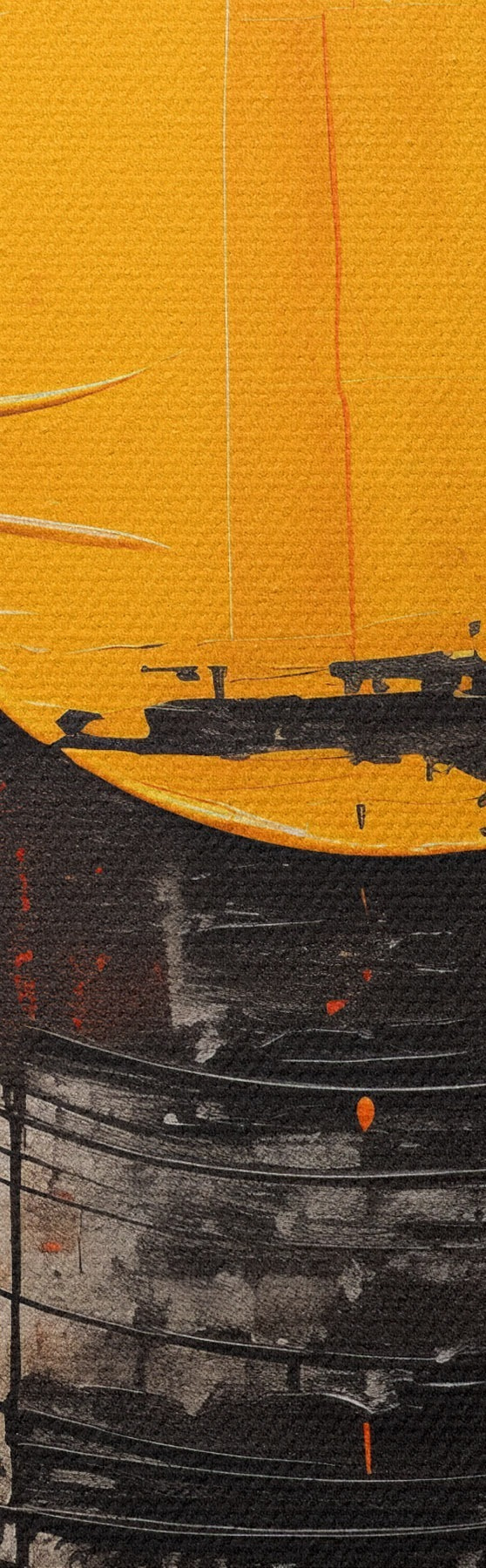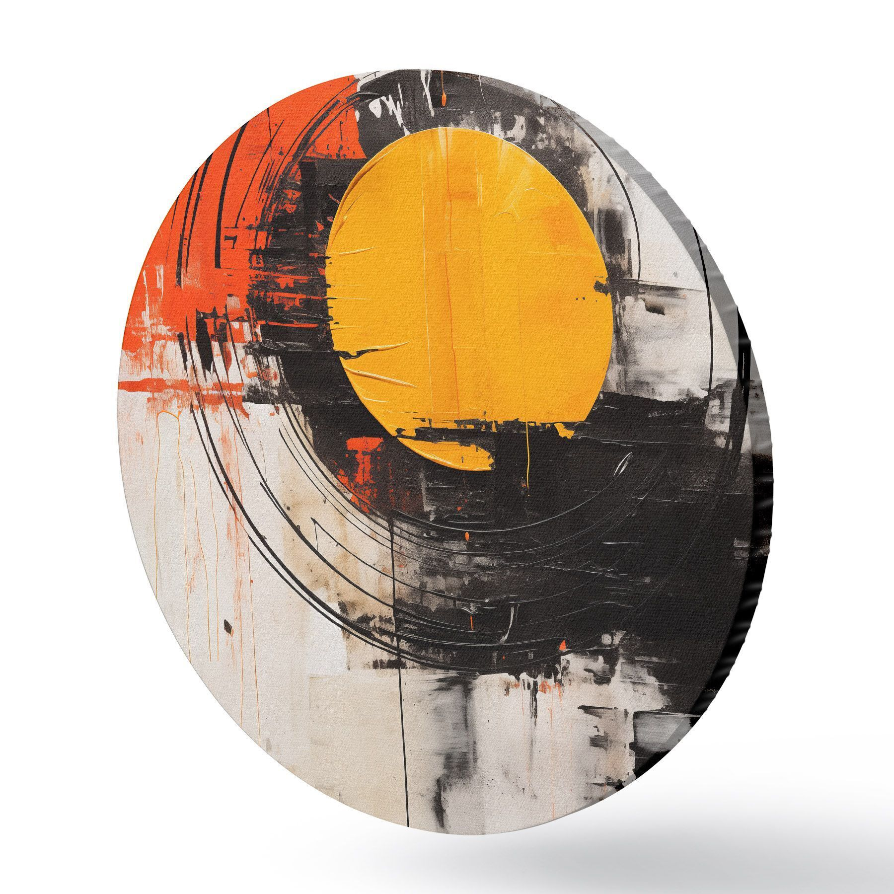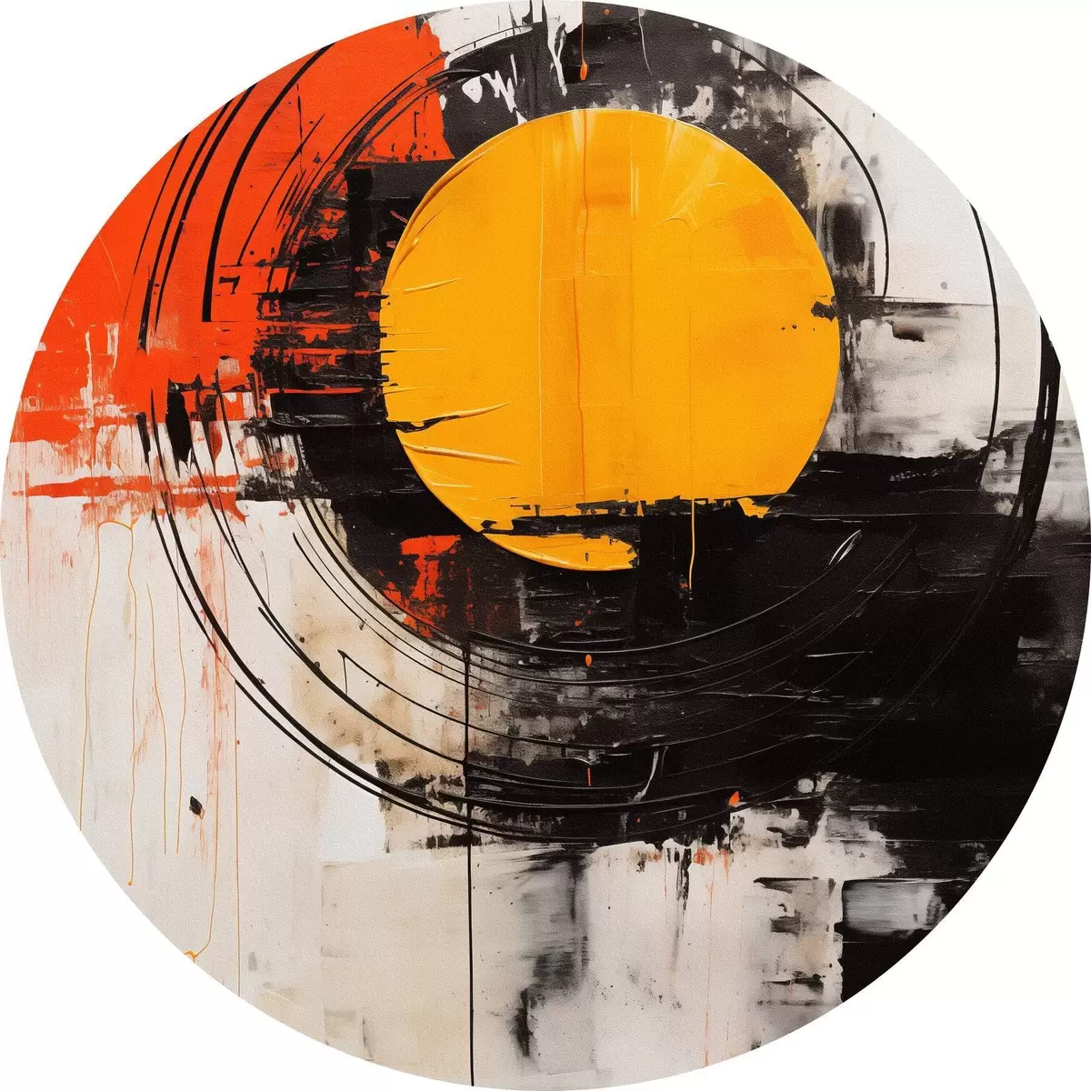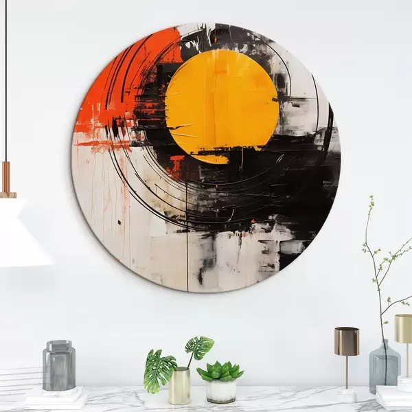 Runde Wandbilder Orangefarbene Scheibe innerhalb eines schwarzen Rings, Striche und Spritzer r46550