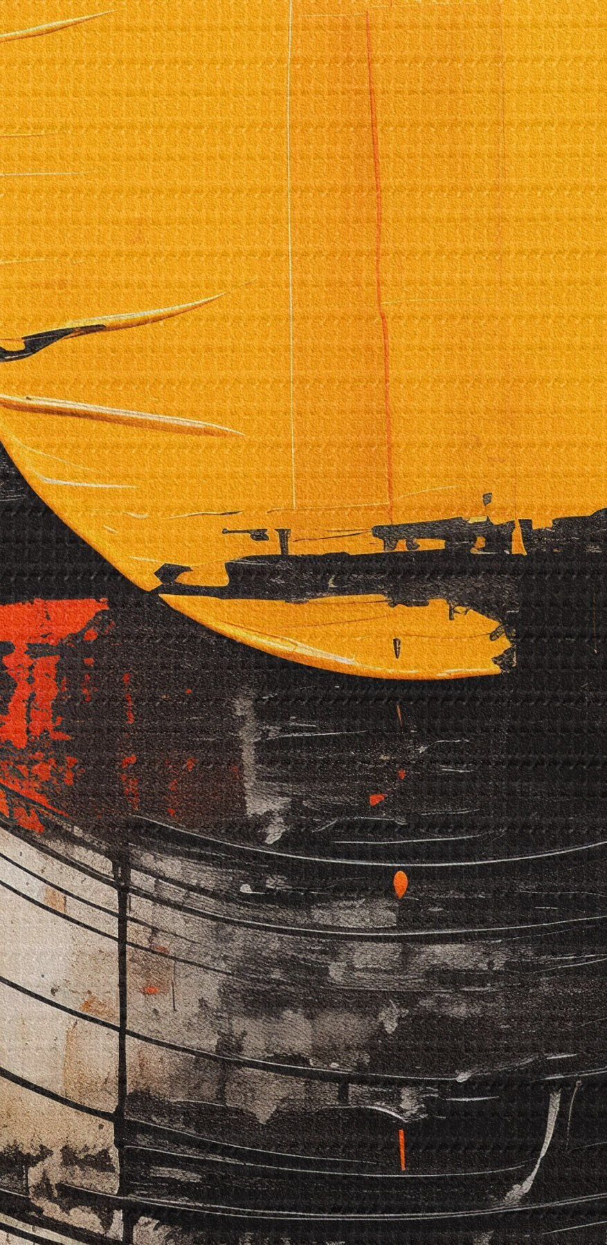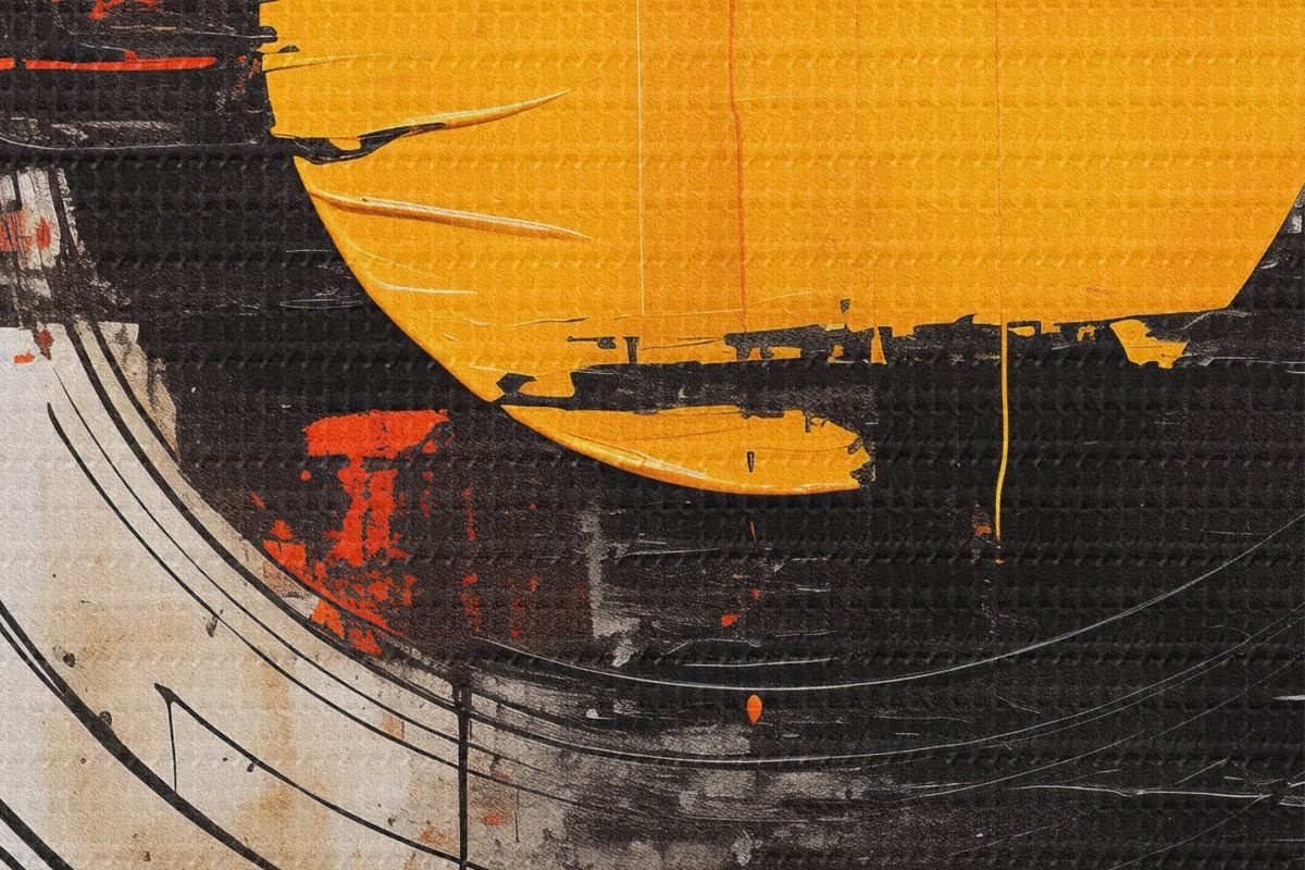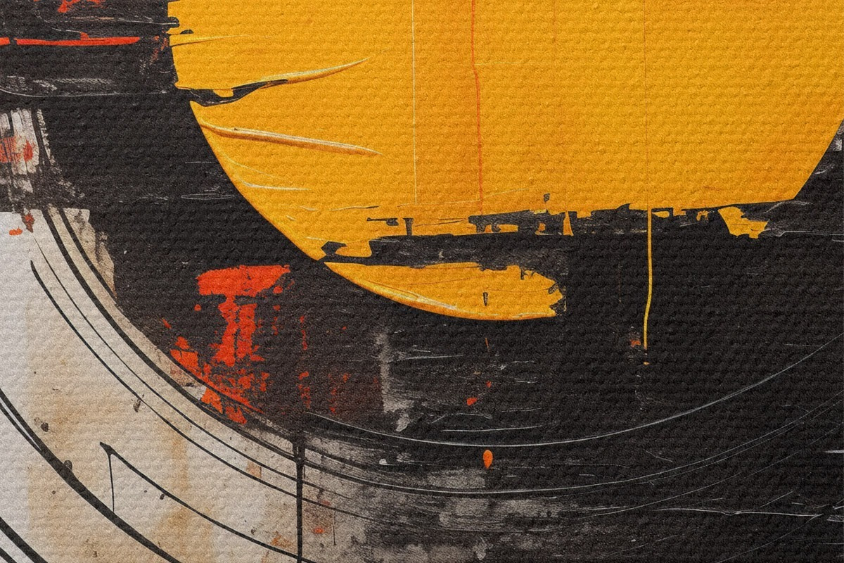 Runde Wandbilder Orangefarbene Scheibe innerhalb eines schwarzen Rings, Striche und Spritzer r46550