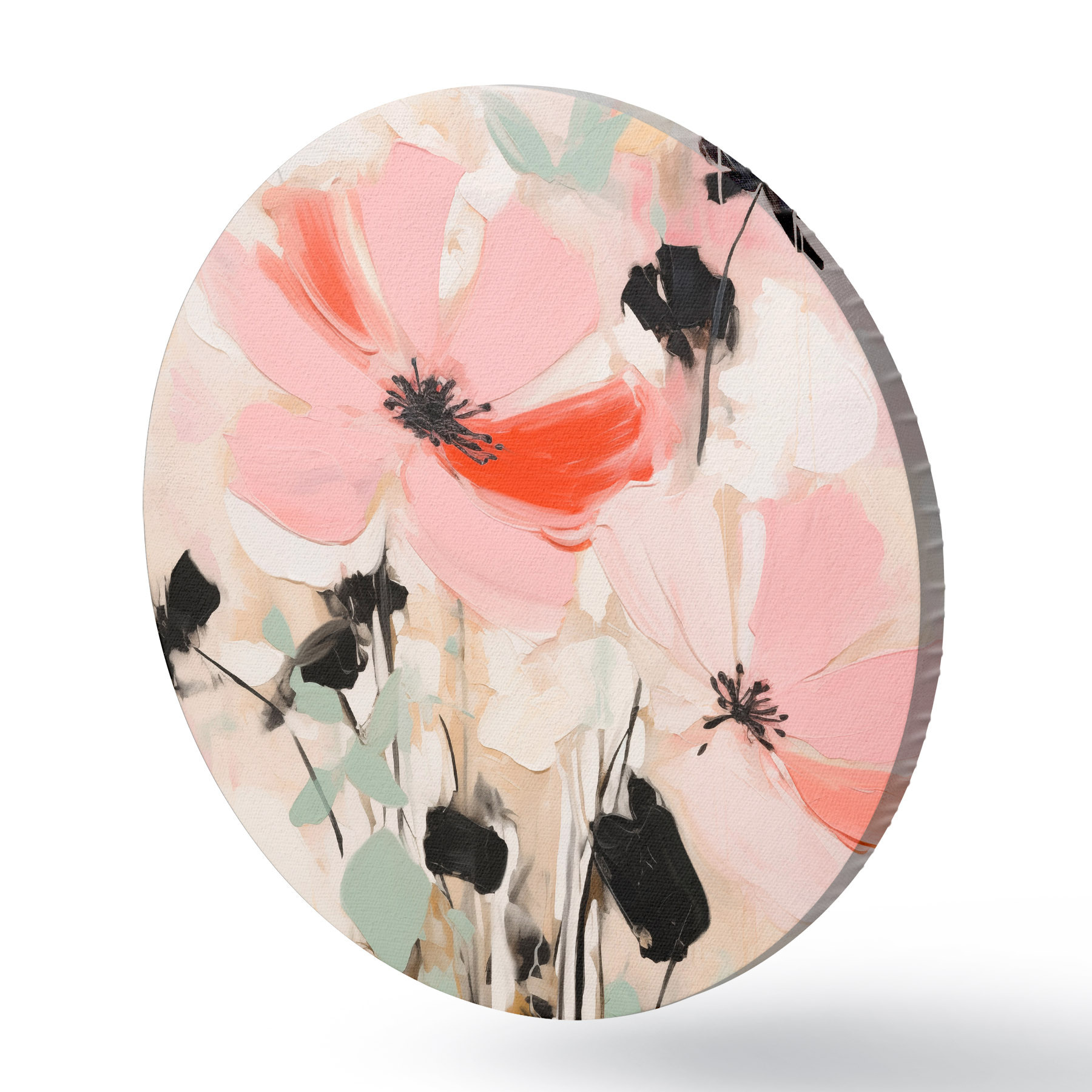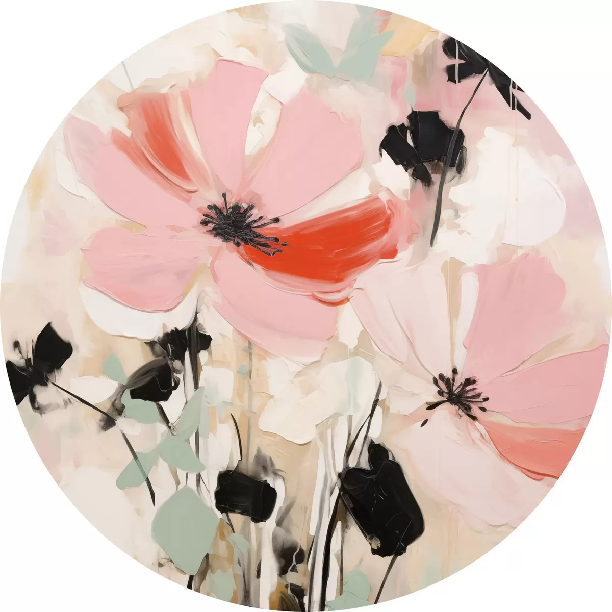 Runde Wandbilder Rosa und schwarze Blumen mit Blättern, sanfte Pastellfarben, abstraktes Blumenarrangement, minimalistische Kunst r46687
