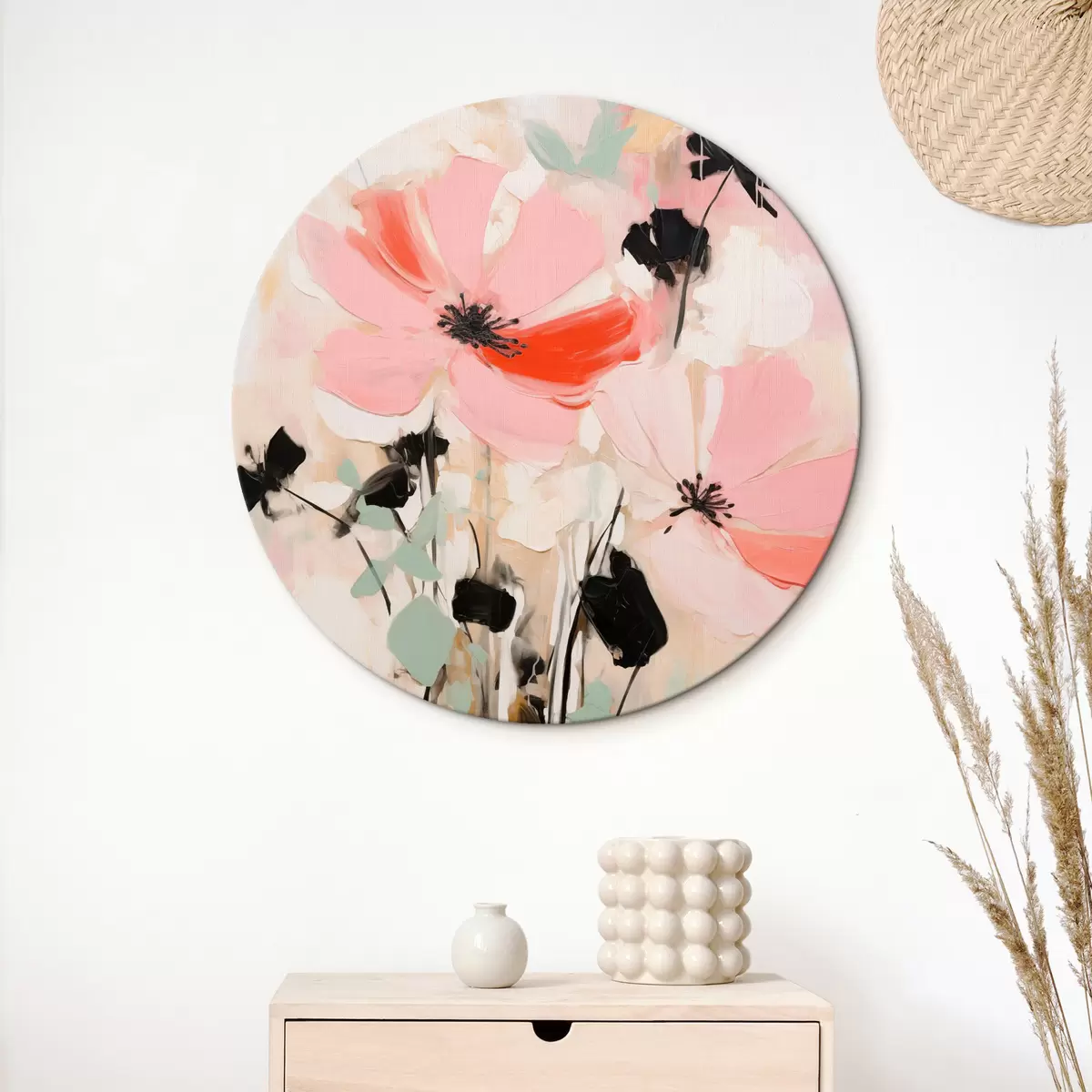 Runde Wandbilder Rosa und schwarze Blumen mit Blättern, sanfte Pastellfarben, abstraktes Blumenarrangement, minimalistische Kunst Nr r46687
