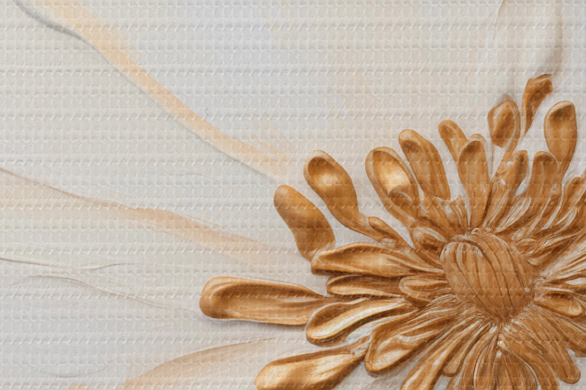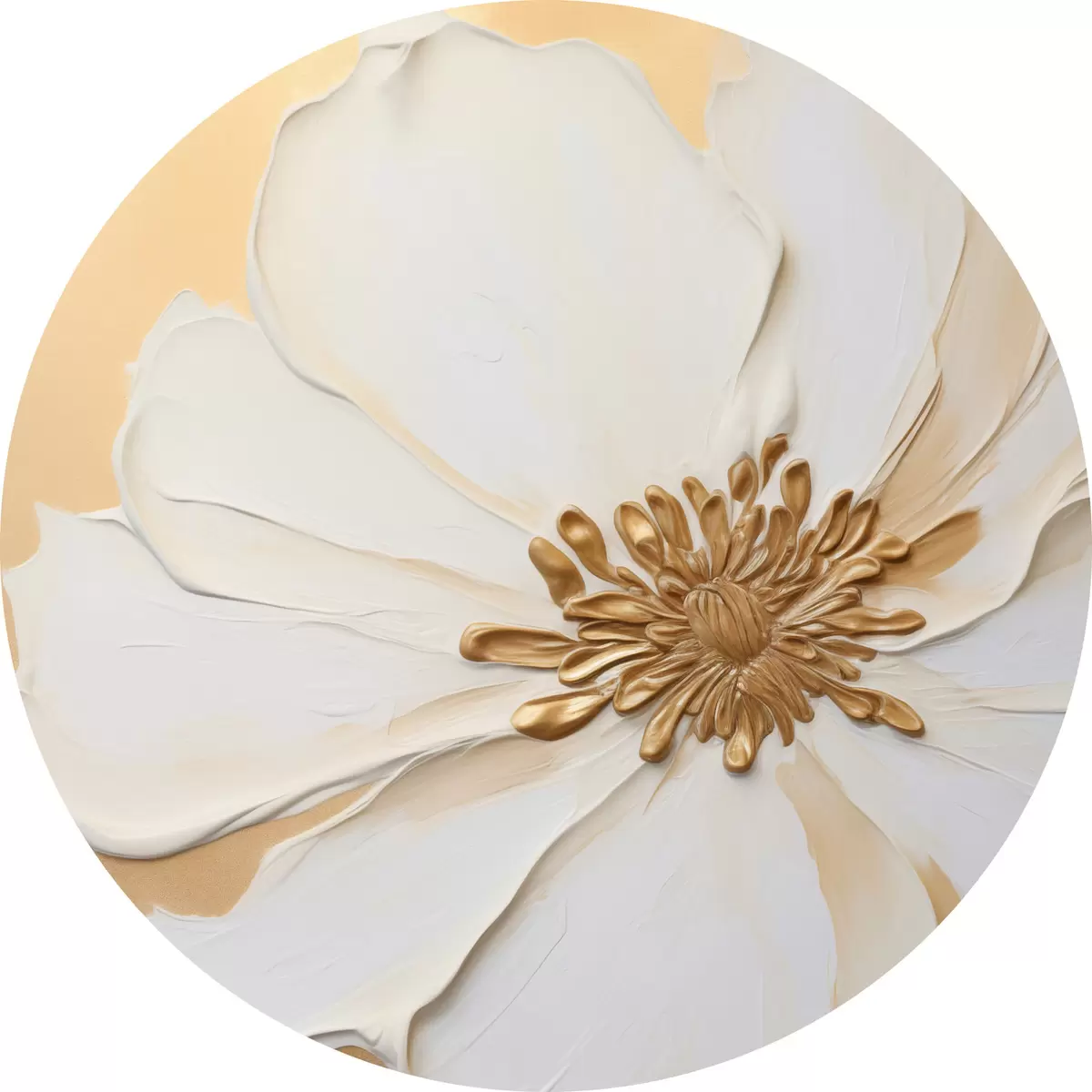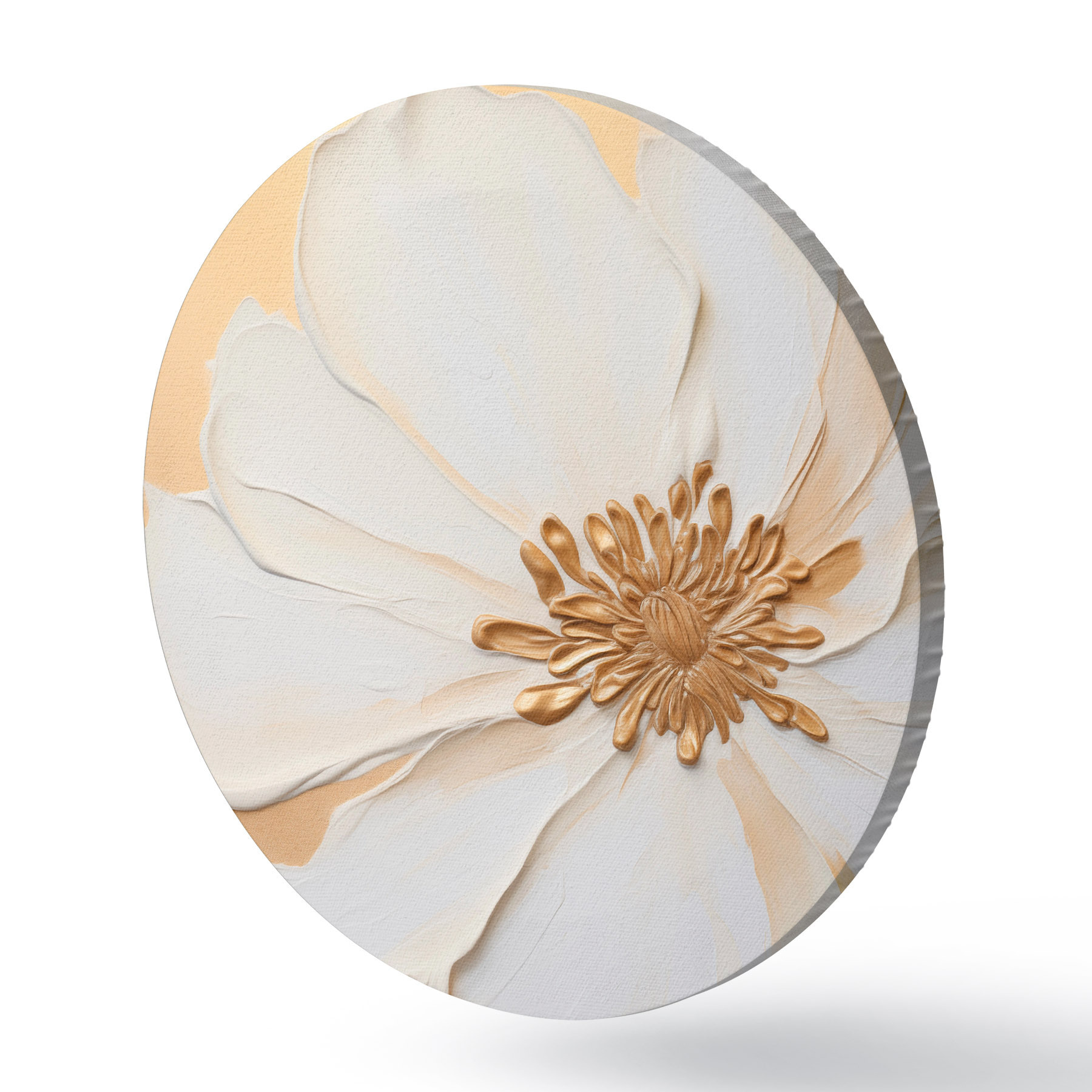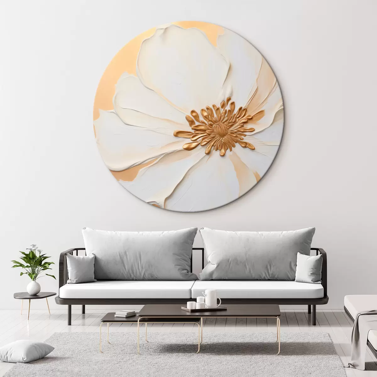 Runde Wandbilder Weiße Blume mit zarten Blütenblättern, imitiert durch dicke Pinselstriche, auf einem hellorangen, strukturierten Hintergrund. Nr r46691