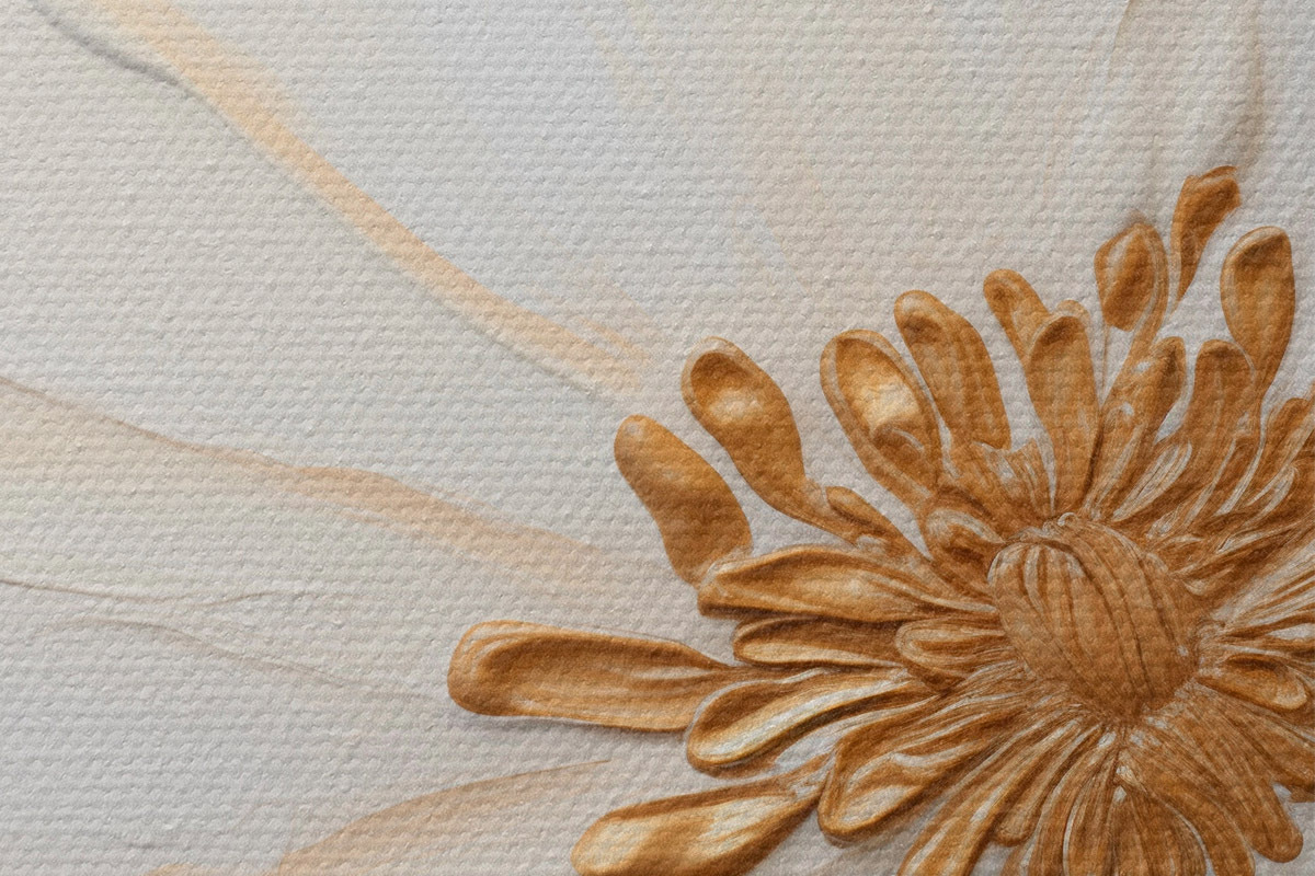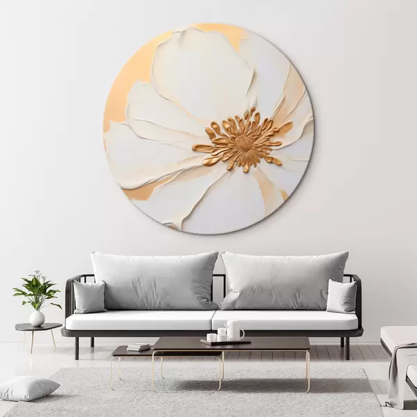 Runde Wandbilder Weiße Blume mit zarten Blütenblättern, imitiert durch dicke Pinselstriche, auf einem hellorangen, strukturierten Hintergrund. r46691
