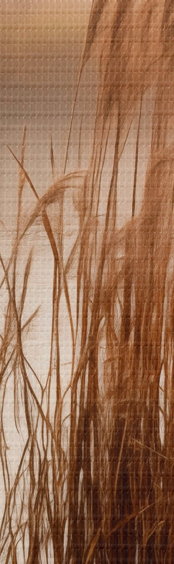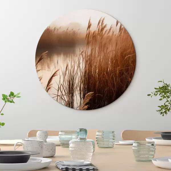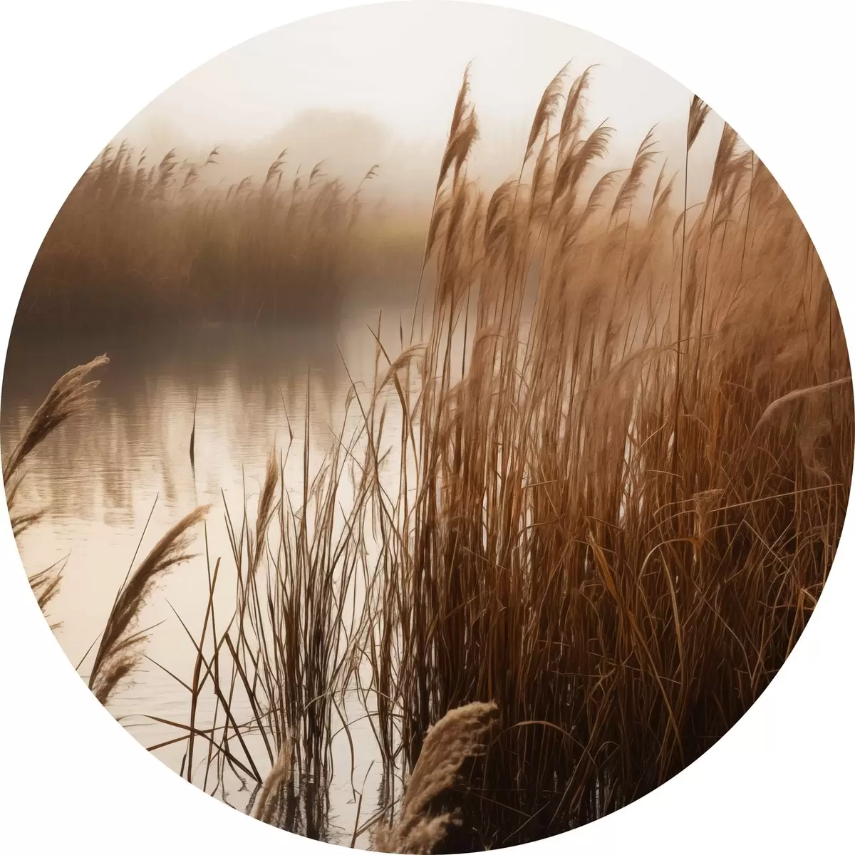 Runde Wandbilder Hohe Schilfpflanzen wachsen in einem Gewässer, das Wasser spiegelt die Schilfpflanzen wider, nebliger Hintergrund, sanftes Licht, Naturszene r46695