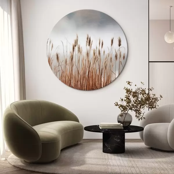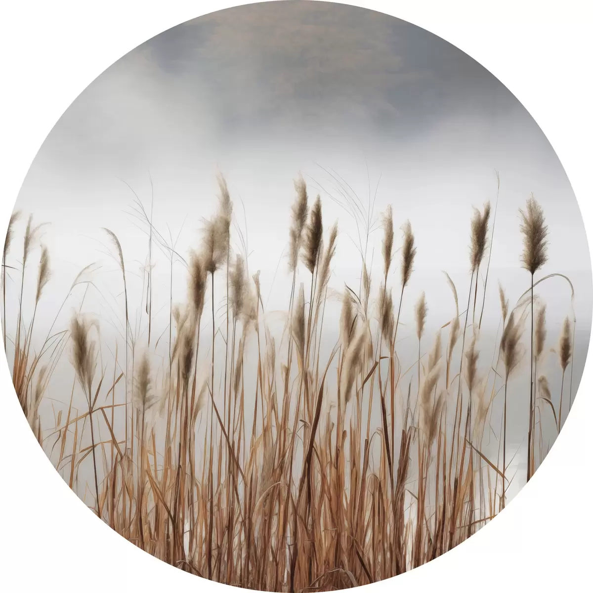 Runde Wandbilder Hohe Schilfpflanzen wachsen in einem Gewässer, das Wasser spiegelt die Schilfpflanzen wider, nebliger Hintergrund, sanftes Licht, Naturszene r46696