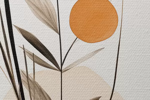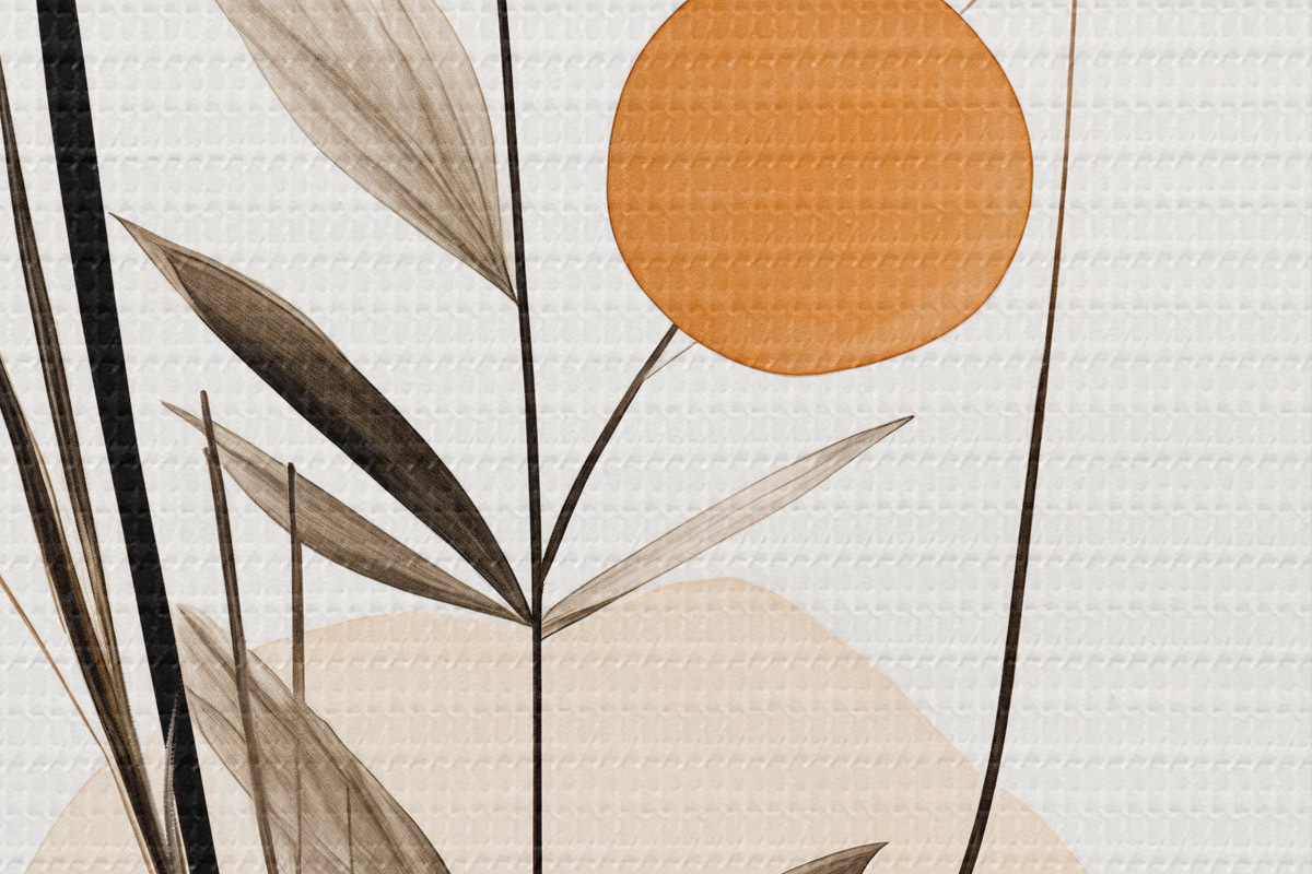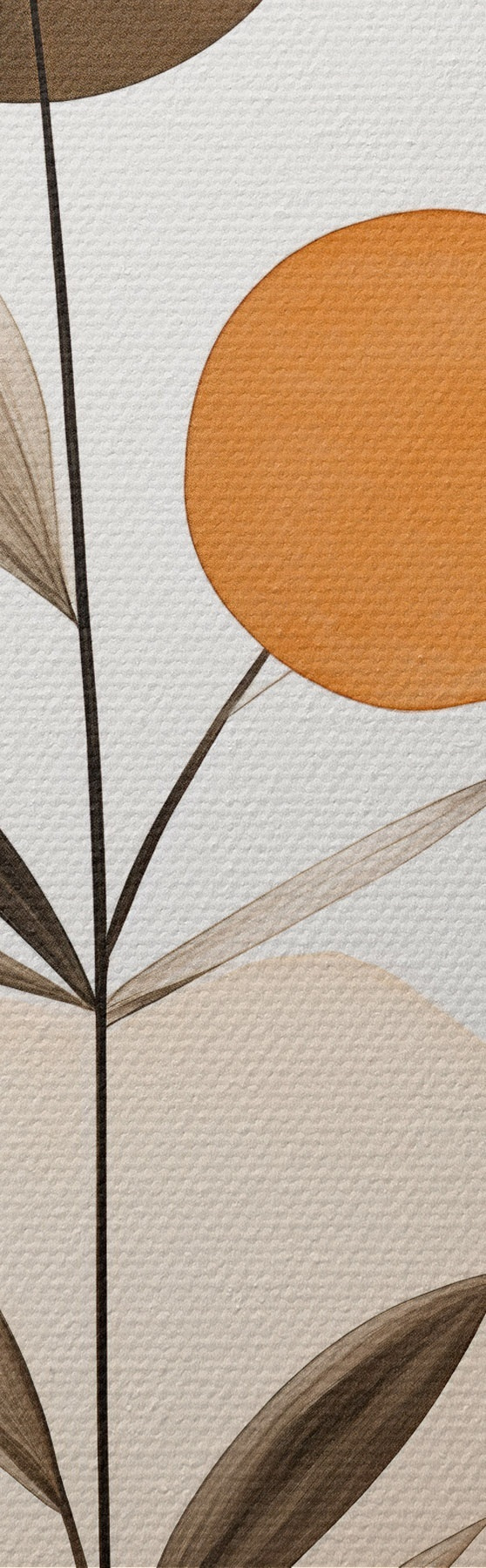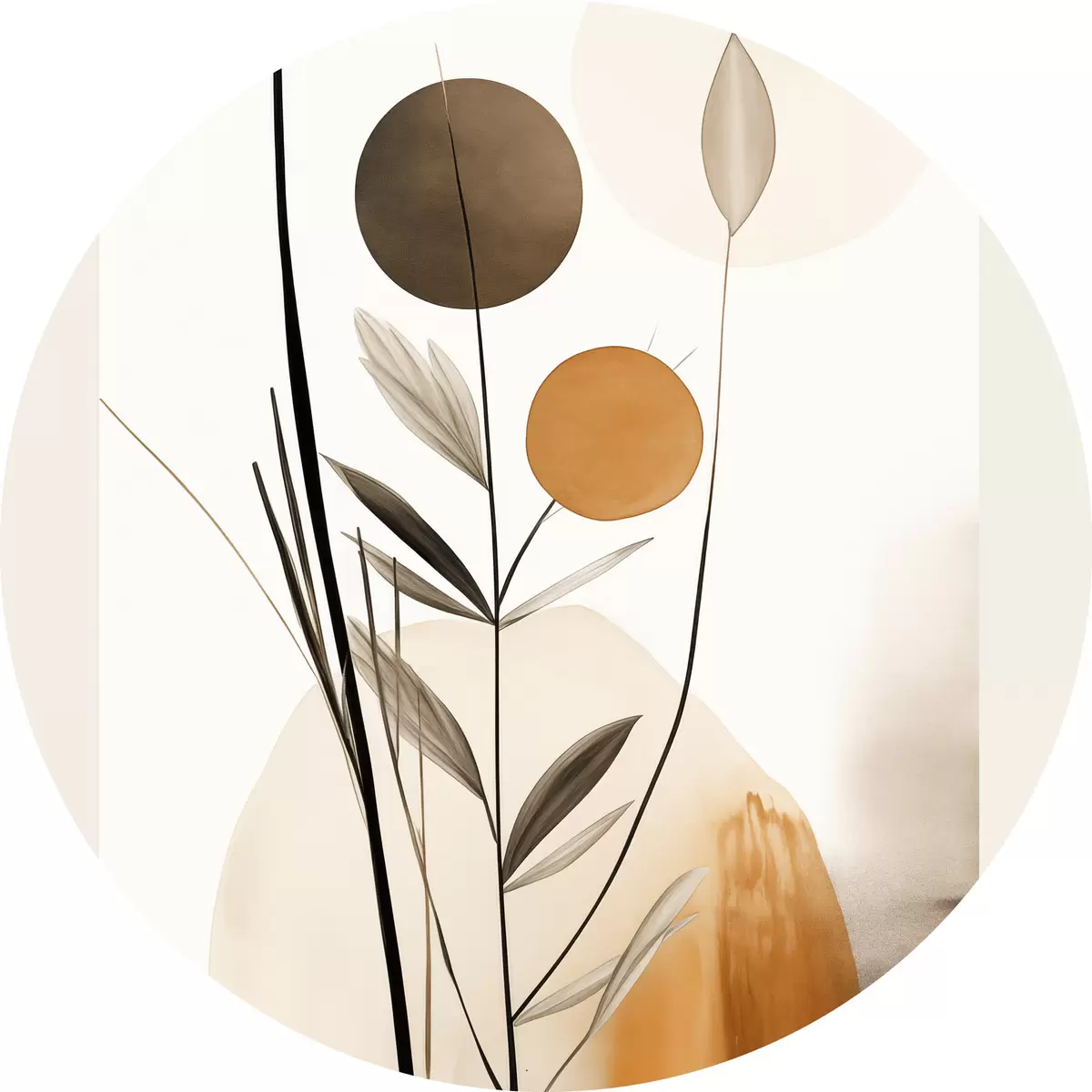 Runde Wandbilder Abstrakte Malerei-Imitation mit orangefarbenen und grauen Kreisen, Blättern und Zweigen, moderner Stil, Aquarelleffekt Nr r46698
