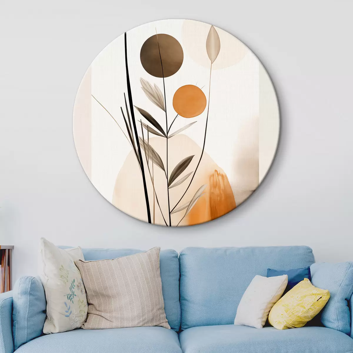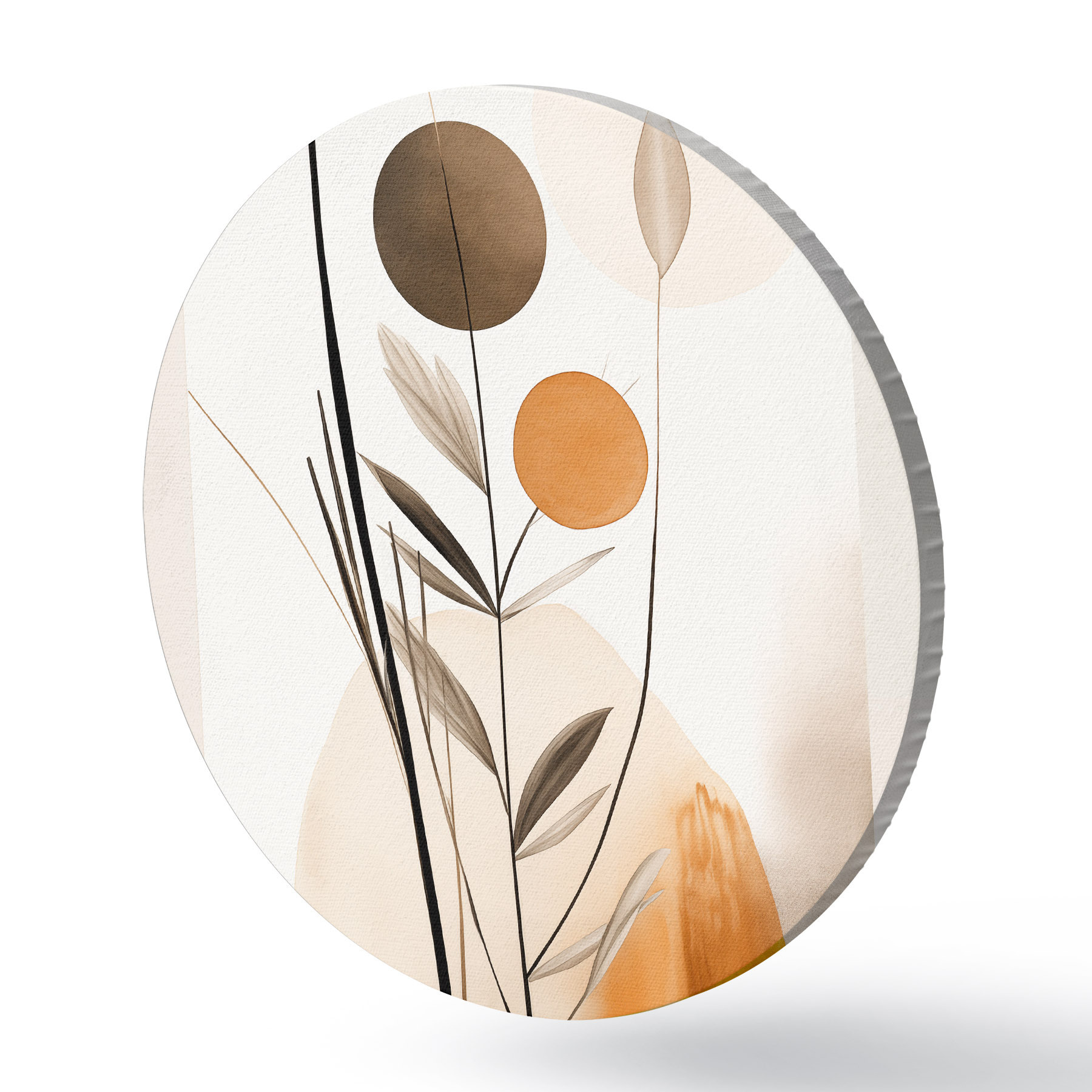 Runde Wandbilder Abstrakte Malerei-Imitation mit orangefarbenen und grauen Kreisen, Blättern und Zweigen, moderner Stil, Aquarelleffekt r46698