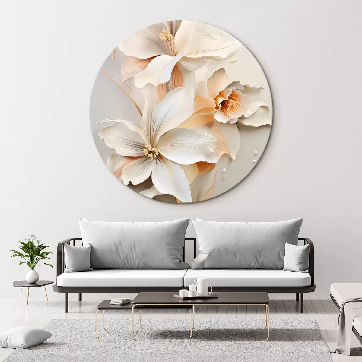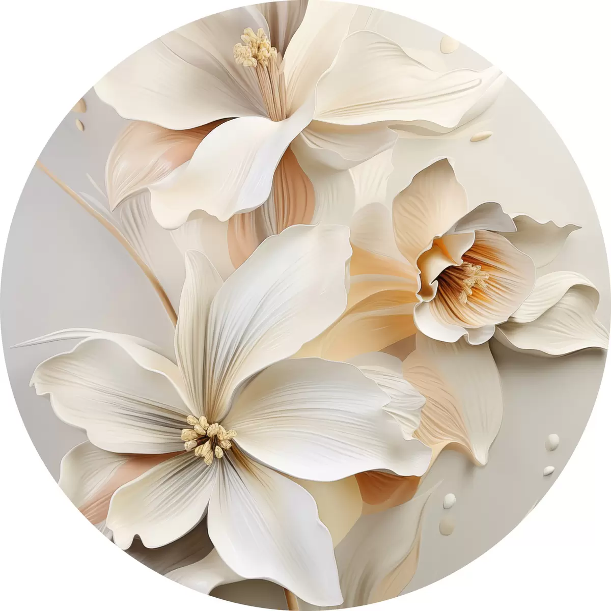 Runde Wandbilder Weiße Blumen, Blütenblätter mit sanften Schatten, hellbeiger Hintergrund, elegante Komposition, minimalistischer Stil r46699