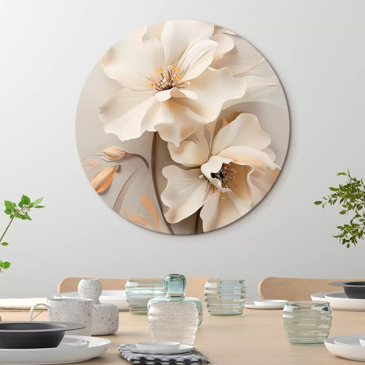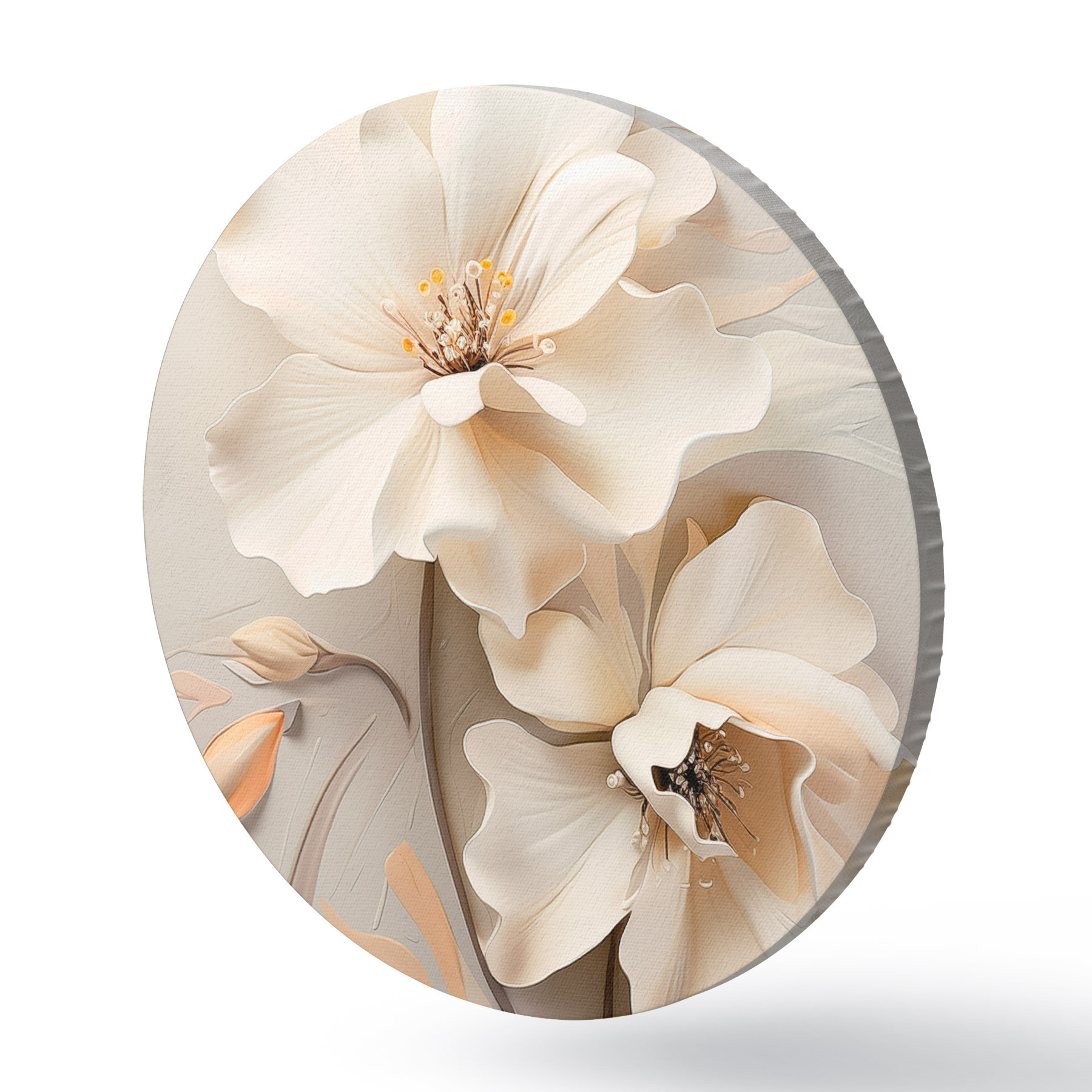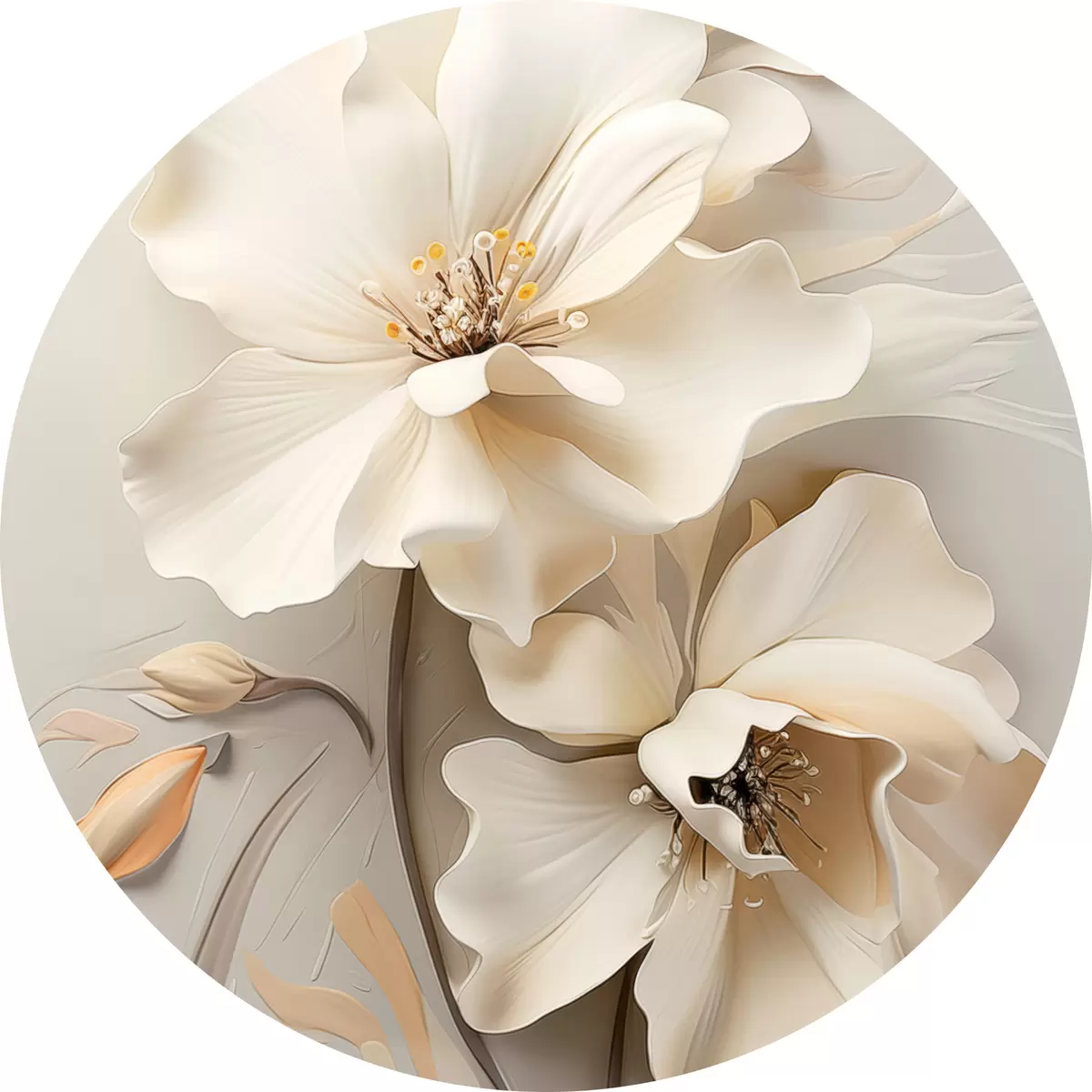 Runde Wandbilder Weiße Blumen, Blütenblätter mit sanften Schatten, hellbeiger Hintergrund, elegante Komposition, minimalistischer Stil r46700