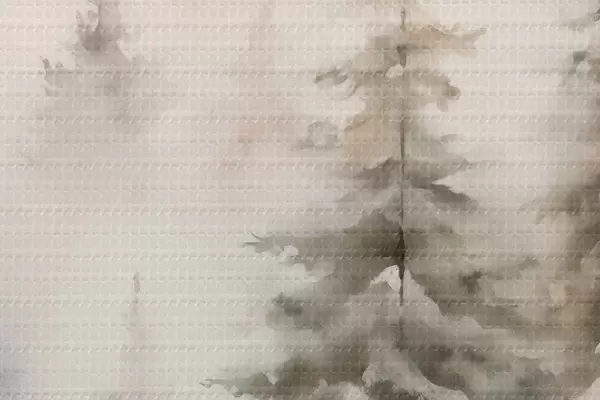 Runde Wandbilder Hohe, schneebedeckte Kiefern stehen in einem nebligen Wald, eine sanfte, gedämpfte Winterszene. r46701