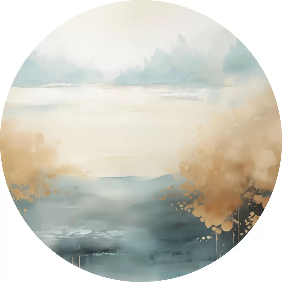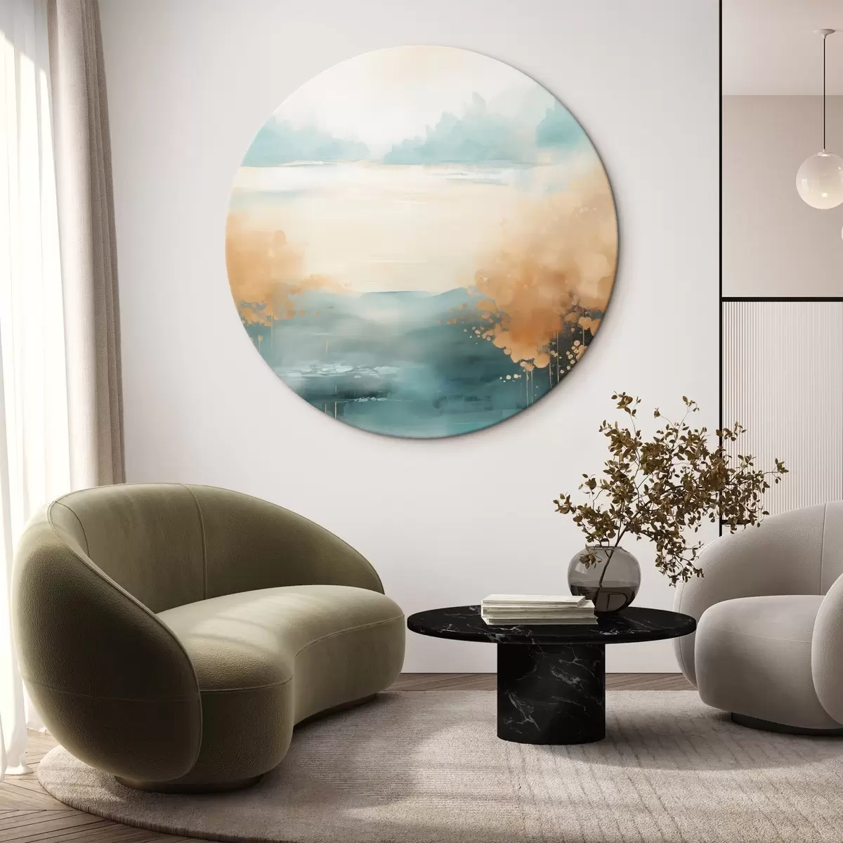 Runde Wandbilder Abstrakte Landschaft mit Bergen und See in Blaugrün und strukturiertem Gelb, weiche Pinselstriche, minimalistisches Kunstwerk Nr r46704