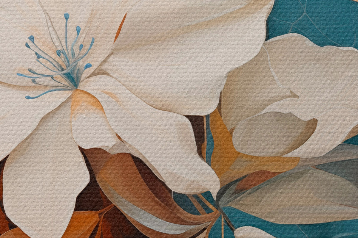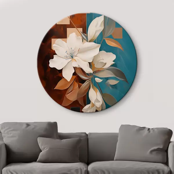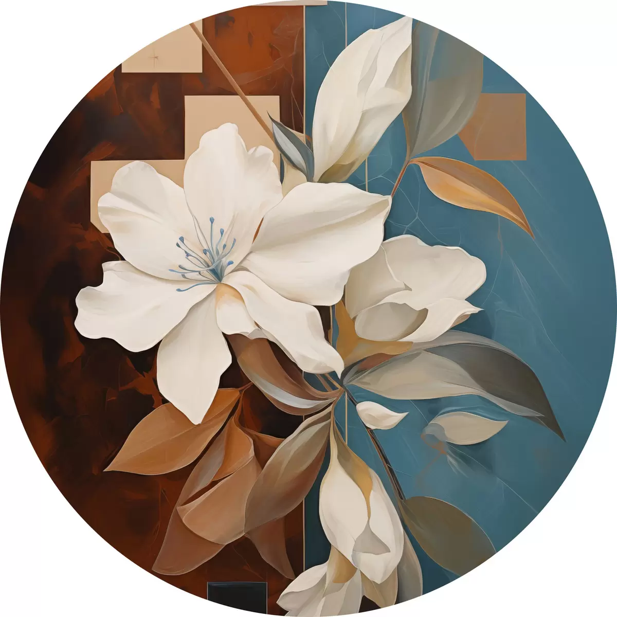 Runde Wandbilder Abstrakte weiße Blumen und Blätter vor einem Hintergrund aus Braun und Blau mit abstrakten Formen, in minimalistischem Stil Nr r46709