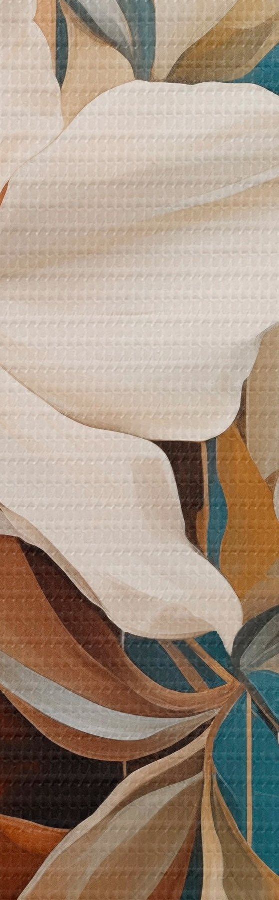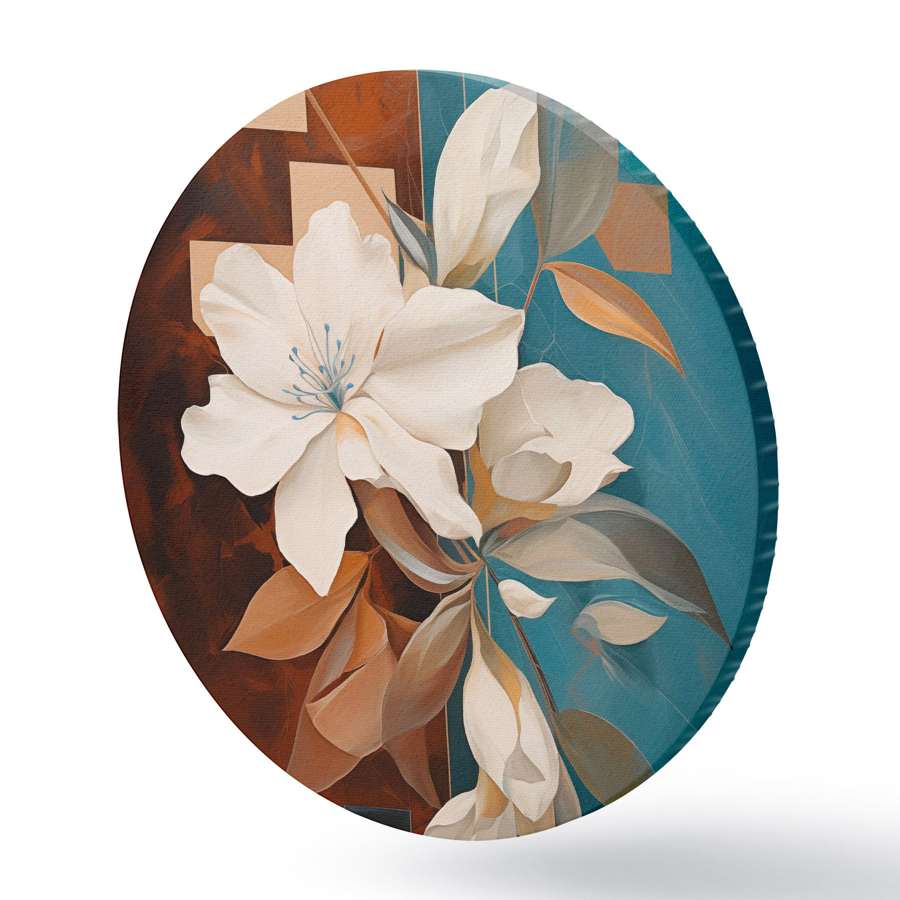 Runde Wandbilder Abstrakte weiße Blumen und Blätter vor einem Hintergrund aus Braun und Blau mit abstrakten Formen, in minimalistischem Stil r46709