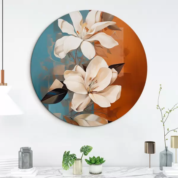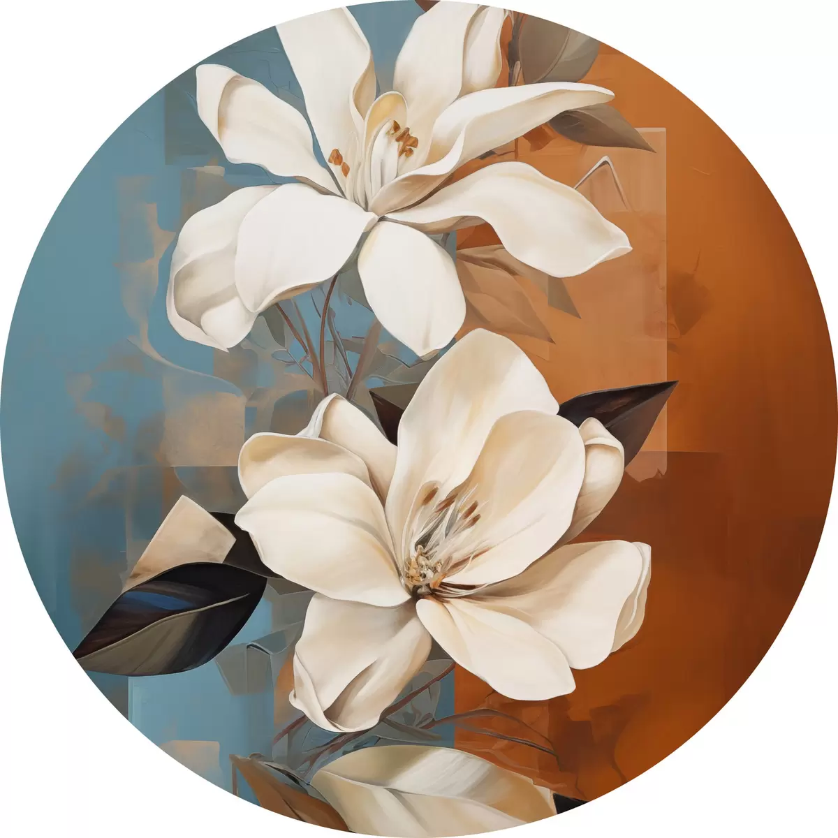 Runde Wandbilder Abstrakte weiße Blumen und Blätter vor einem Hintergrund aus Braun und Blau mit abstrakten Formen, in minimalistischem Stil Nr r46710