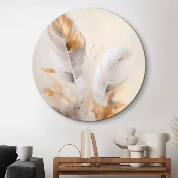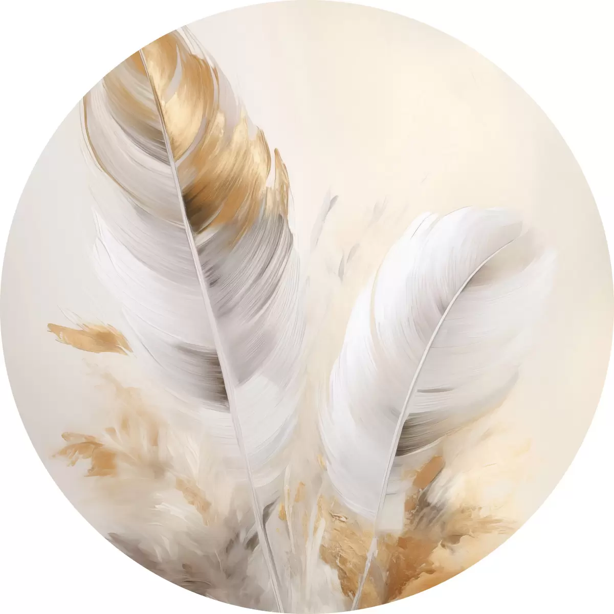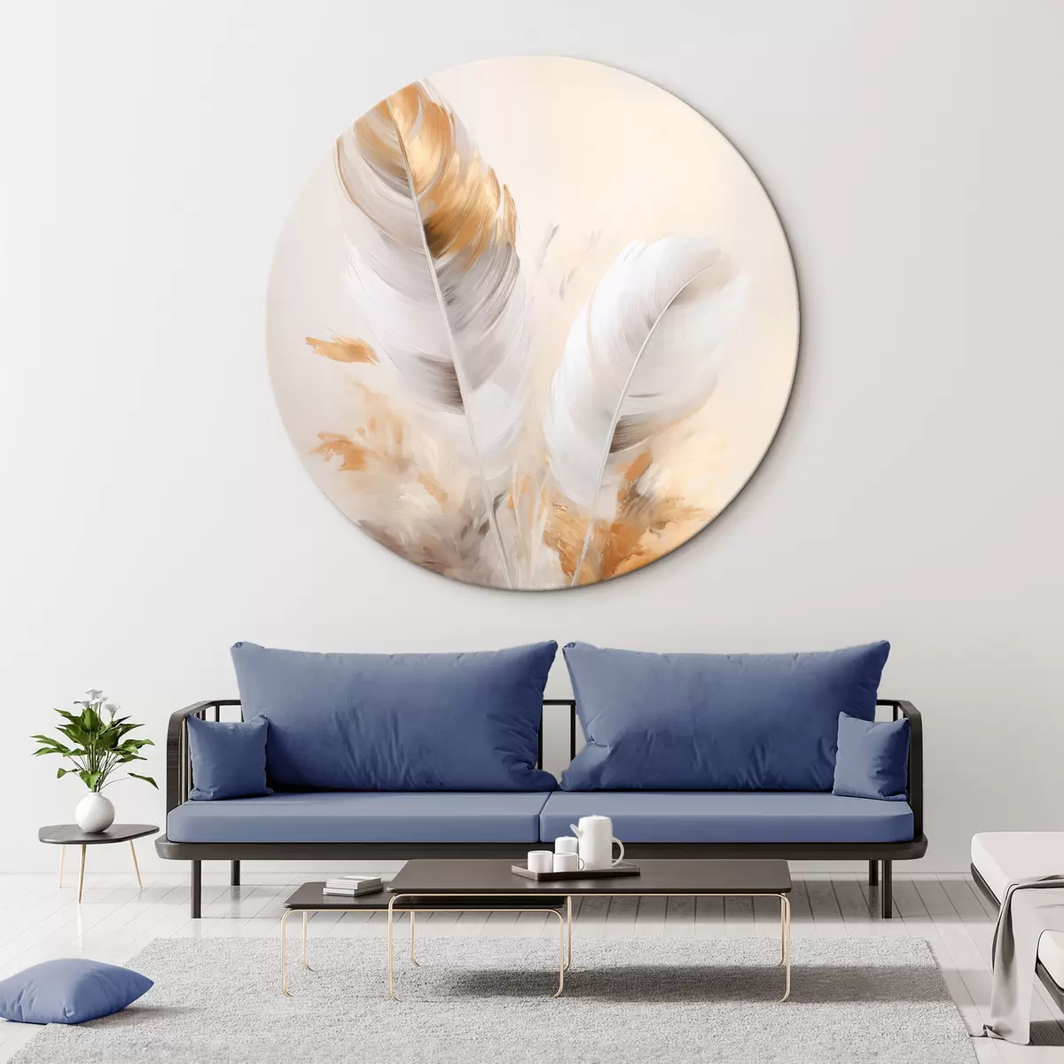 Runde Wandbilder Abstrakte Federn, umgeben von beigen und braunen Federn, weich und zart, auf hellbeigem Hintergrund Nr r46711