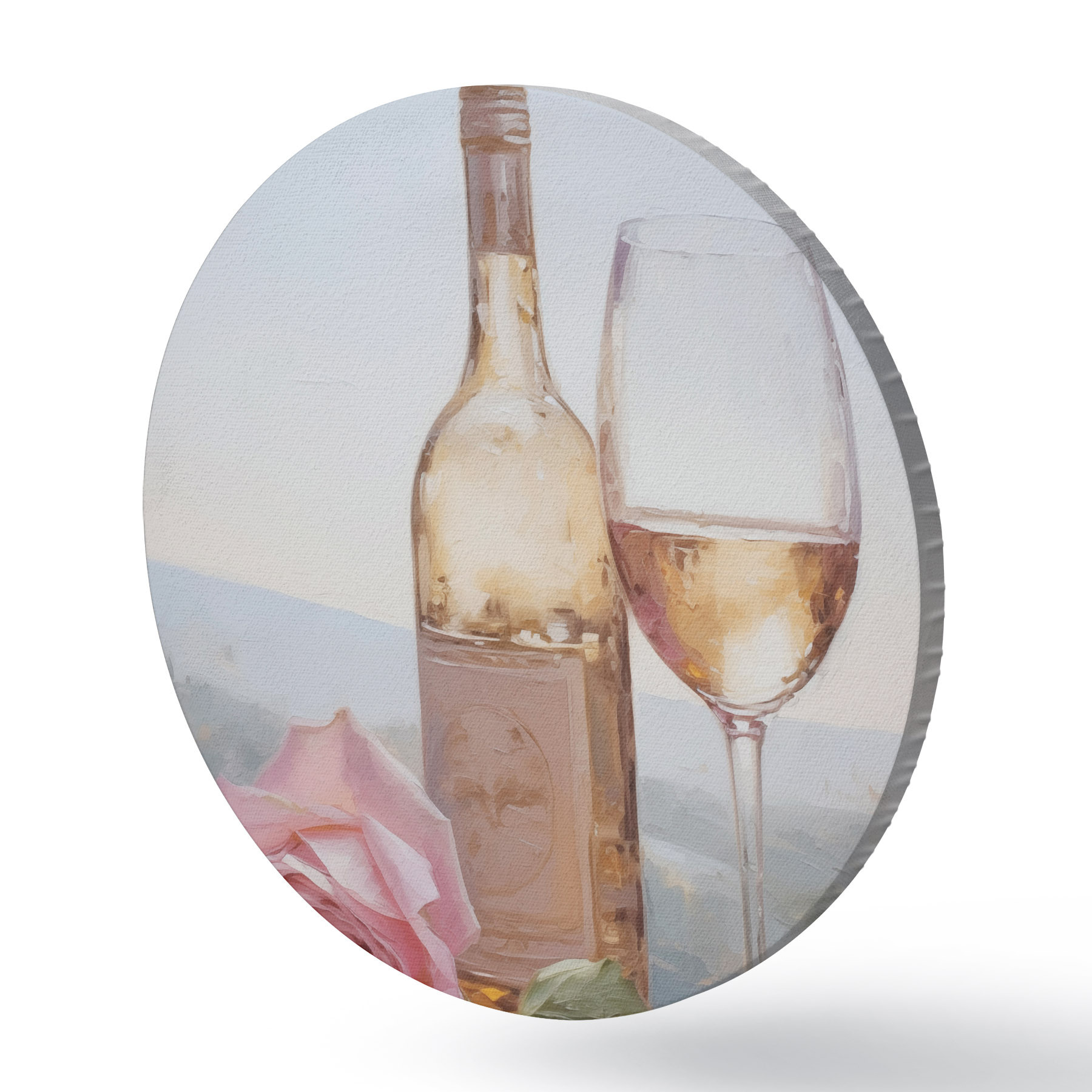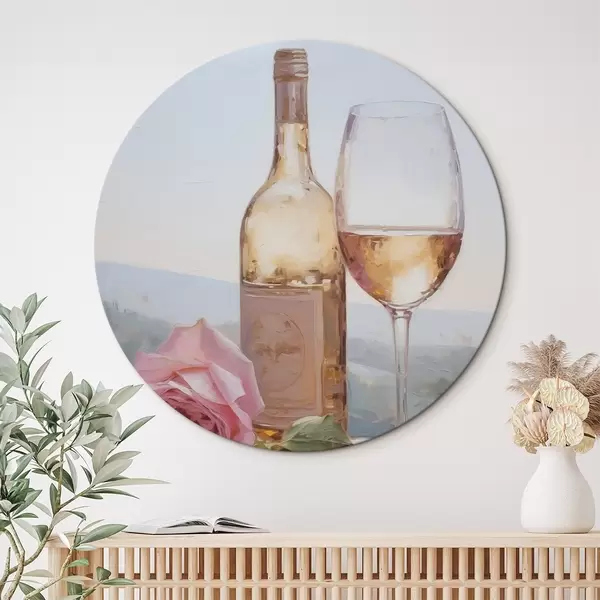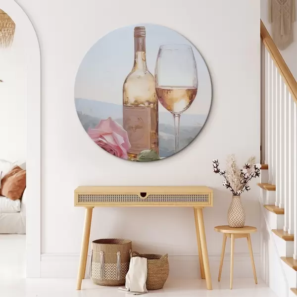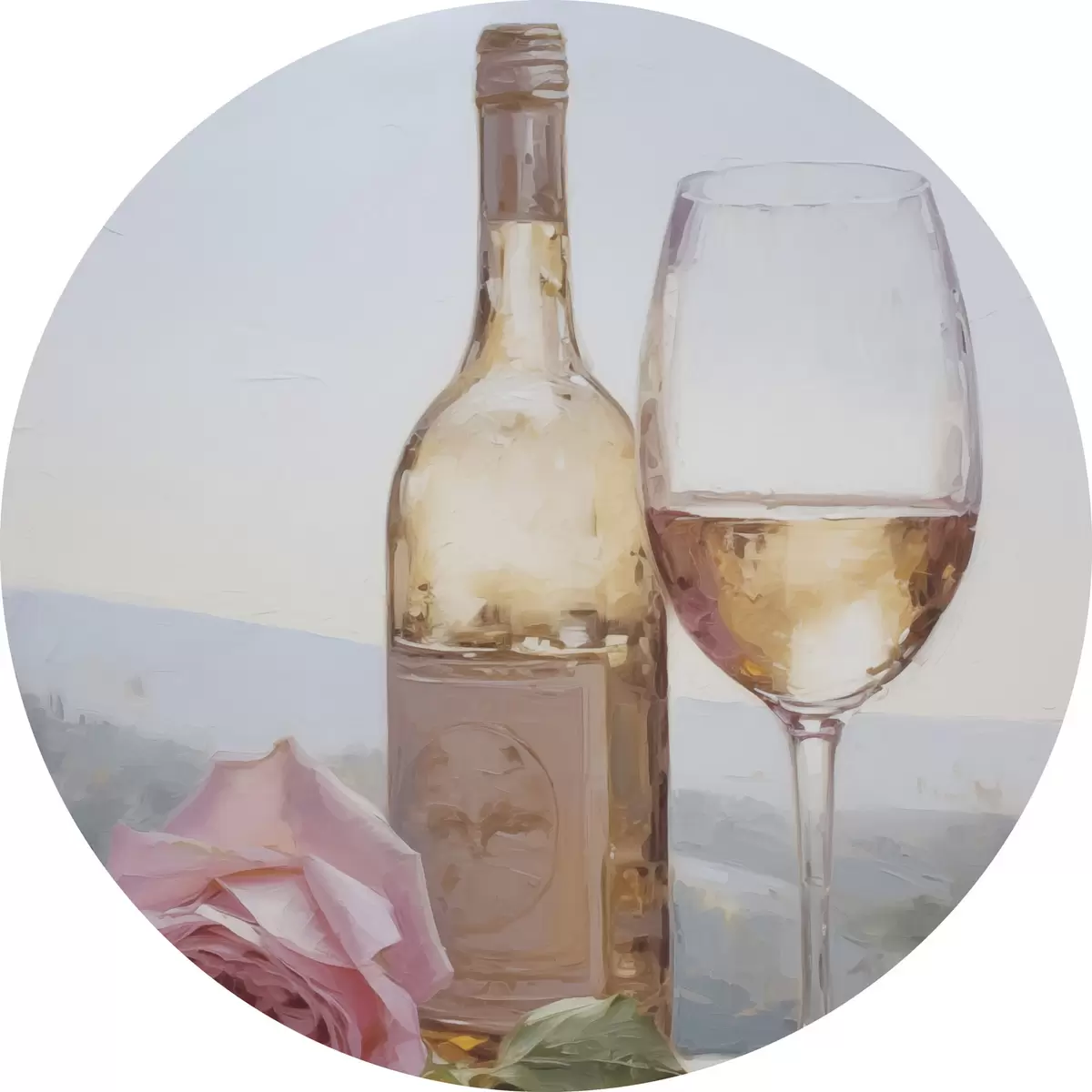 Runde Wandbilder Eine Flasche und ein Glas Wein und ein kleiner Hund mit Brille, Gemäldeimitation Nr r46721