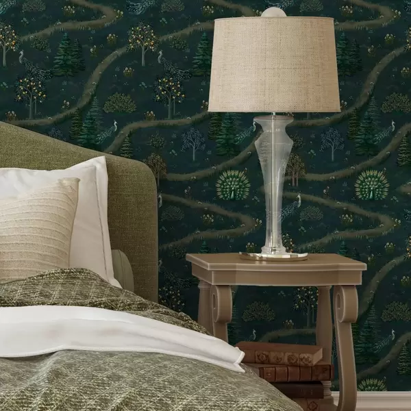 Tapete Gewundener Pfad mit Pfauen und Zitronenbäumen auf dunklem Hintergrund Nr. a00041v1