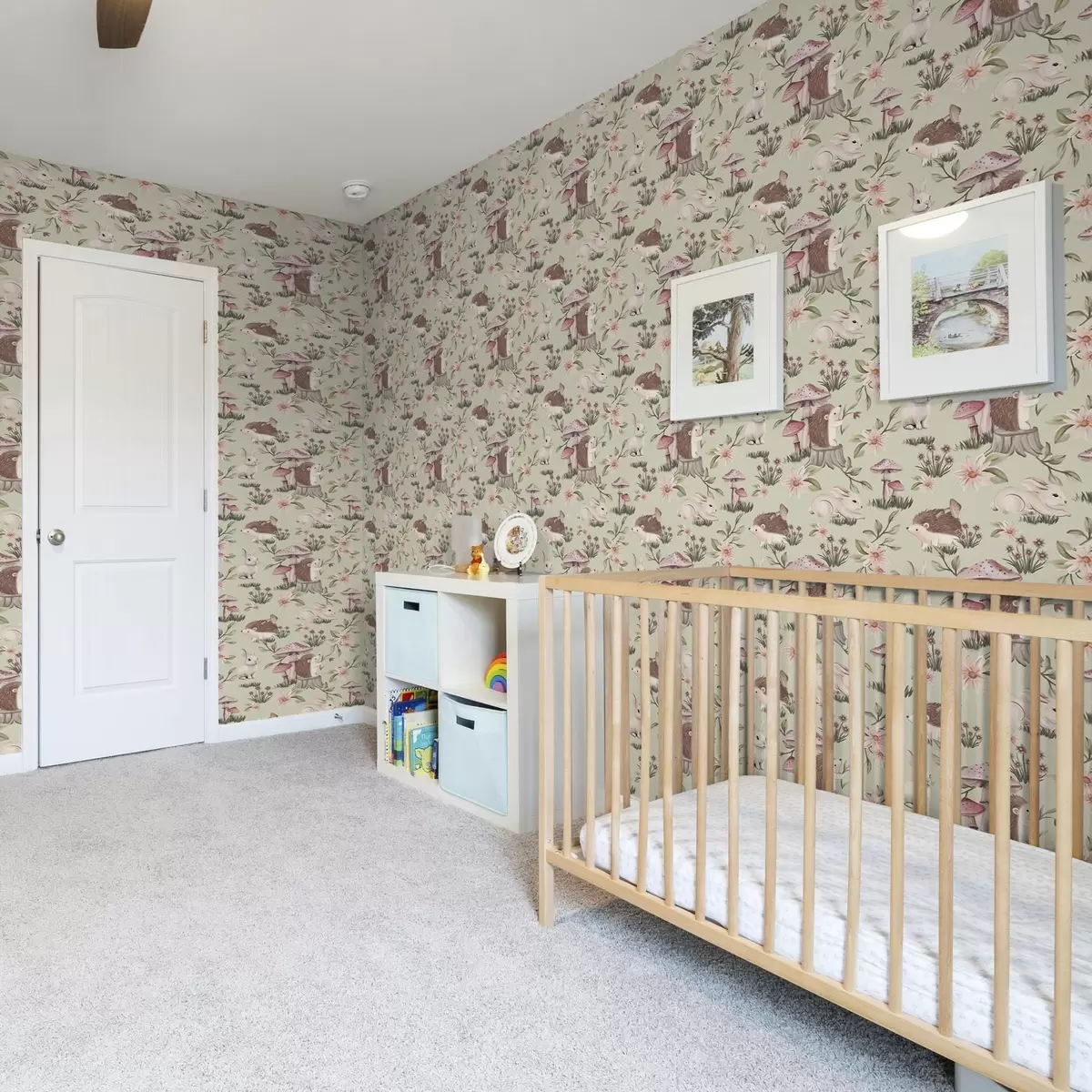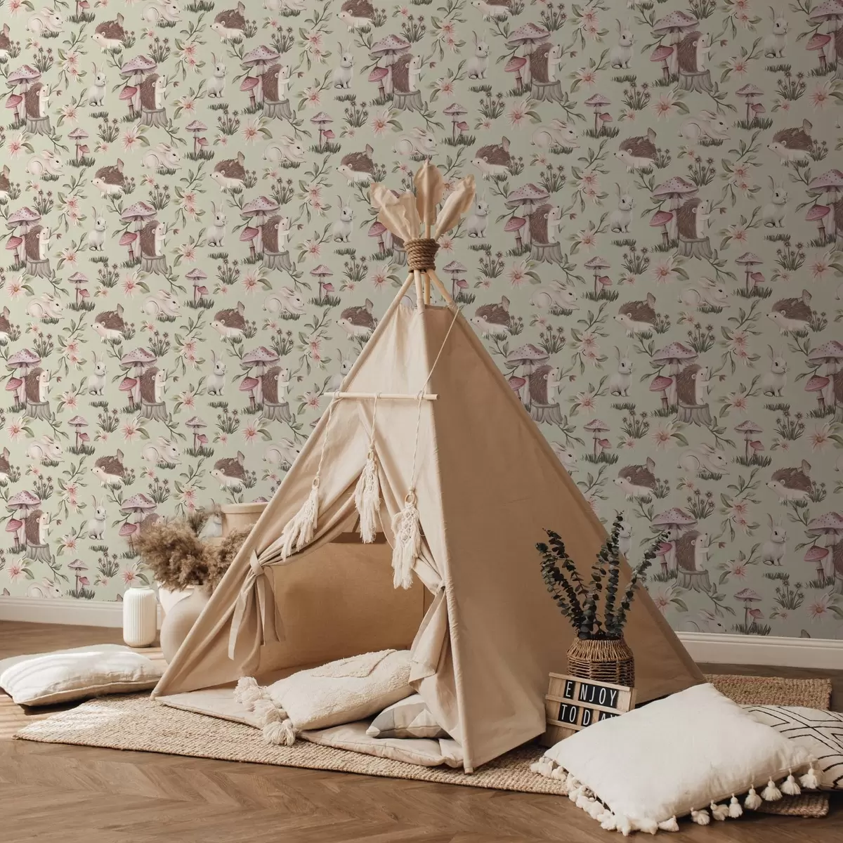 Tapete Märchentiere und Blumen auf grünem Hintergrund in zarten Pastellfarben Nr. a00111v1