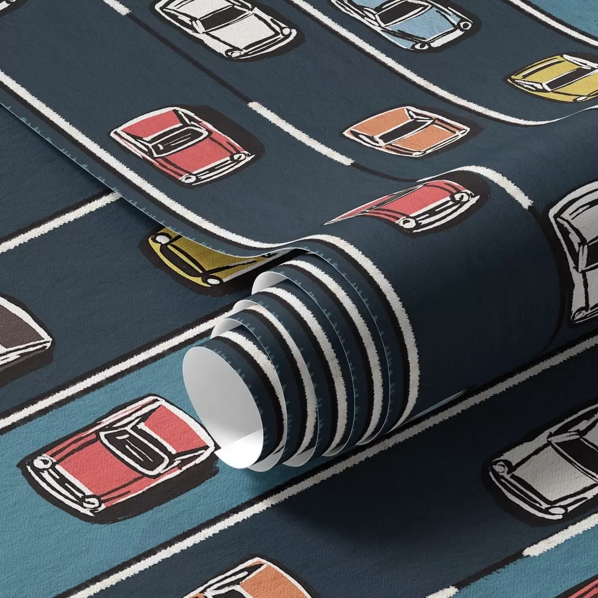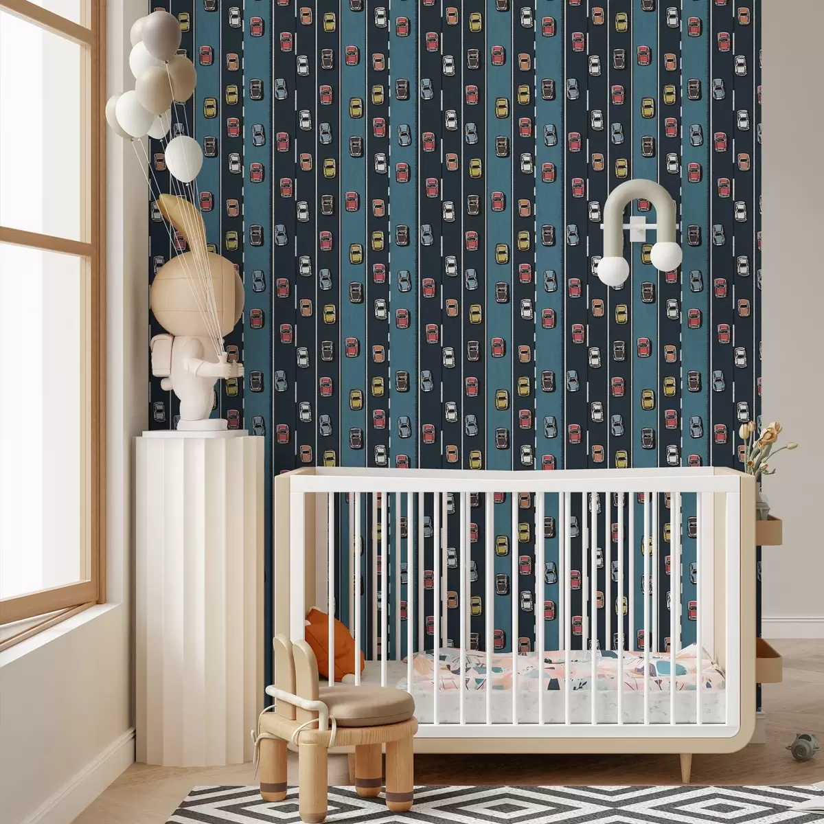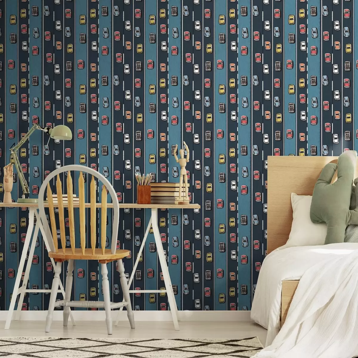 Tapete Retro-Auto auf marineblauer Straße im Stil der 60er Jahre Nr. a00118