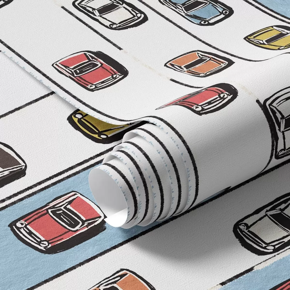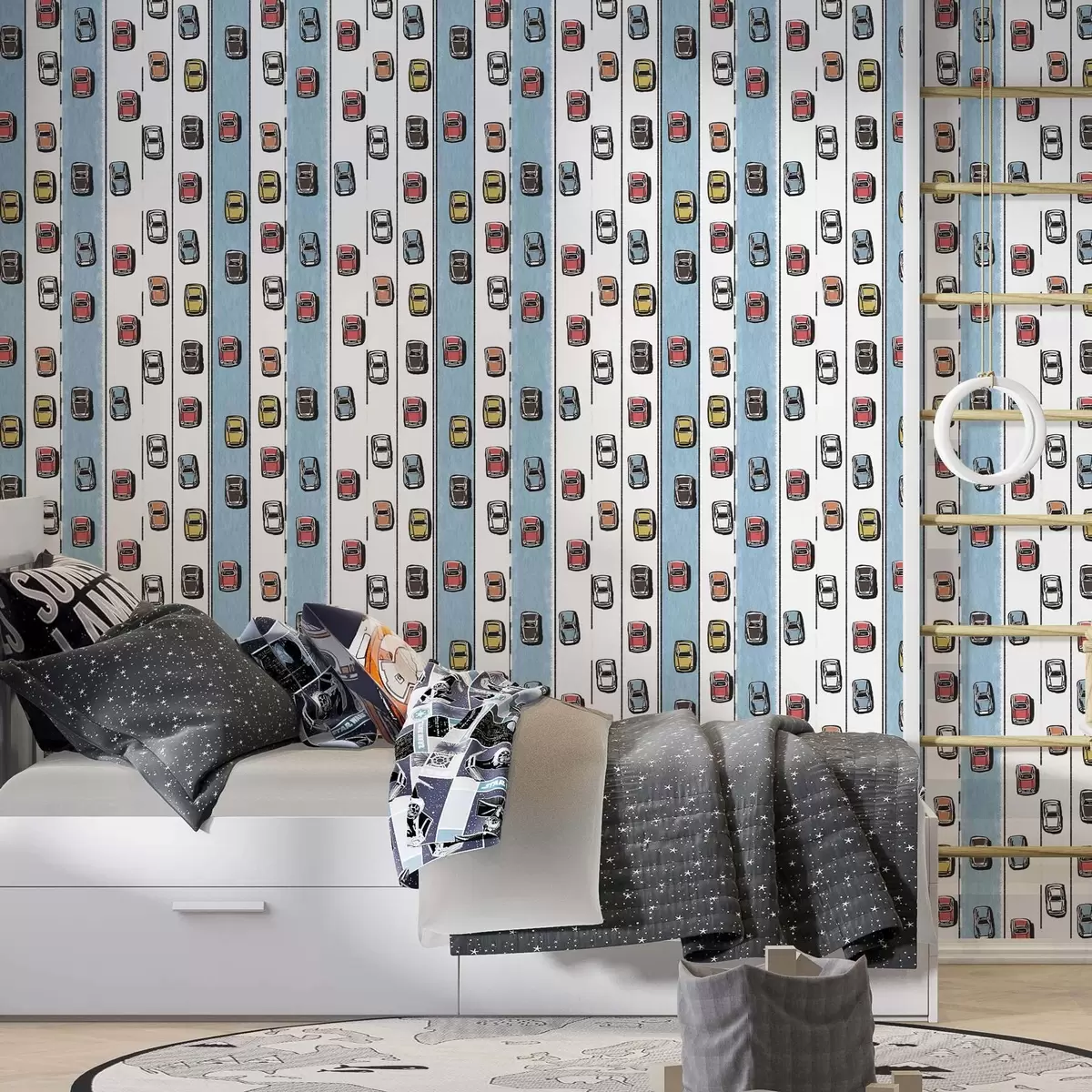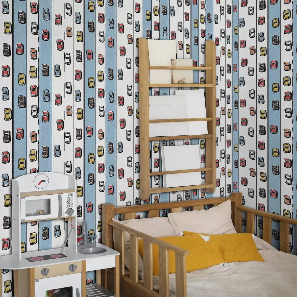 Tapete Retro-Auto auf einer weiß-blauen Straße im Stil der 60er Jahre Nr. a00118v2