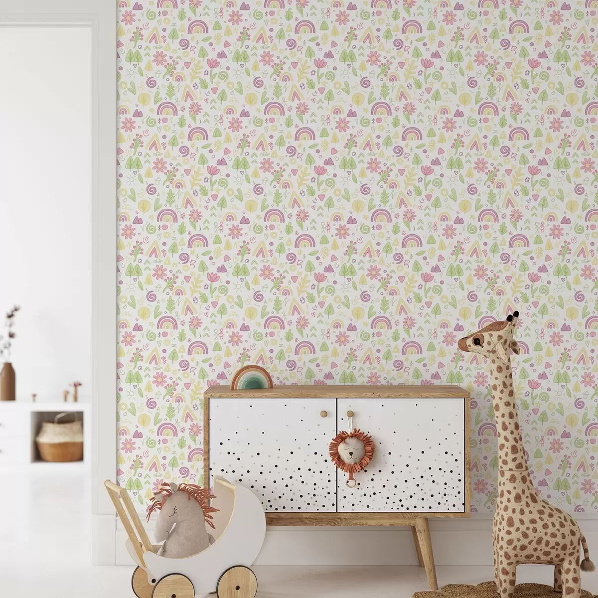 Tapete Kinderzeichnung mit Regenbögen, Blumen und Bäumen Nr. a00296