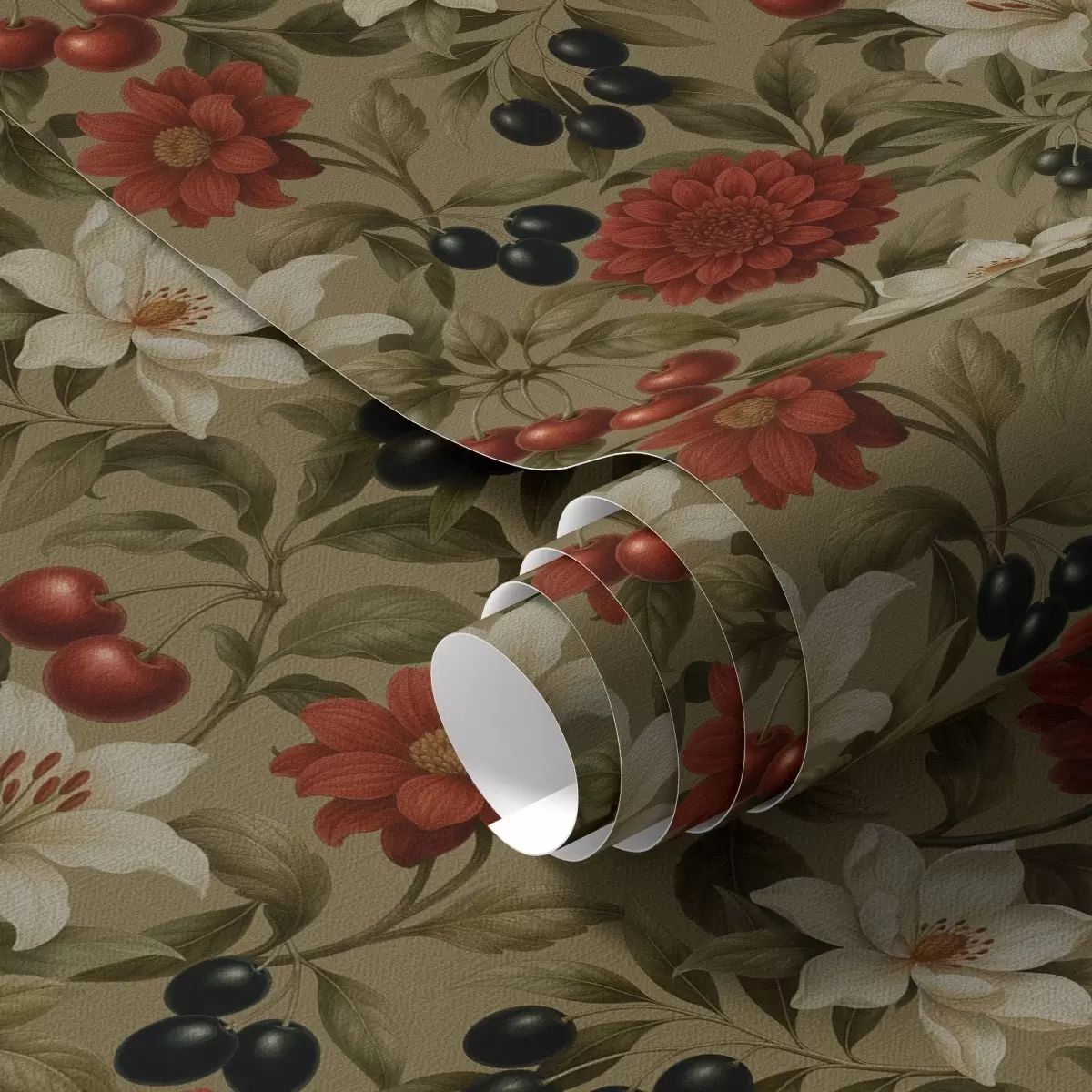 Tapete Kirschen, Blumen und schwarze Oliven Nr. a00384