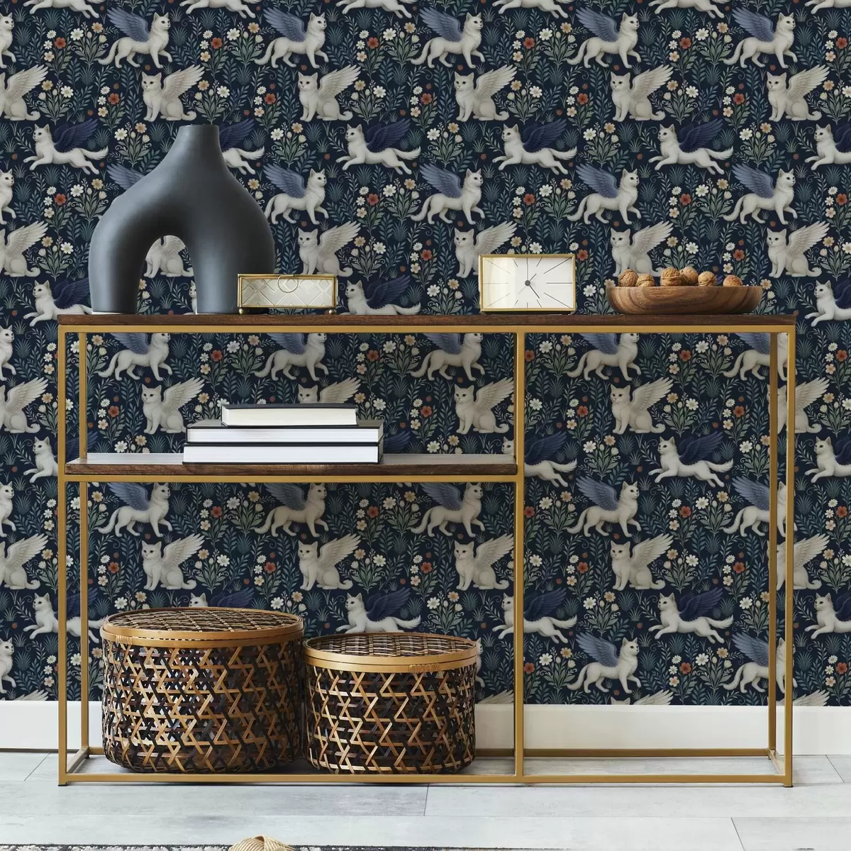 Tapete Fantasiekatzen mit Flügeln zwischen Blumen Nr. a00408