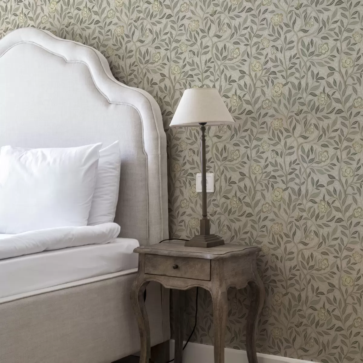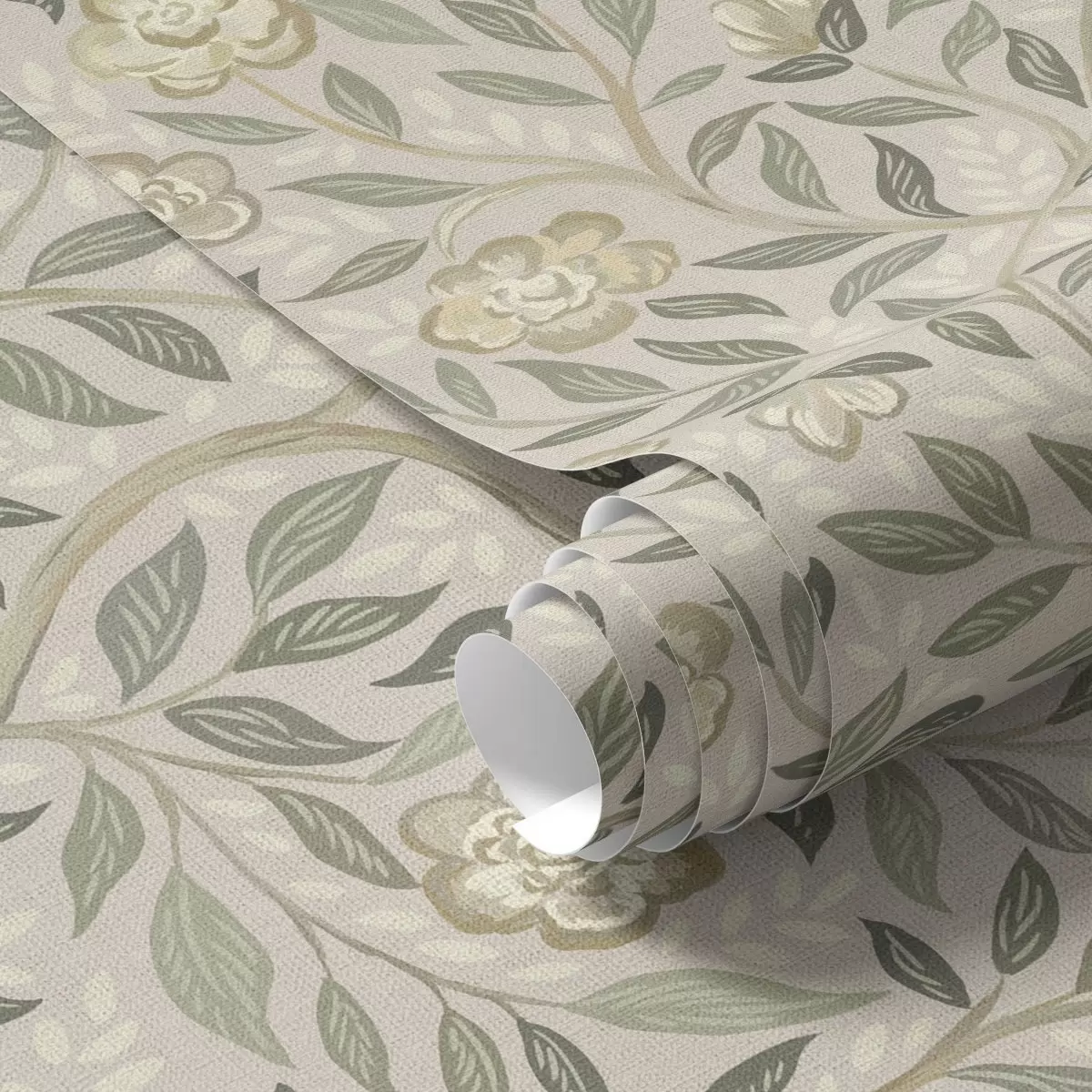 Tapete Cremefarbene Rosen und Olivenblätter auf staubigem rosa Hintergrund Nr. a00455