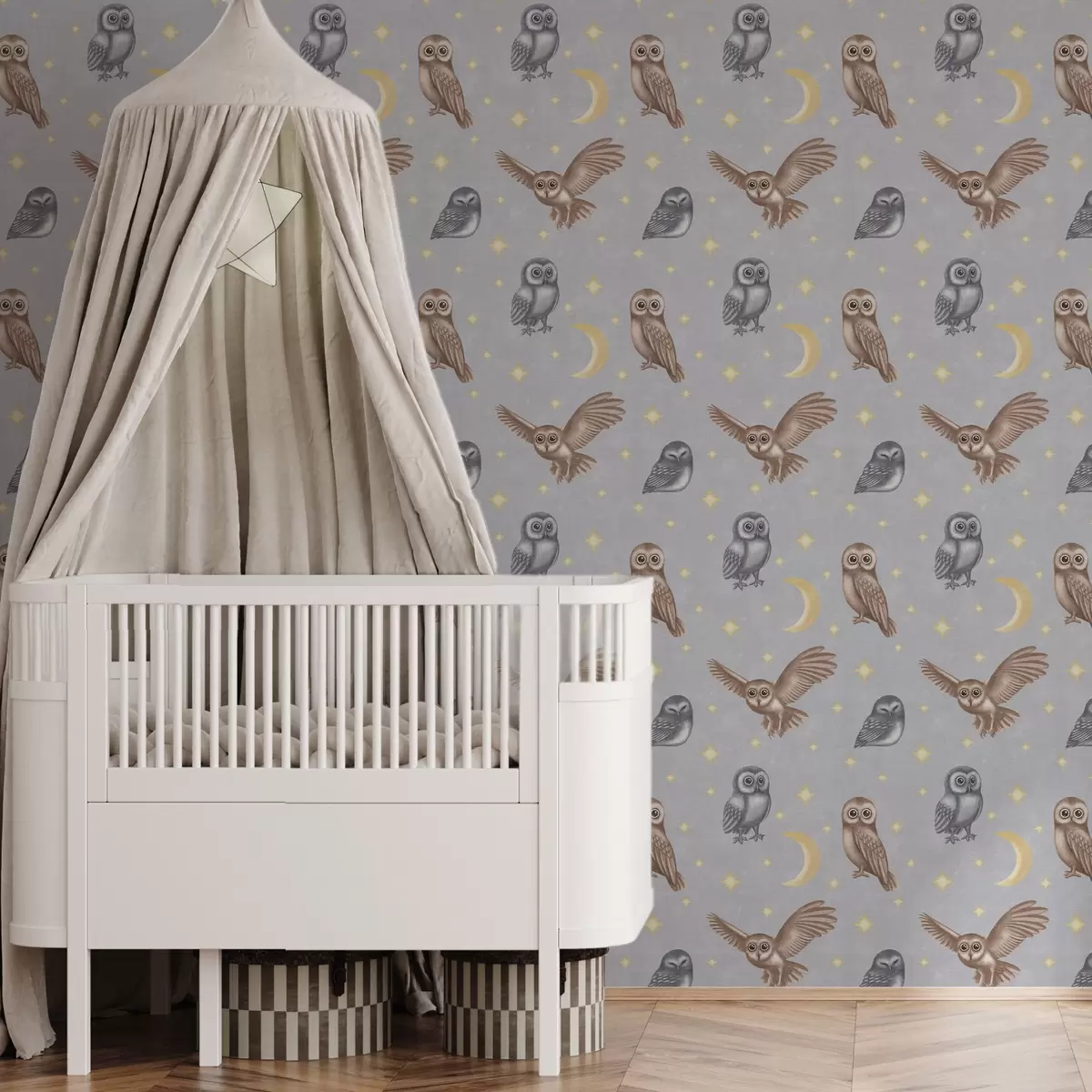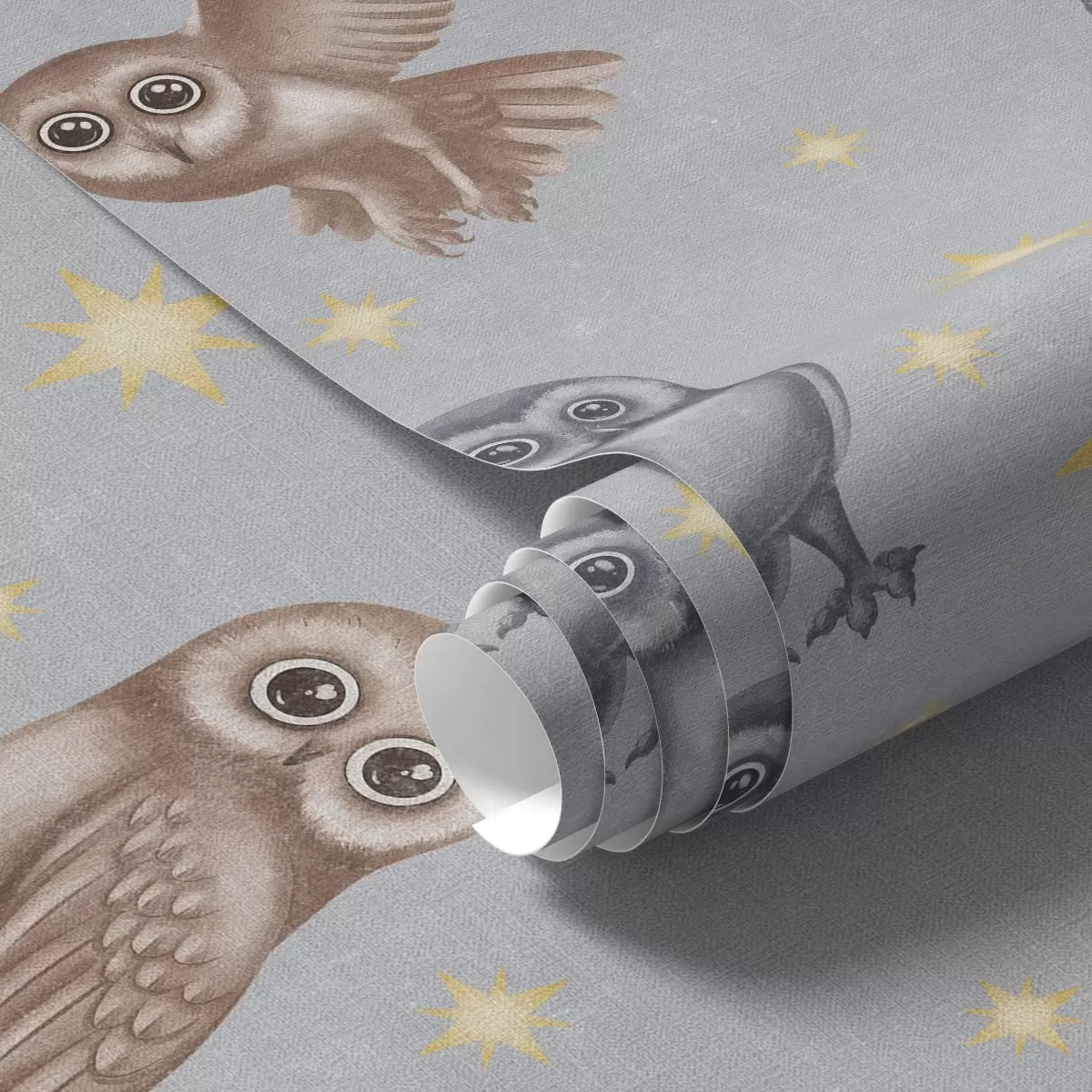 Tapete Eulen und Sterne auf einem grauen Nachthimmel Hintergrund Nr. a00475